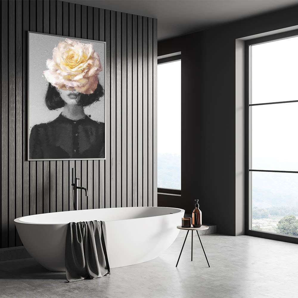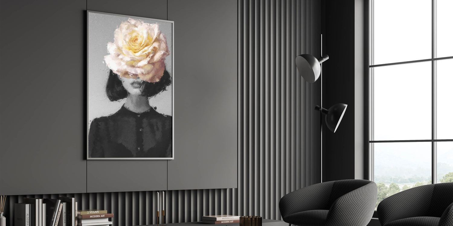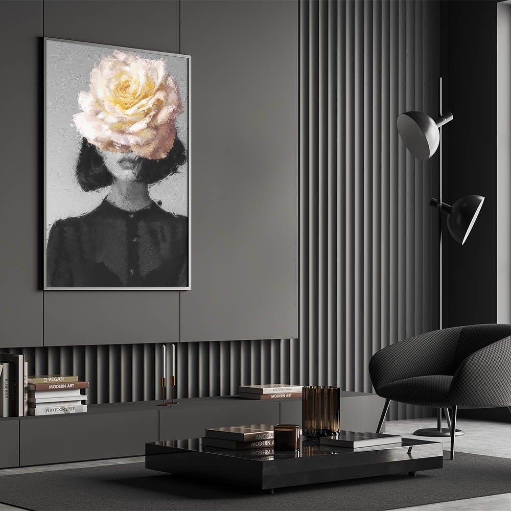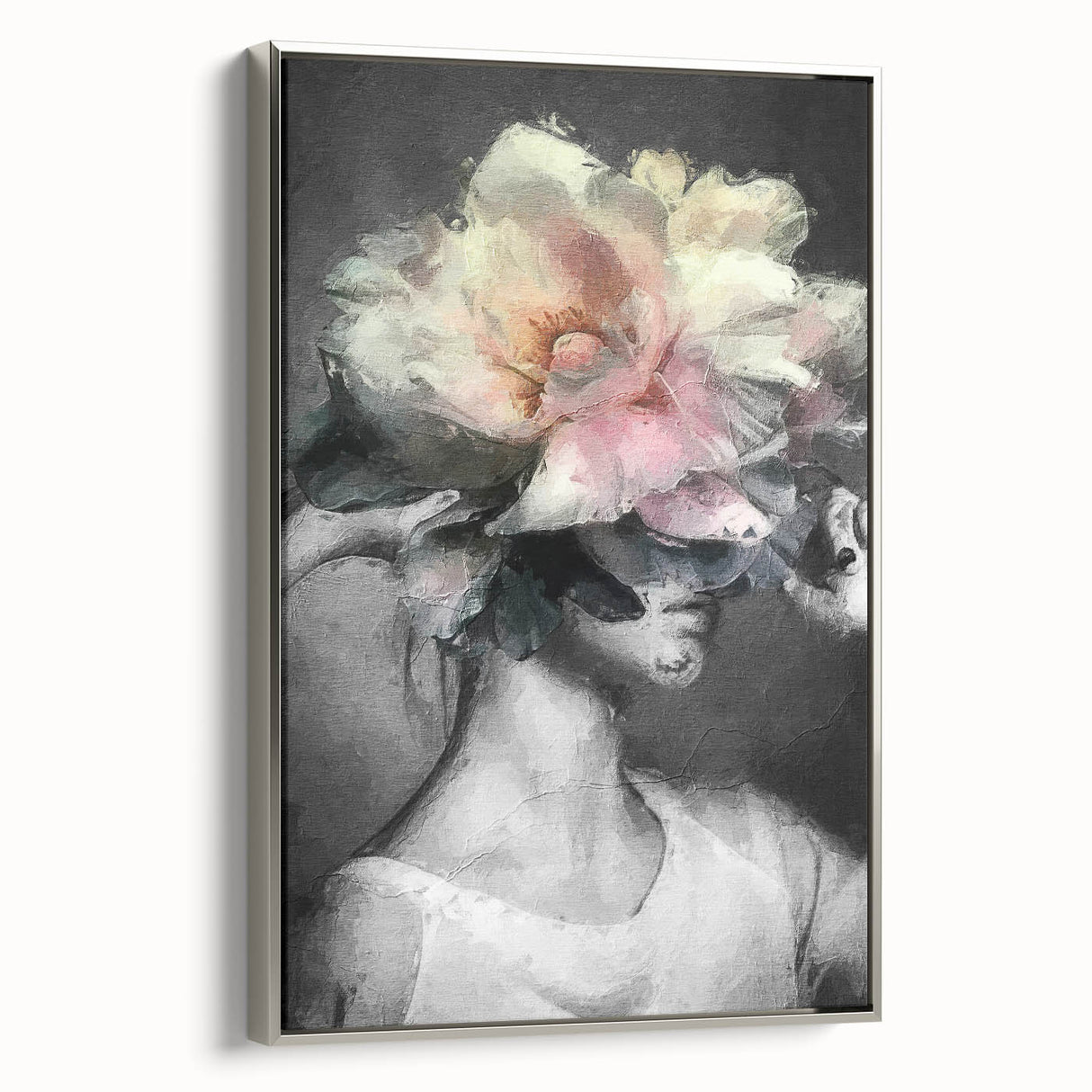 Add a touch of elegance and charm to your decor with this Modern Figurative Wall Art, featuring a captivating blend of abstract human form and delicate floral design. The central motif showcases soft petals in shades of pink, cream, and green, radiating a sense of tranquility and beauty. Complemented by a muted gray background, this artwork exudes sophistication and modernity.