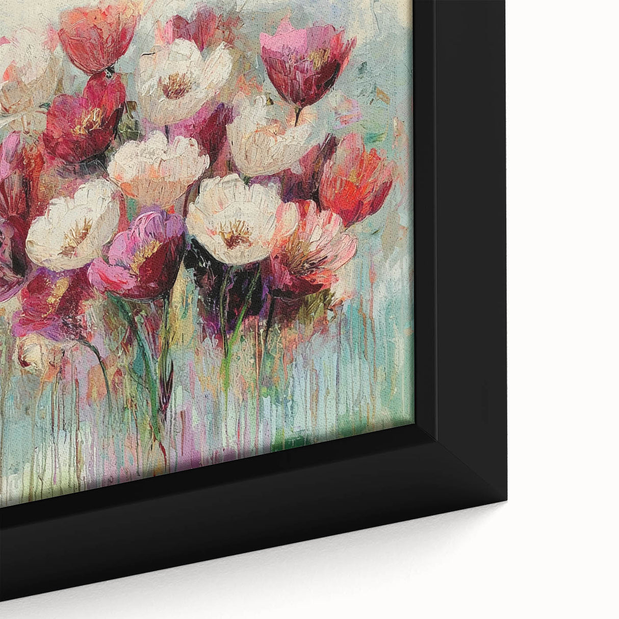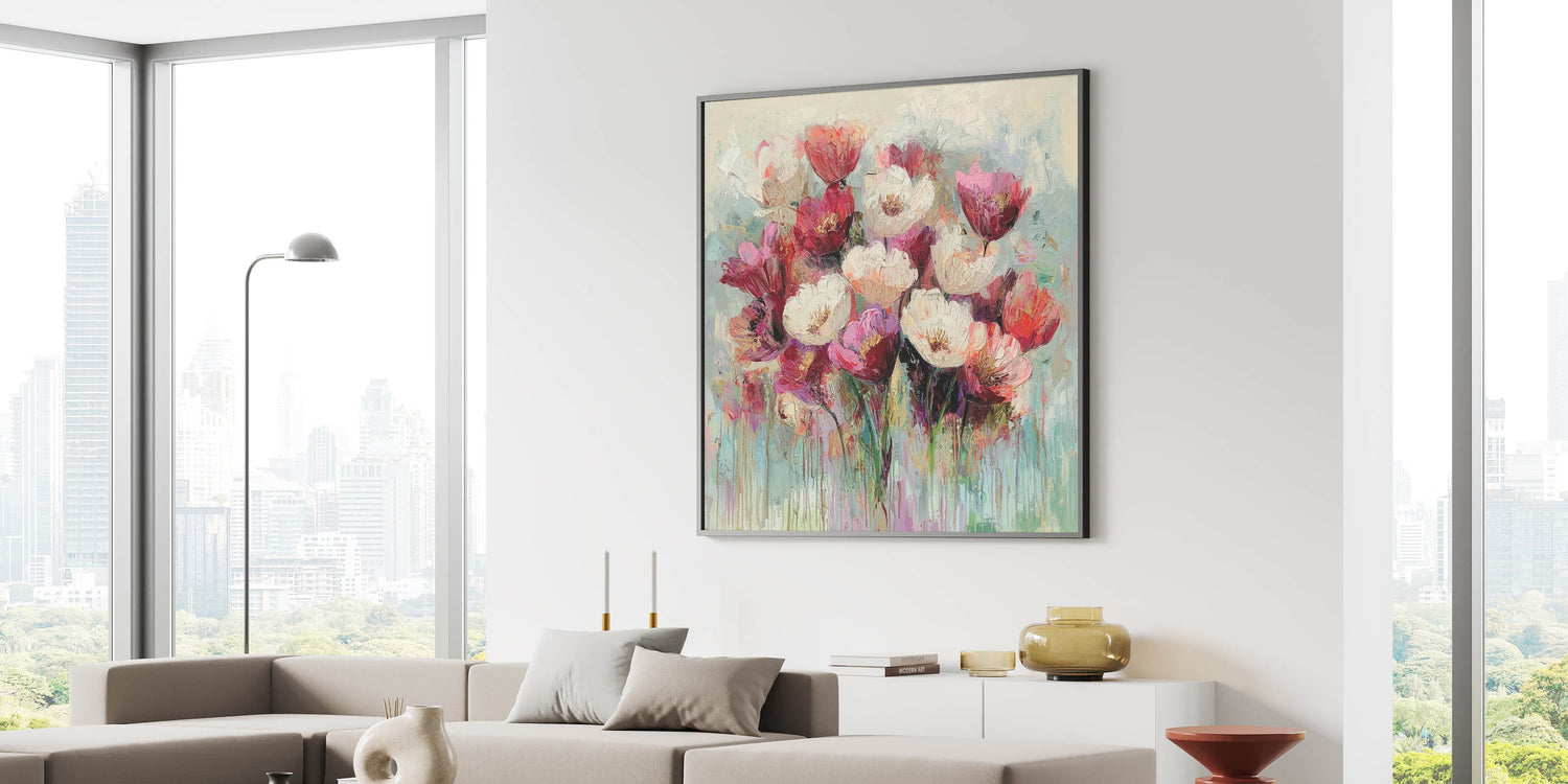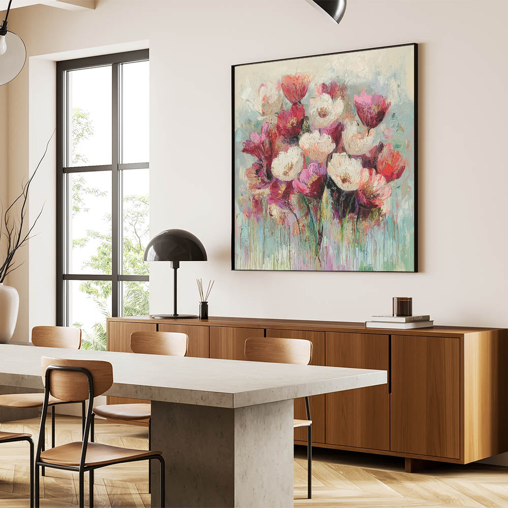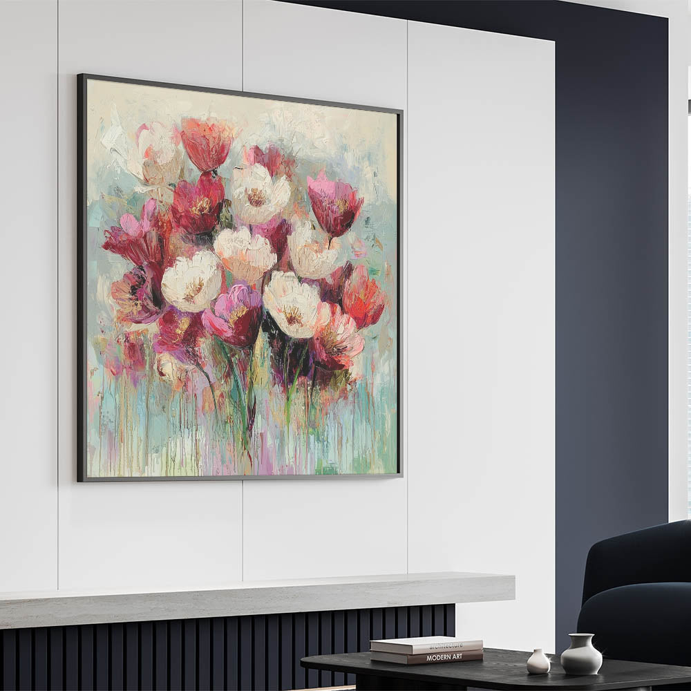 Transform your living space with this vibrant abstract floral artwork. Bursting with an array of soft creams, deep burgundies, and blush pinks, this design captures the delicate beauty of blooming flowers in an artistic and contemporary style. The expressive brushstrokes and splashes of color blend seamlessly, evoking a sense of nature's charm while maintaining a modern aesthetic.