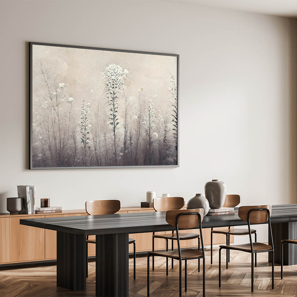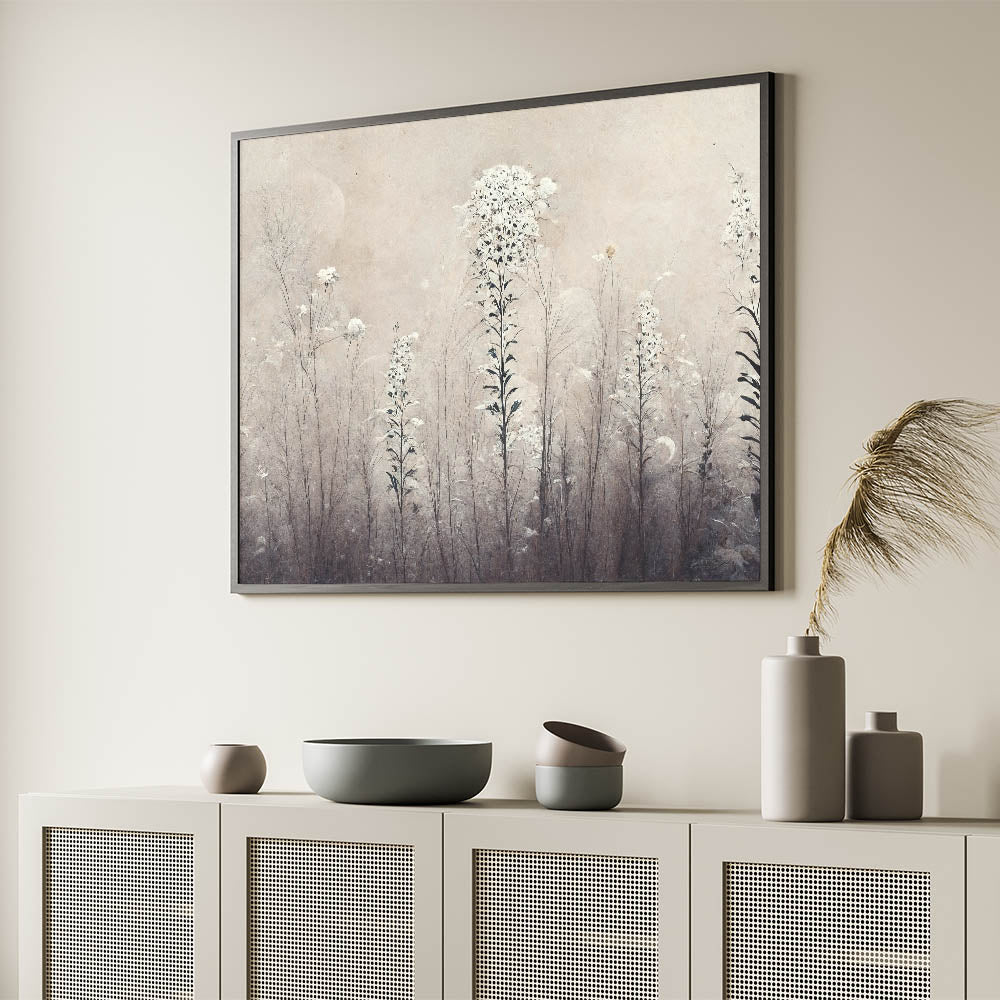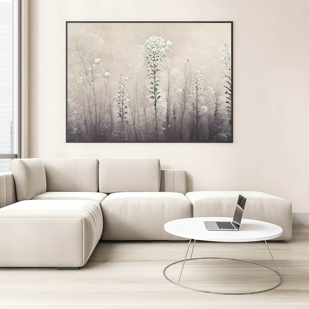 Add a touch of calm sophistication to your home with this "Modern Floral Abstract" piece, featuring tall, delicate white blooms set against a misty, neutral background. The subtle tones of beige and gray, paired with the elegant black stems, create a sense of tranquility that makes this artwork ideal for minimalist and contemporary decor styles. This floral abstract captures the serene beauty of wildflowers in a refined, understated manner.