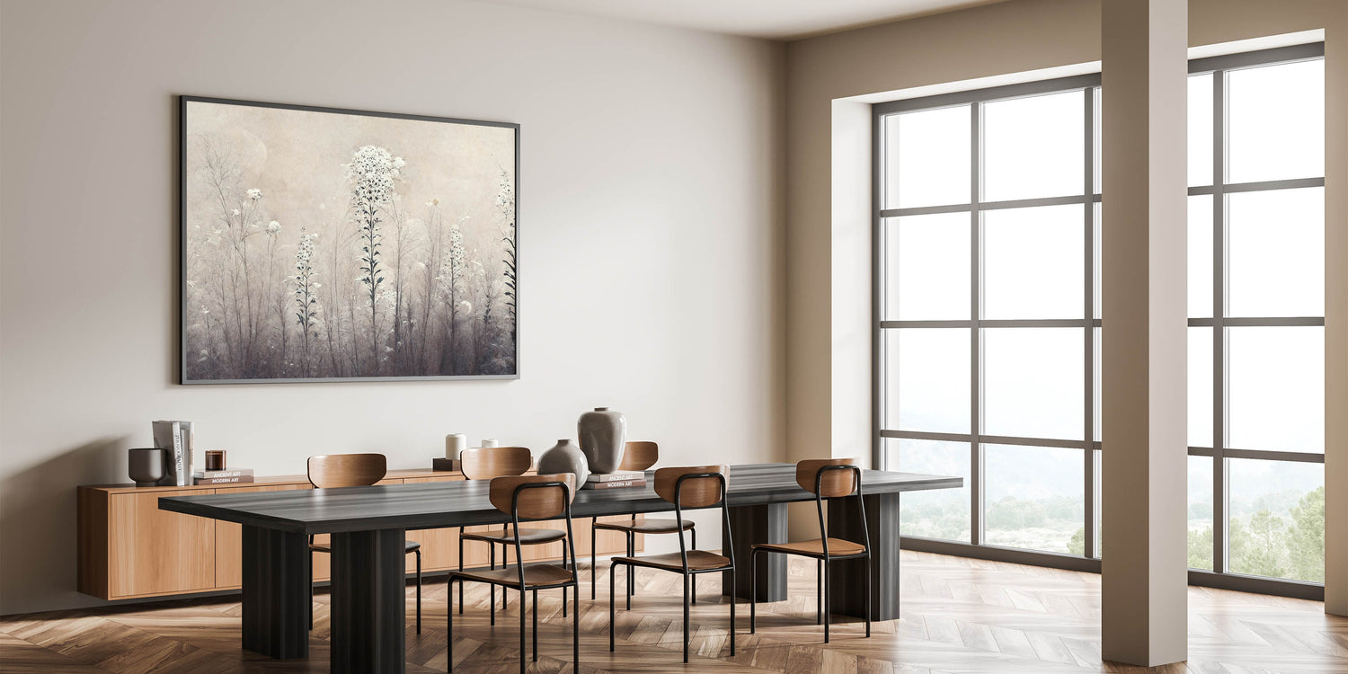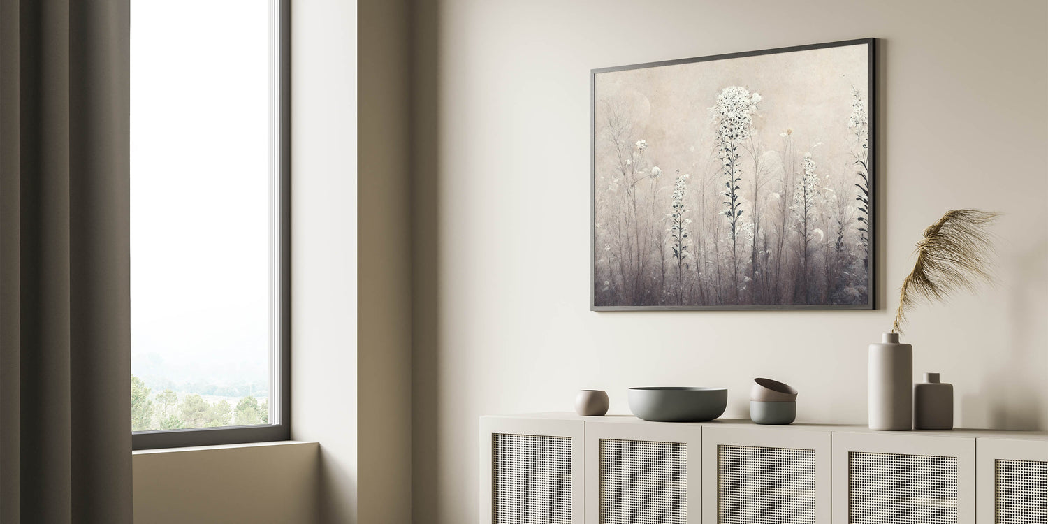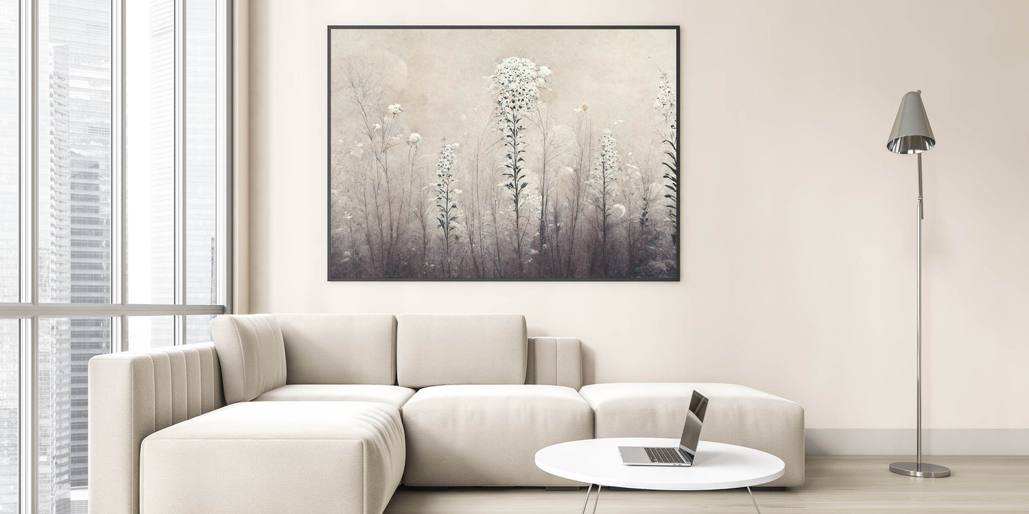 Add a touch of calm sophistication to your home with this "Modern Floral Abstract" piece, featuring tall, delicate white blooms set against a misty, neutral background. The subtle tones of beige and gray, paired with the elegant black stems, create a sense of tranquility that makes this artwork ideal for minimalist and contemporary decor styles. This floral abstract captures the serene beauty of wildflowers in a refined, understated manner.