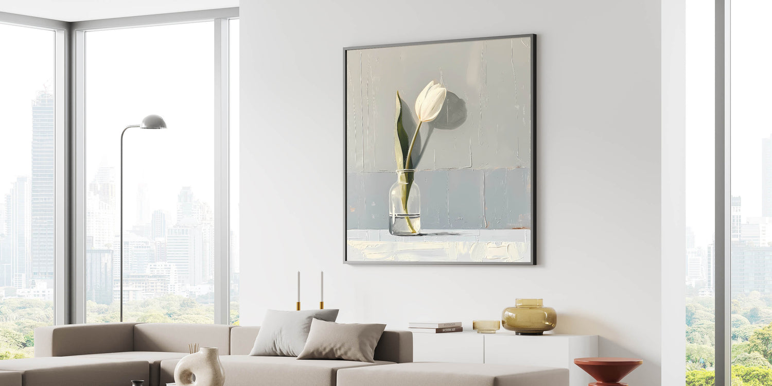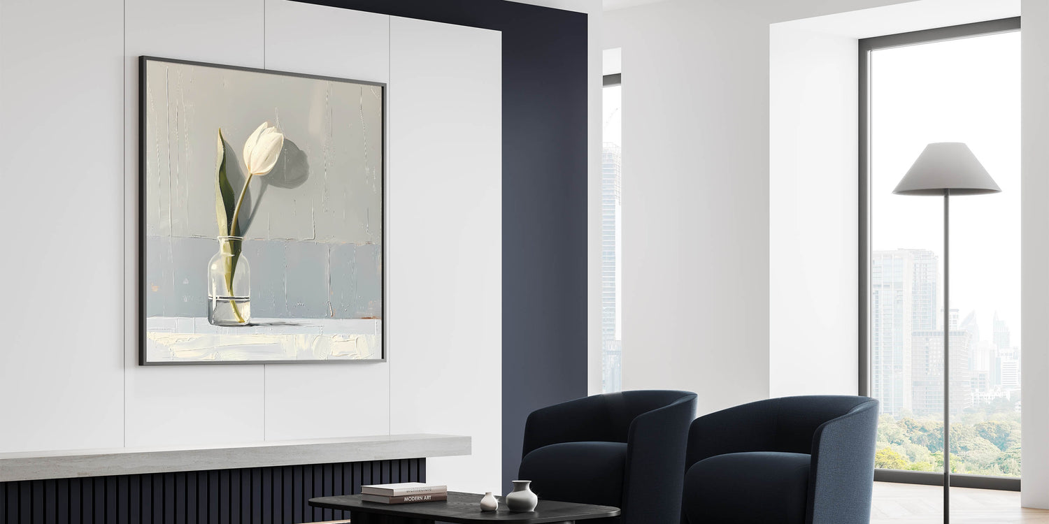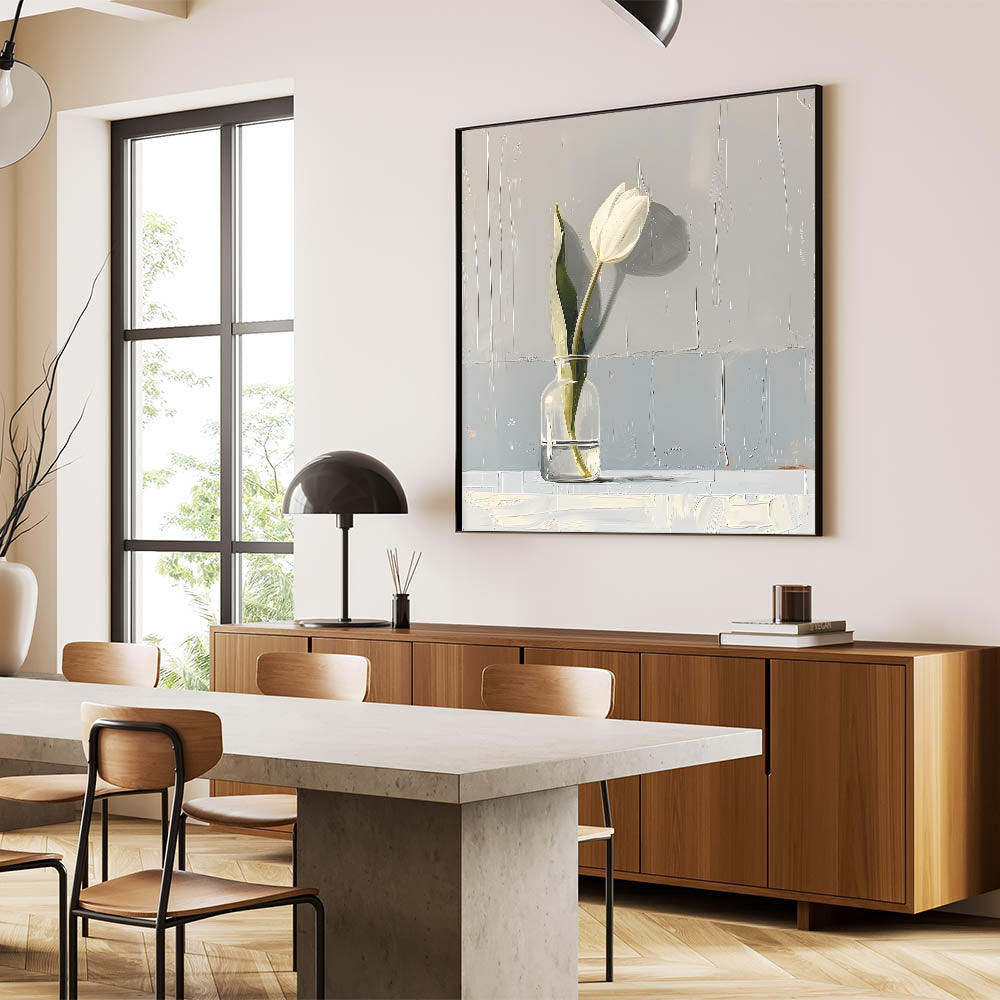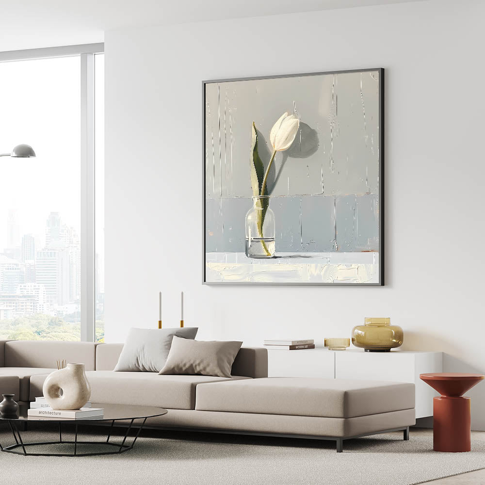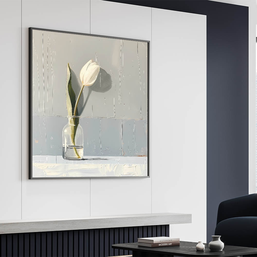 Add a touch of elegance to your space with this minimalist piece from our Abstract Florals Collection. This artwork features a single white tulip in a glass vase set against a soft gray background, blending simplicity with artistic sophistication. Ideal for those looking for contemporary floral wall art, this piece brings serenity and style to any setting.