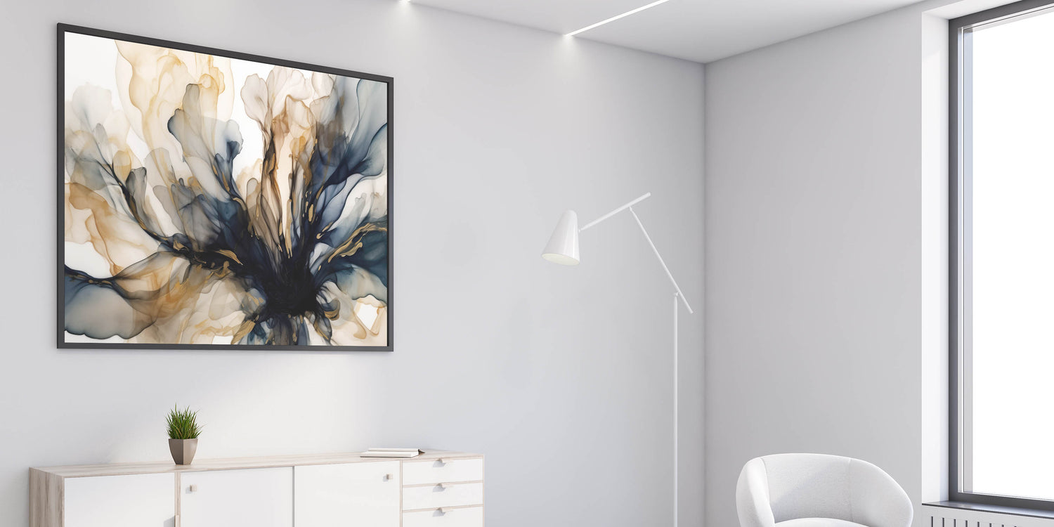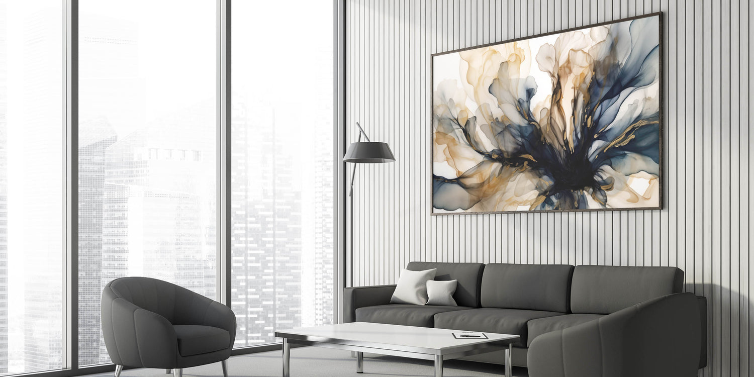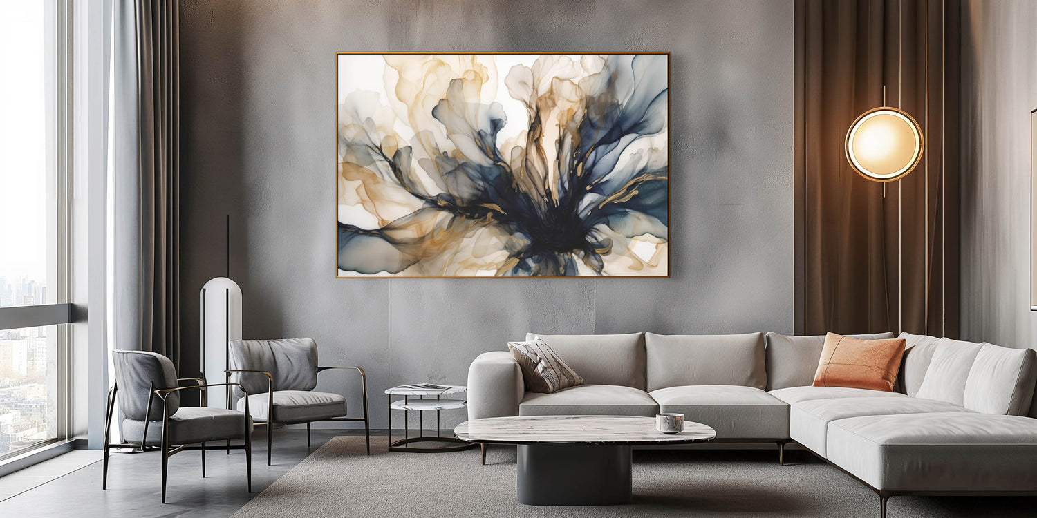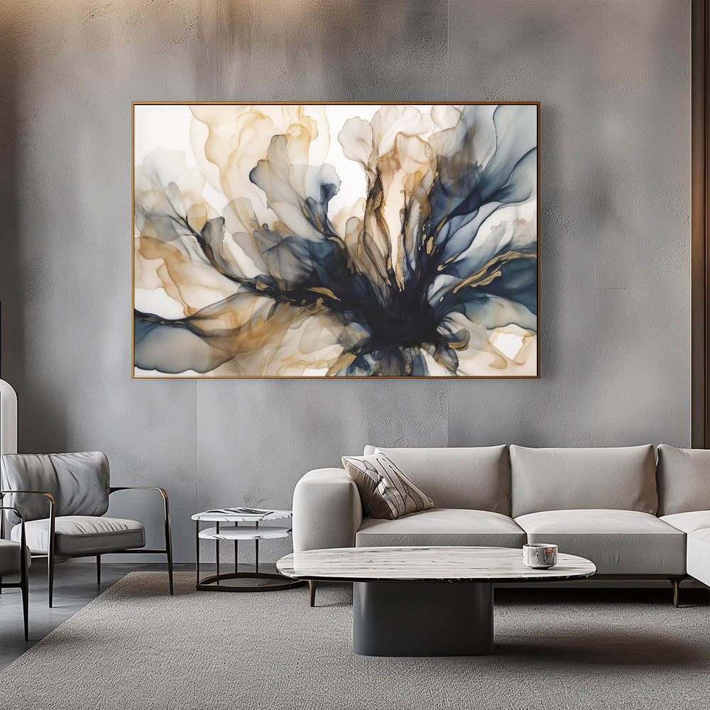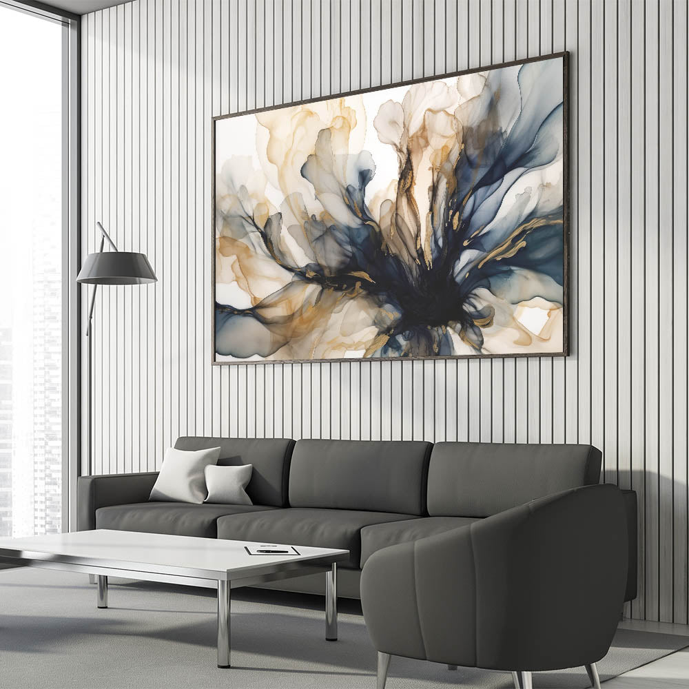 - Artwork Style: Abstract floral design with dynamic navy and gold accents