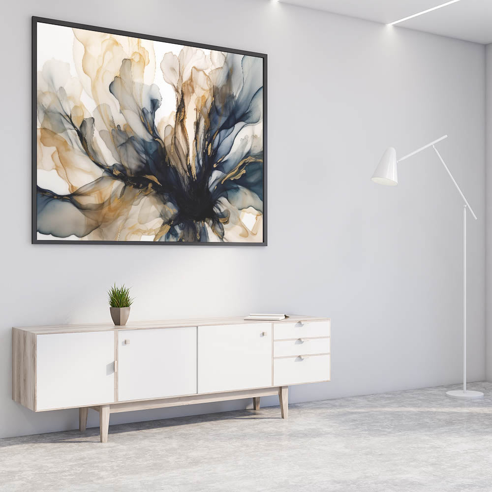Elevate your space with this modern floral wall decor featuring abstract blooms in navy and gold. The fluid forms and organic shapes bring a sense of movement and grace to the piece, creating a captivating focal point for any room. With its blend of deep navy tones and luxurious gold accents, this artwork adds sophistication and style, perfect for both contemporary and classic interiors.