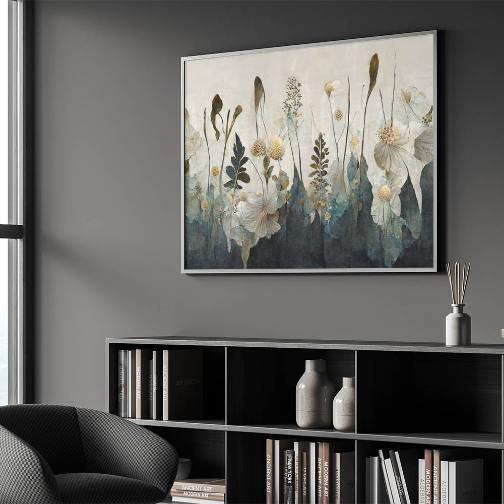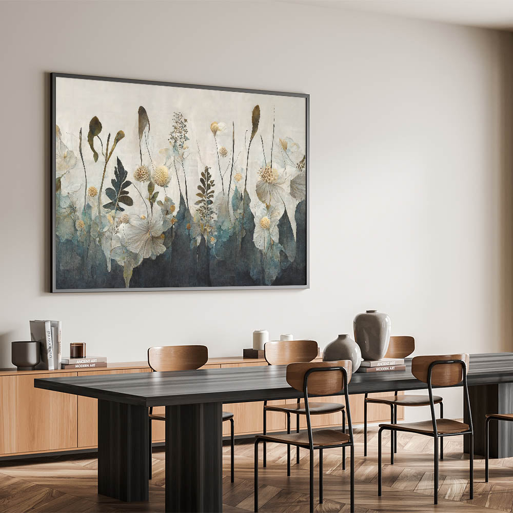 Explore the enchanting depths of nature with this "Modern Floral Wall Decor" piece, inspired by a midnight garden. The delicate, ethereal flowers and foliage in muted greens, blues, and cream tones evoke a sense of calm and mystery. This artwork beautifully combines the allure of floral elements with contemporary abstraction, making it a versatile piece for any room needing a touch of refined elegance.