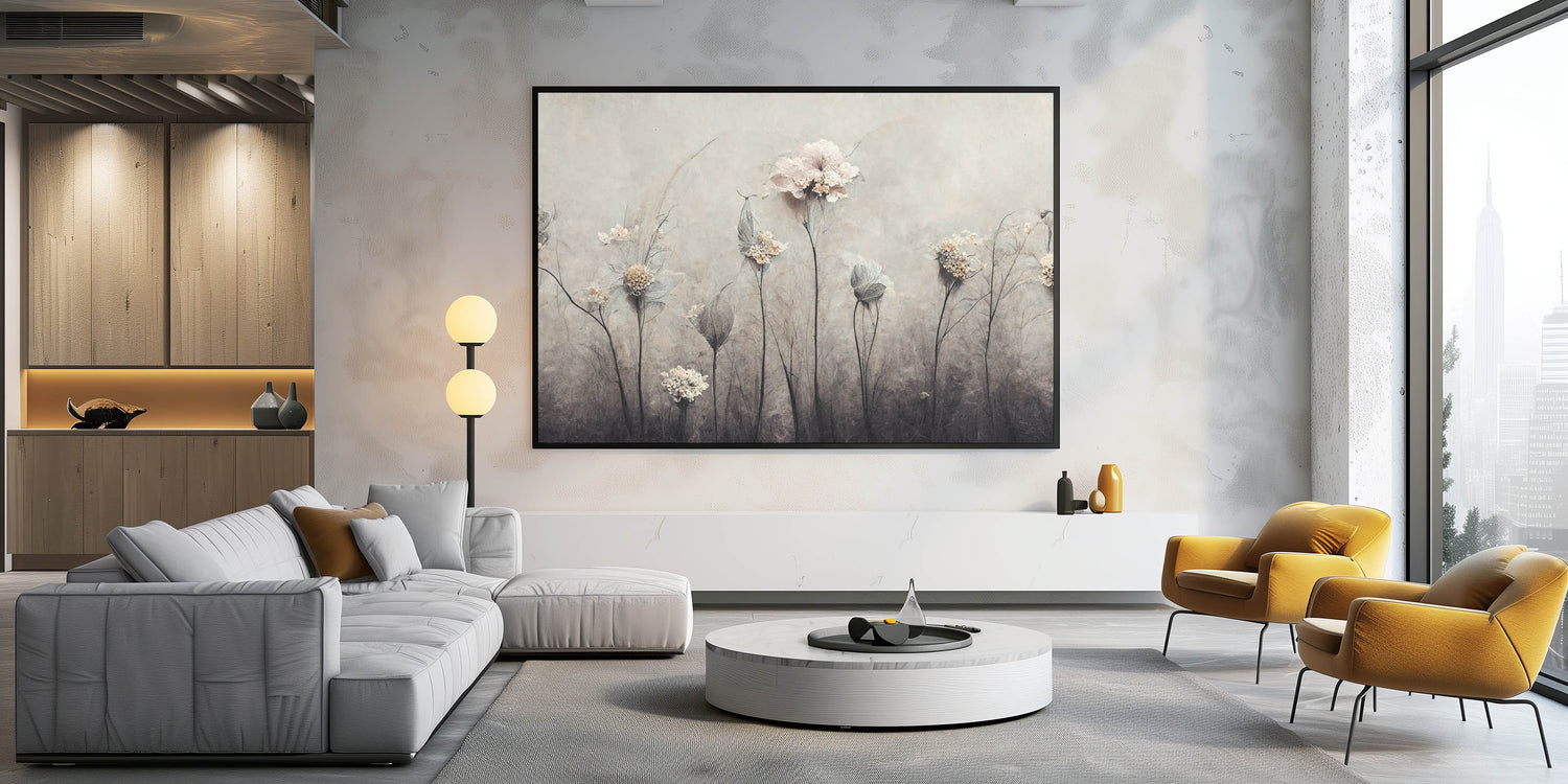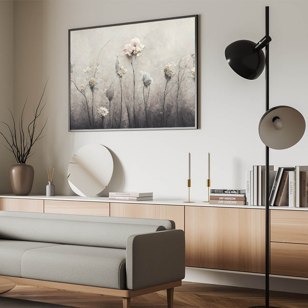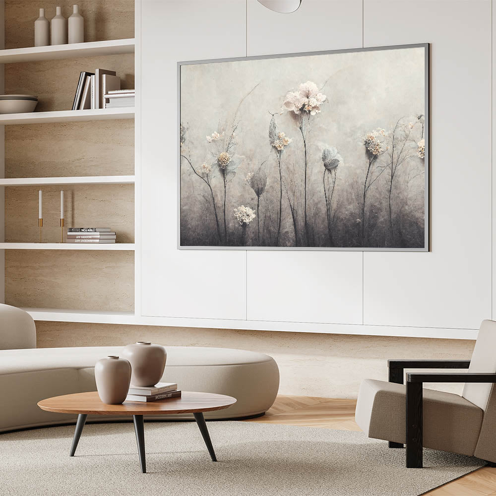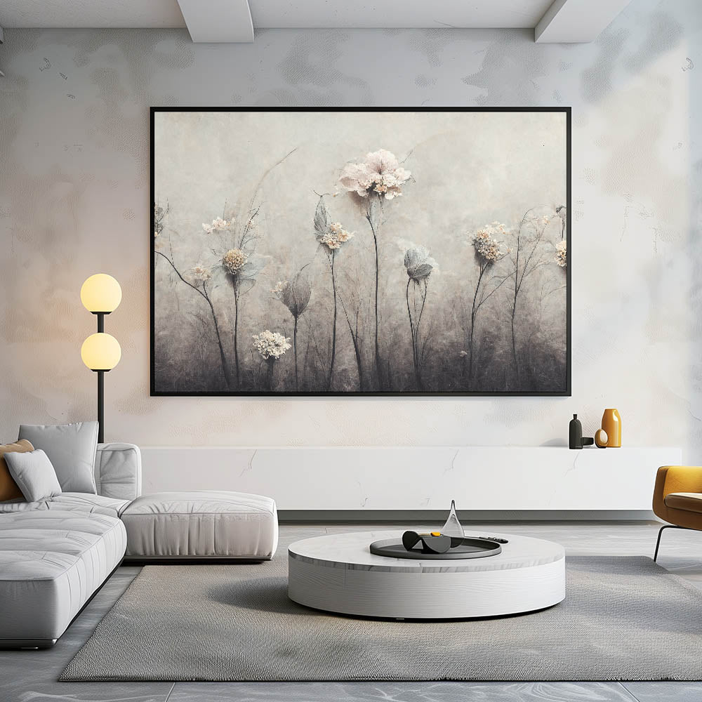 Embrace the serene beauty of delicate blossoms with this "Modern Floral Wall Decor," featuring soft flowers set against a misty, neutral background. The understated beige and gray tones create a calming effect, perfect for adding a touch of sophistication to any room. This floral abstract embodies a minimalist yet elegant style, making it a versatile piece for bedrooms, living rooms, or office spaces.