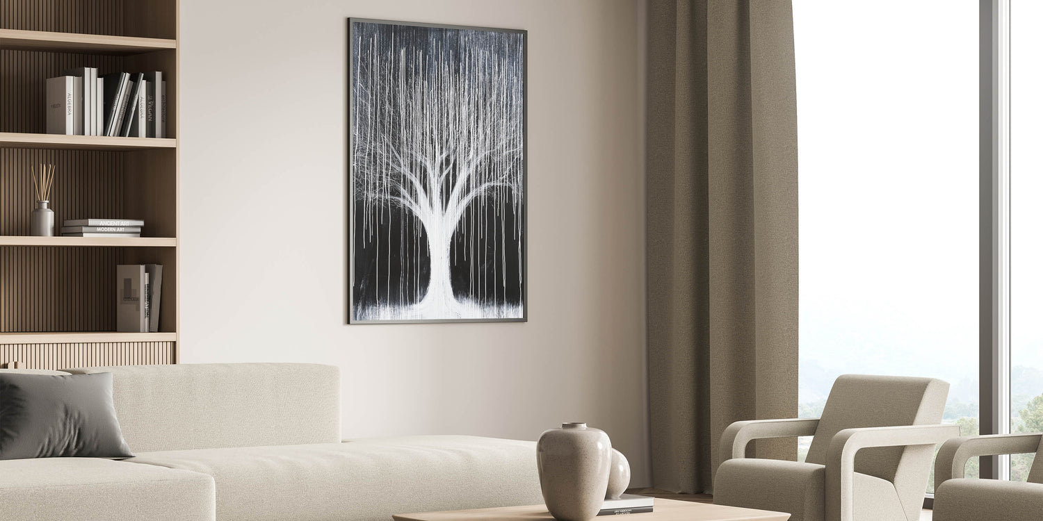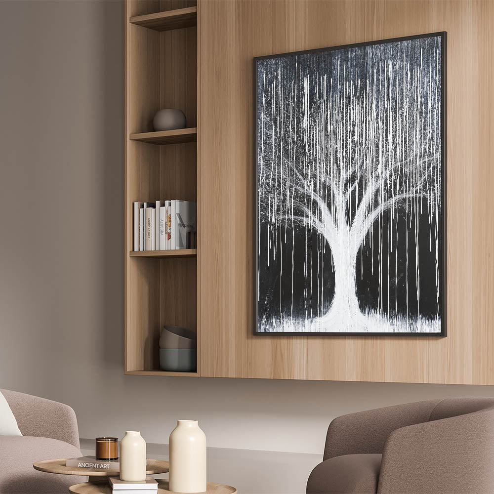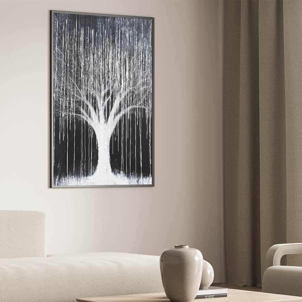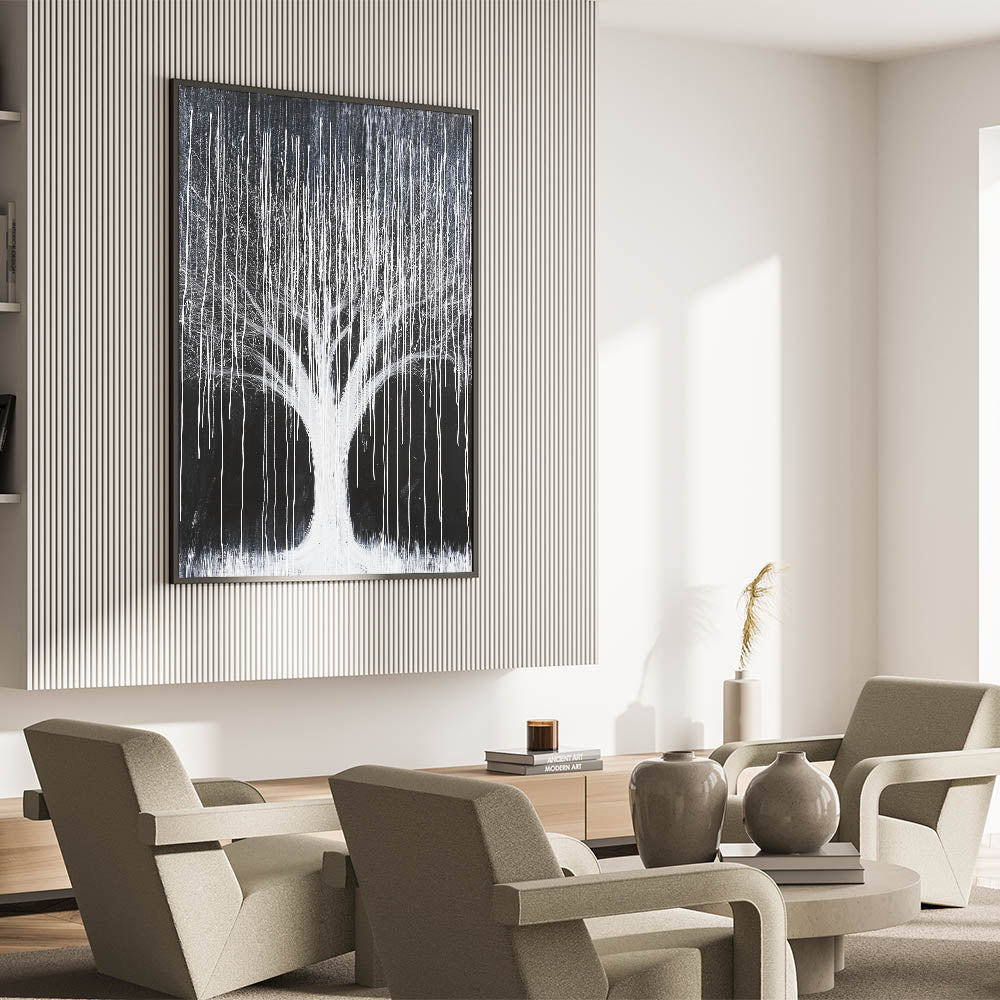 Elevate your space with the bold elegance of this Monochrome Abstract Tree Canvas. Featuring a striking white tree with intricate, branching details, this artwork stands out against a deep black background. The dripping paint effect adds a unique and contemporary edge, making it a perfect addition to minimalist, modern, or monochromatic interiors.