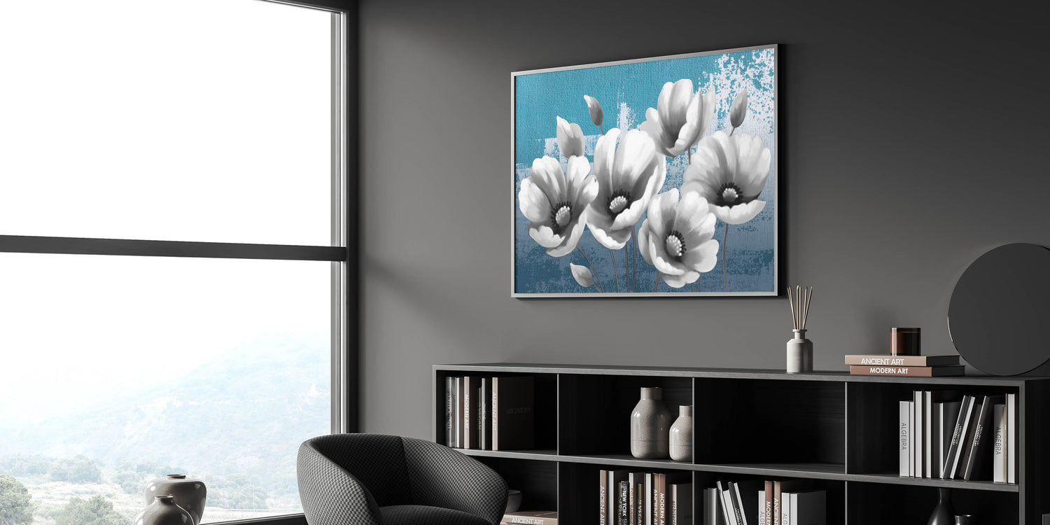 Add a touch of modern elegance to your space with this striking monochrome floral artwork set against a vibrant teal background. The delicate white flowers are intricately detailed, standing out beautifully against the textured teal backdrop. This artwork combines the timeless beauty of floral designs with a contemporary color palette, making it a perfect addition to any modern or minimalist interior.