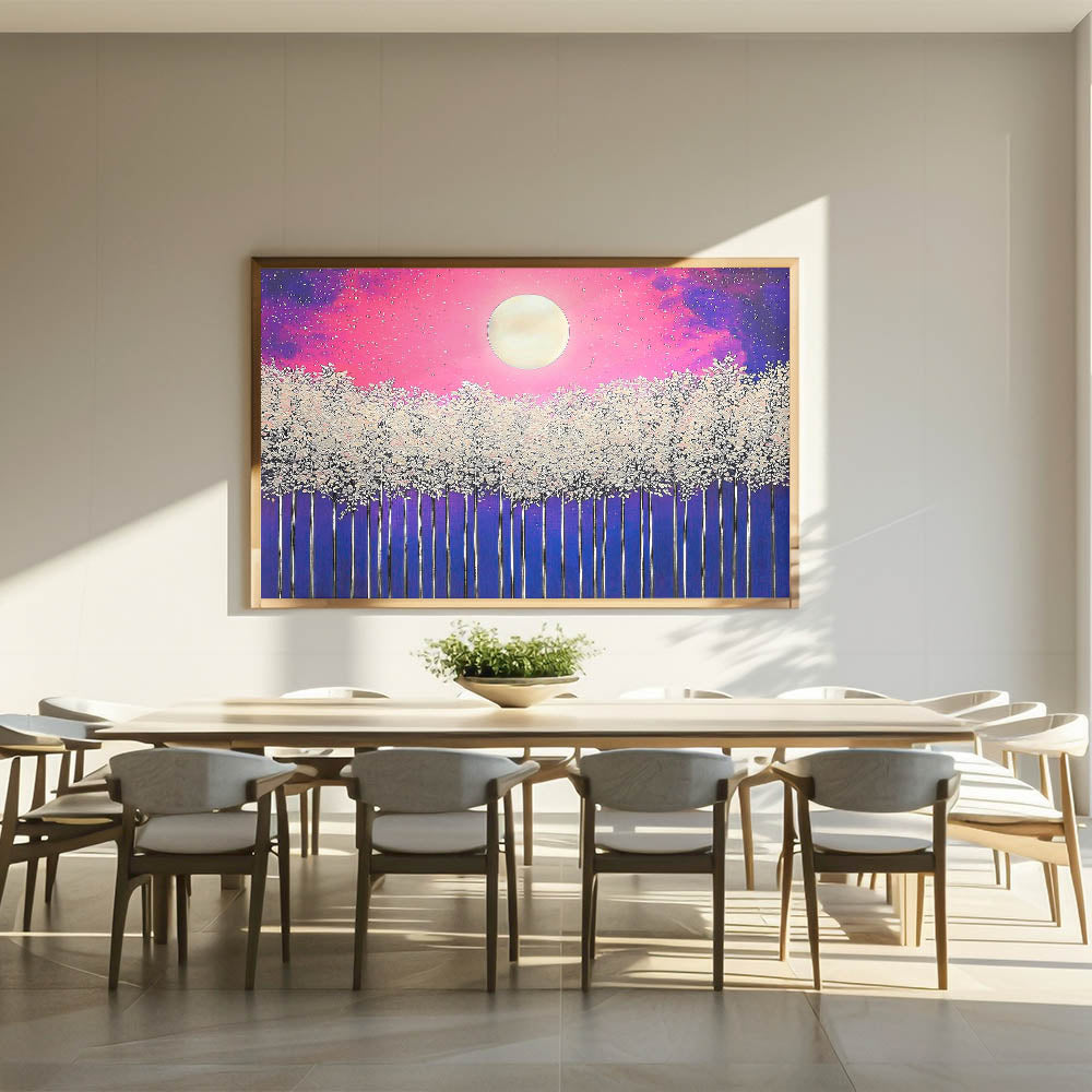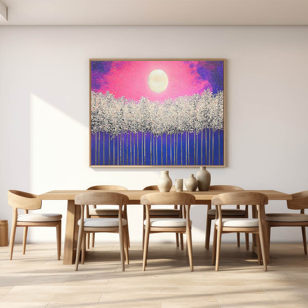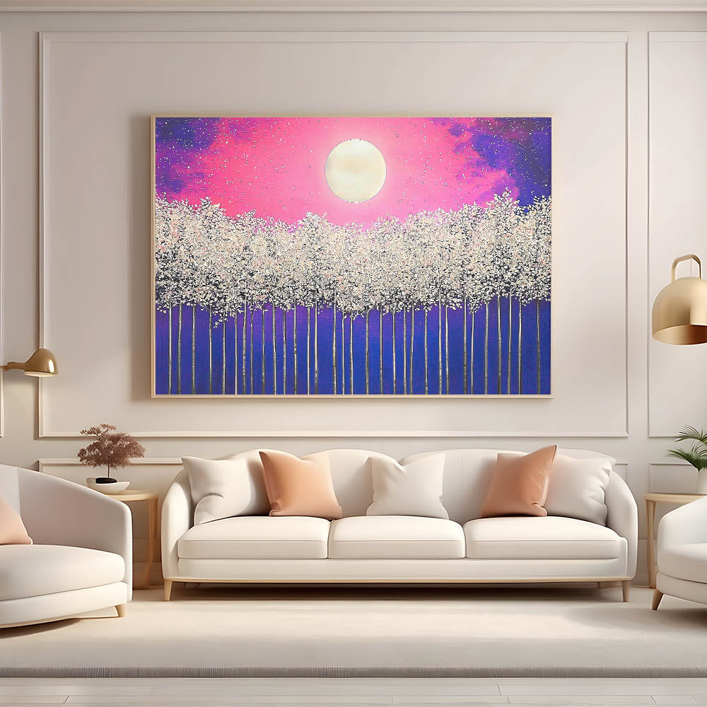 Illuminate your space with the enchanting beauty of Moonlit Forest, a vibrant abstract landscape artwork featuring a glowing full moon above a mystical forest. The piece combines stunning shades of pink, purple, and blue with delicate white treetops, creating a dreamlike atmosphere. Perfect for modern, bohemian, or nature-inspired interiors, this artwork adds a touch of magic and tranquility to any room.