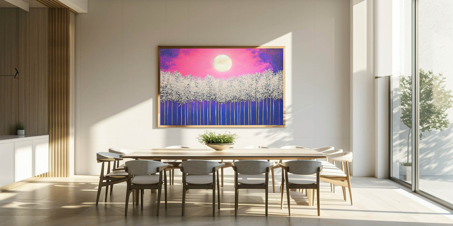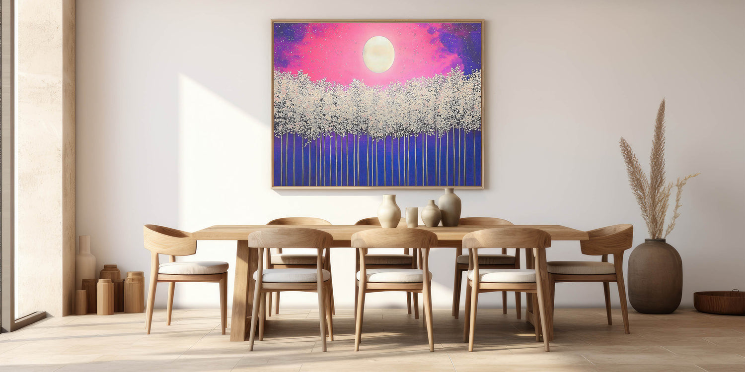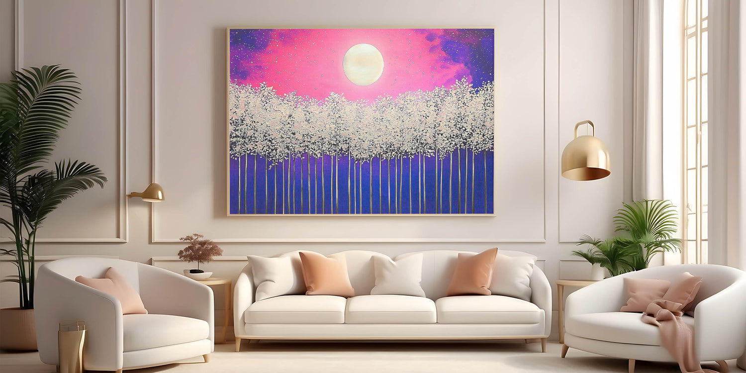 Illuminate your space with the enchanting beauty of Moonlit Forest, a vibrant abstract landscape artwork featuring a glowing full moon above a mystical forest. The piece combines stunning shades of pink, purple, and blue with delicate white treetops, creating a dreamlike atmosphere. Perfect for modern, bohemian, or nature-inspired interiors, this artwork adds a touch of magic and tranquility to any room.