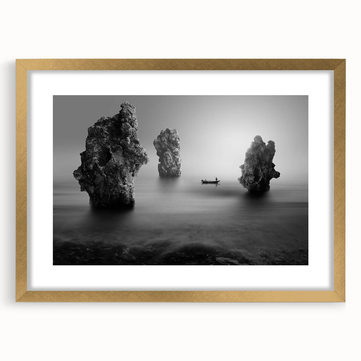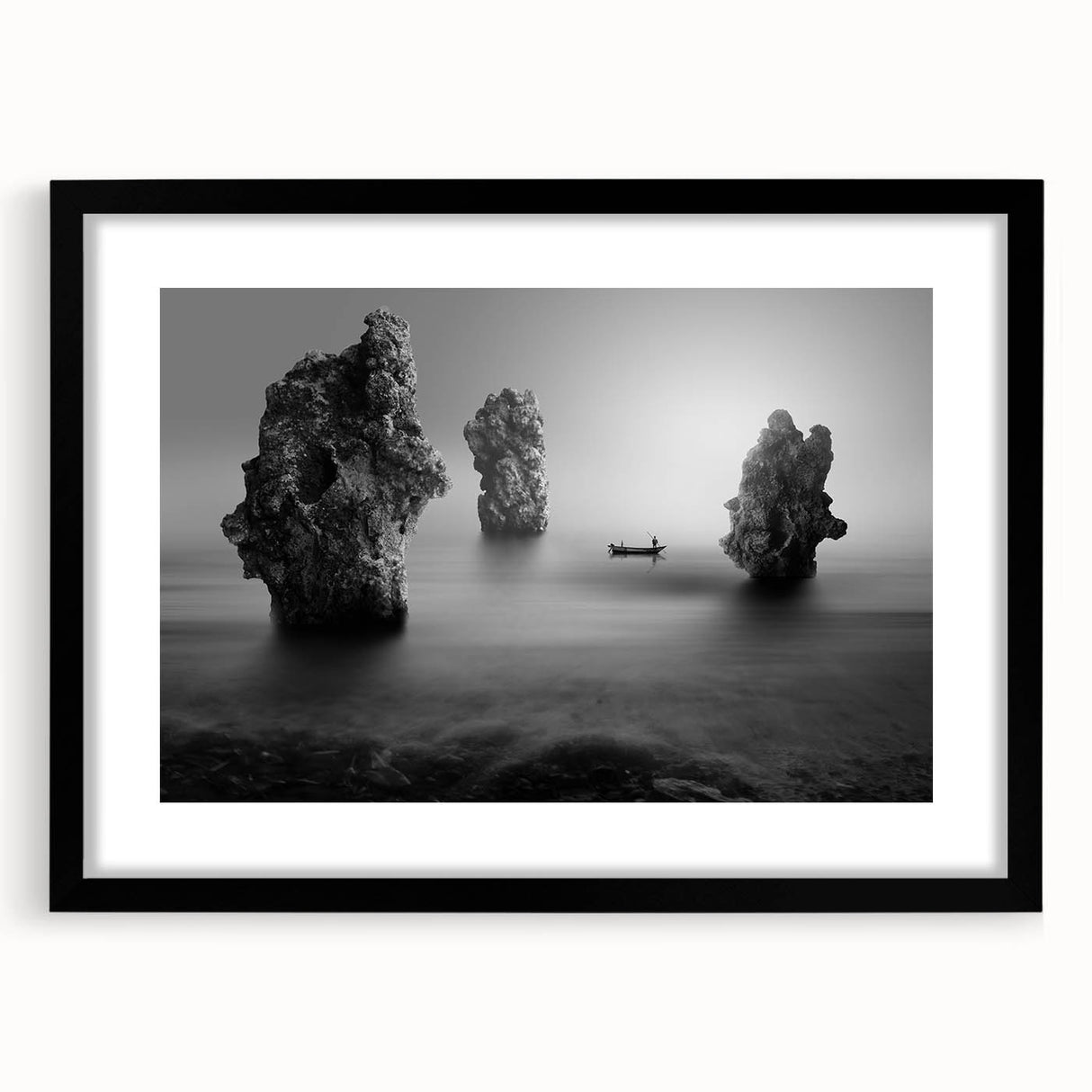 Immerse yourself in the tranquil beauty of this fine art photography framed print. This black-and-white seascape features towering rock formations rising from misty waters, with a lone fisherman navigating his small boat. The long-exposure effect creates a dreamlike, ethereal atmosphere, making this an elegant and thought-provoking addition to any modern space.