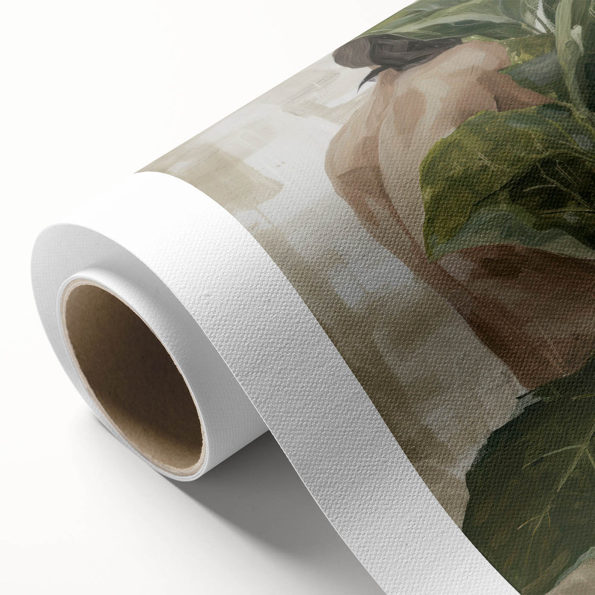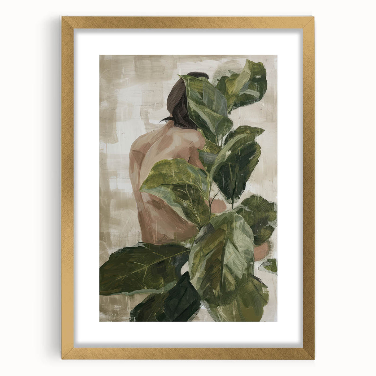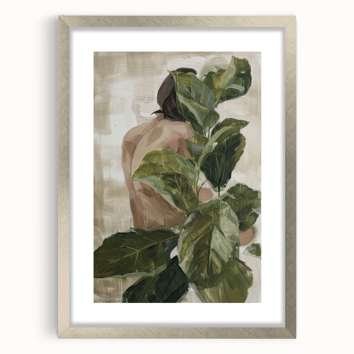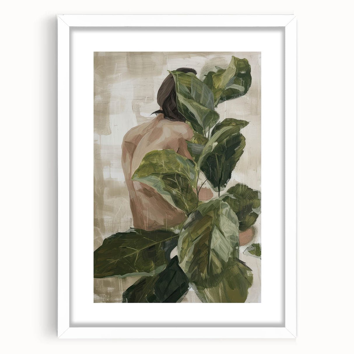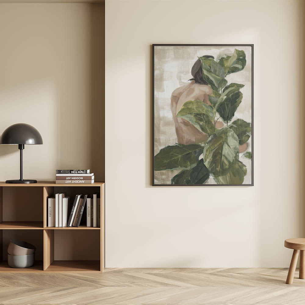 Celebrate the harmony between humanity and nature with this figurative abstract art, showcasing a graceful human figure partially concealed by lush green foliage. This nature-inspired artwork blends earthy tones and dynamic brushstrokes, creating a tranquil yet striking composition that brings the outdoors into your space.