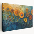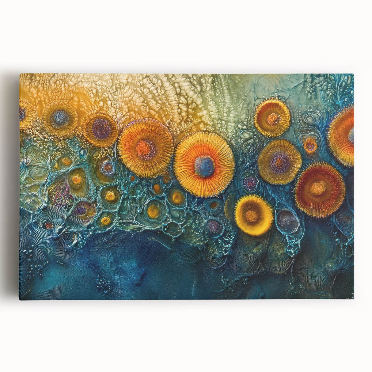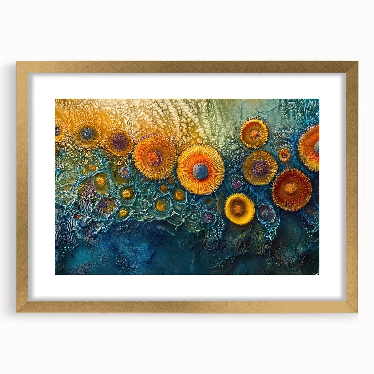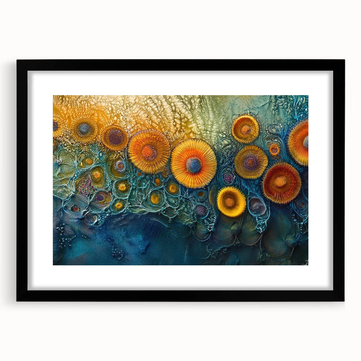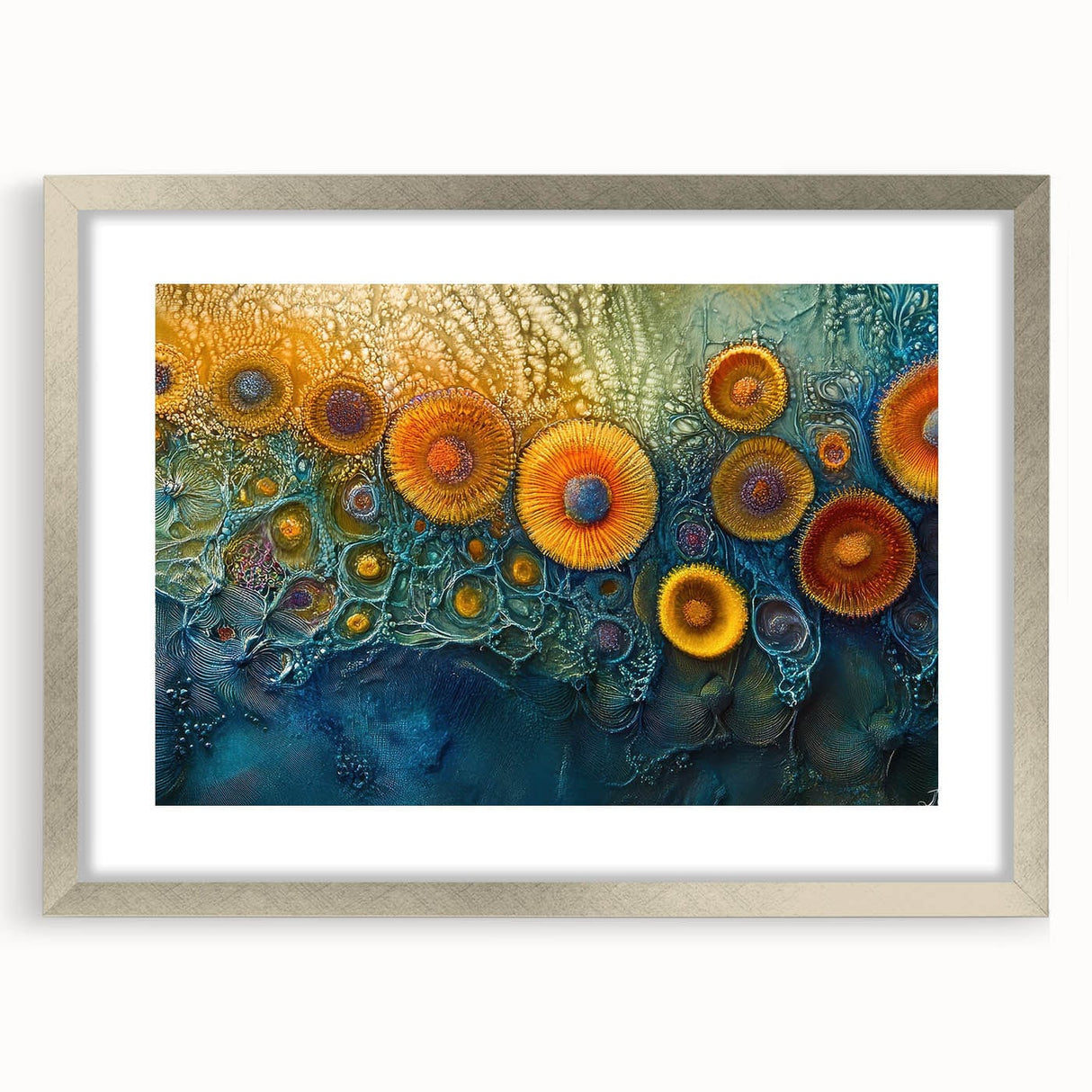 Bring bold energy into your space with these modern fluid art prints, bursting with radiant orange and yellow florals against a richly textured teal and blue background. This piece combines fluid motion with stunning depth and color.