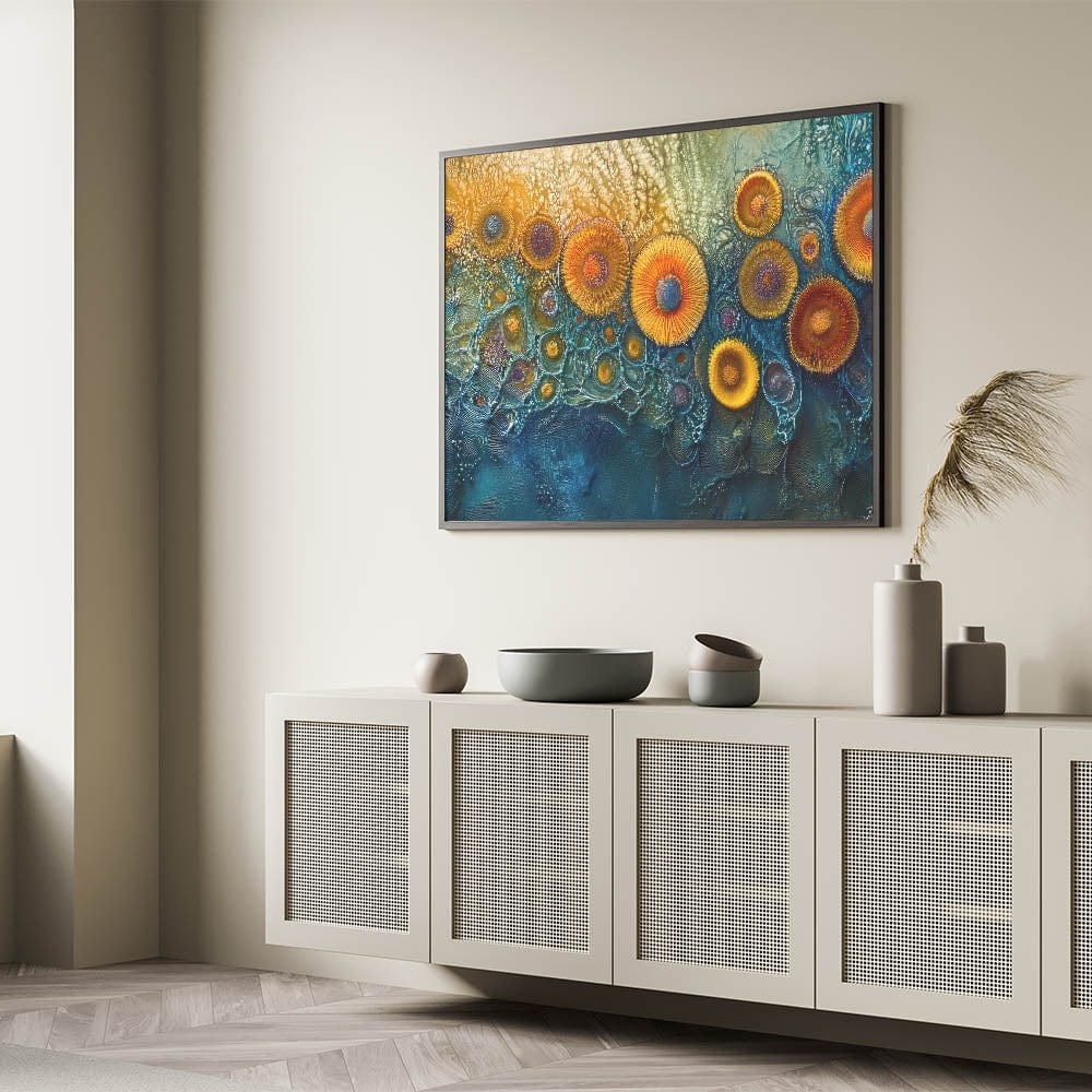 • Vibrant mix of orange, yellow, and blue in a striking composition