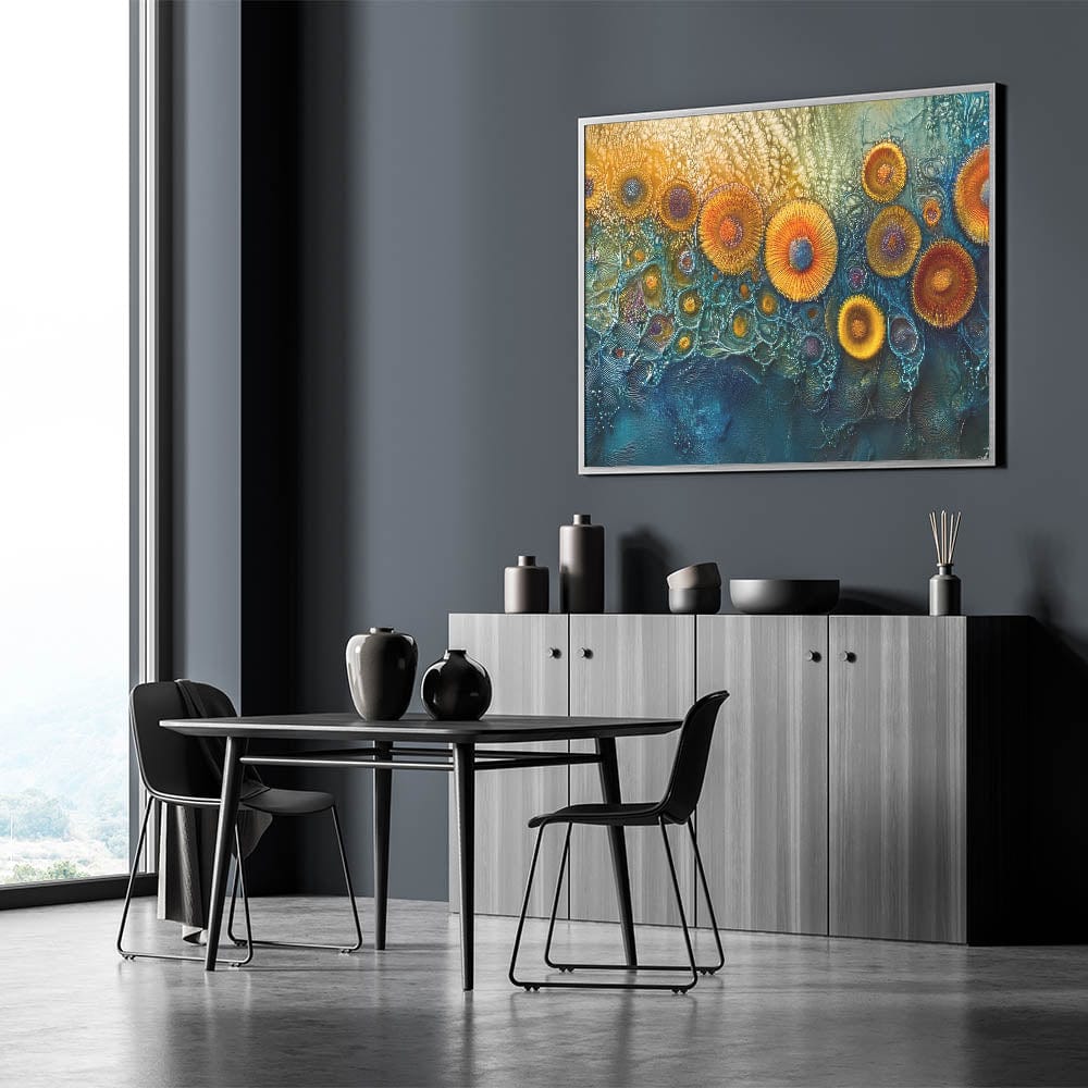 This contemporary fluid artwork channels organic energy with a dazzling color palette. Ideal for those seeking bold artistic expression, it adds life and vibrancy to modern interiors.