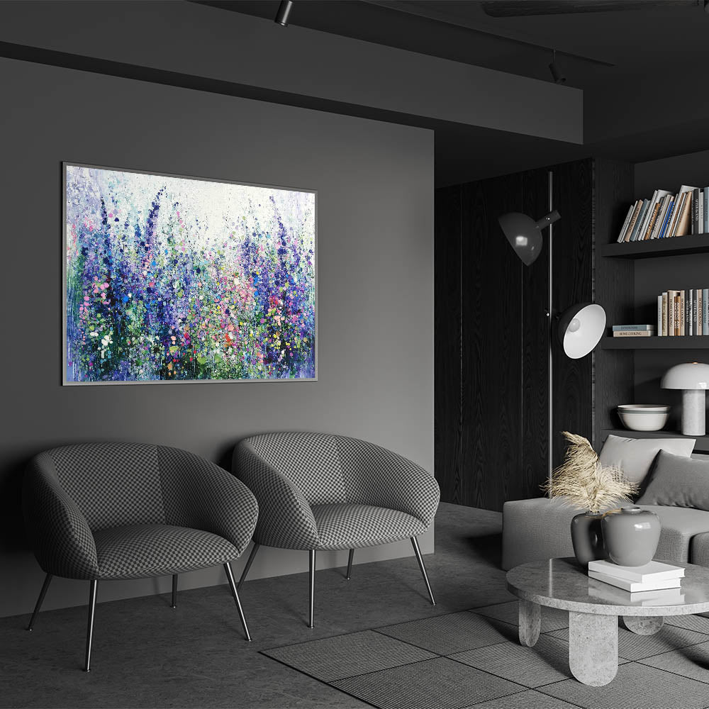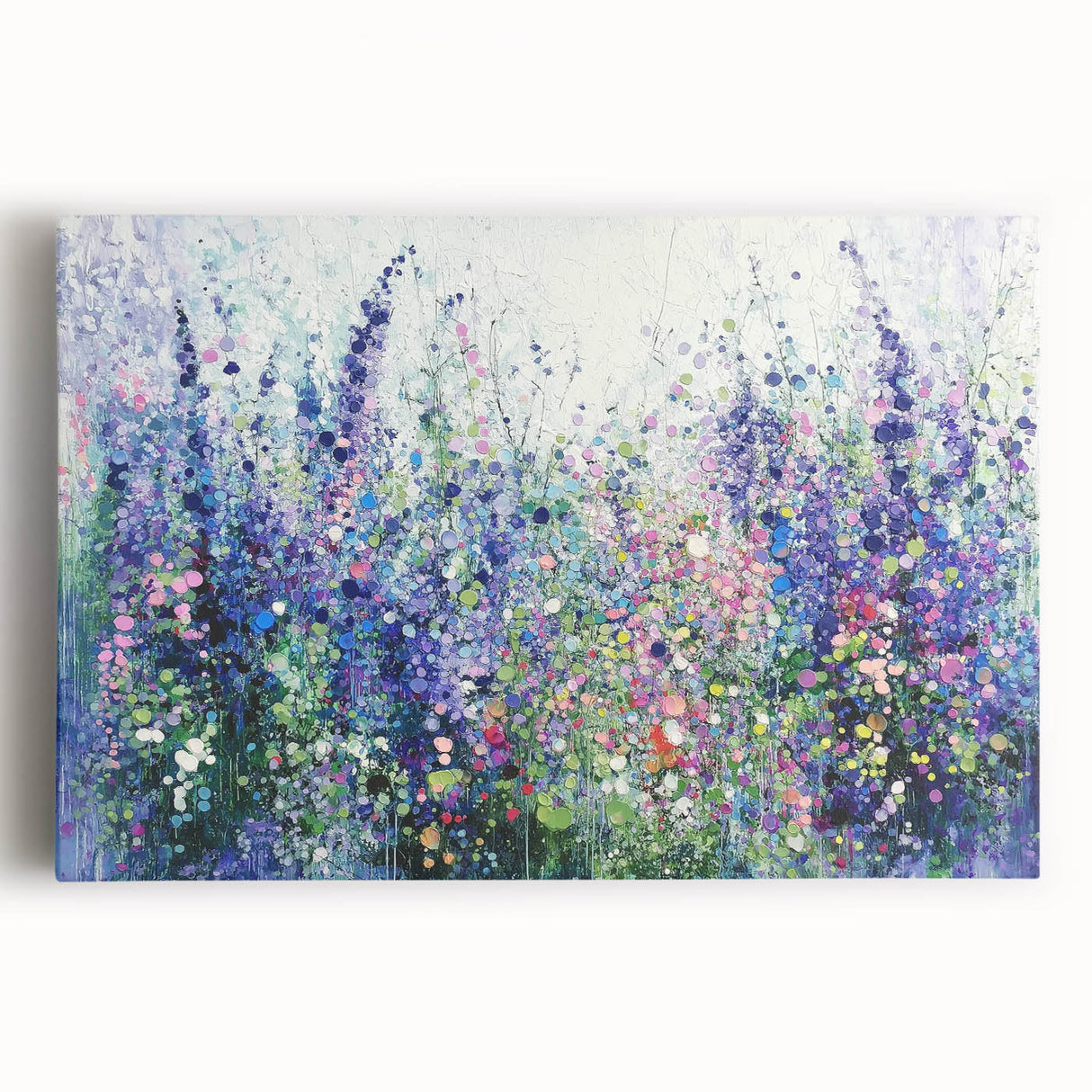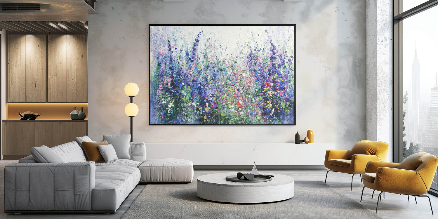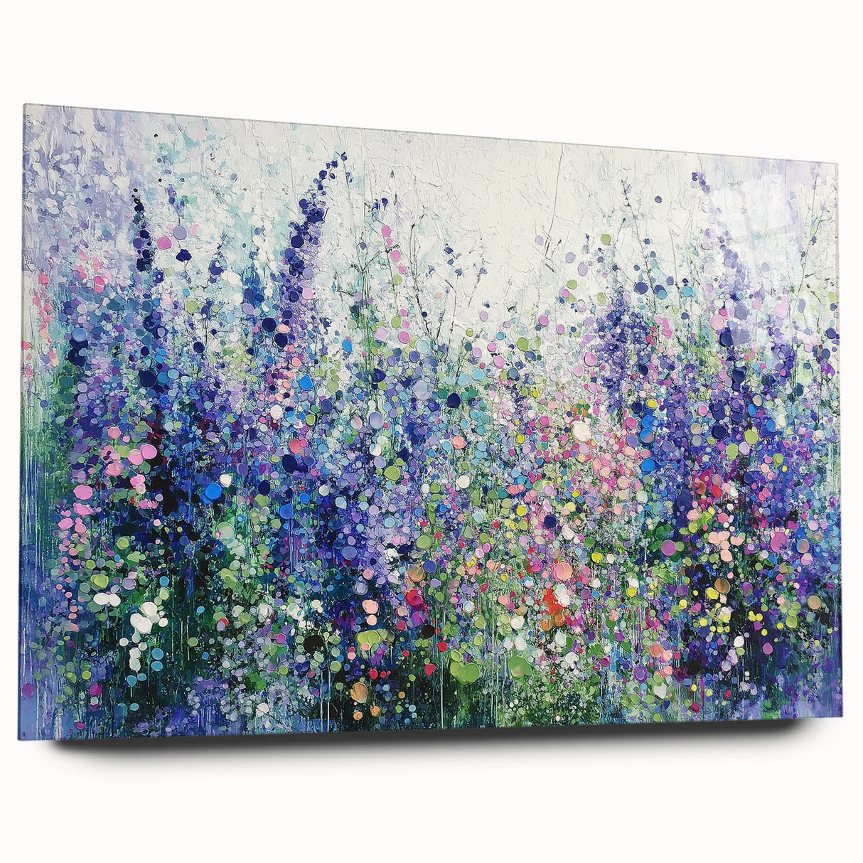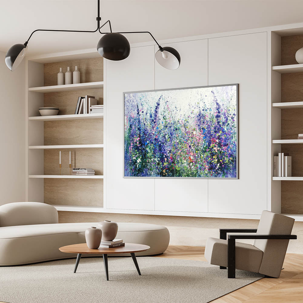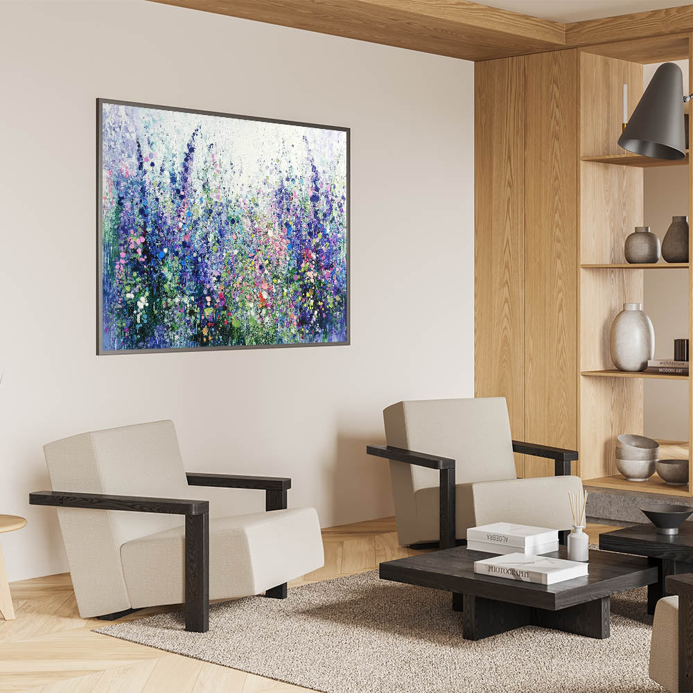Transform your space with this tranquil abstract floral artwork, inspired by the beauty of blooming meadows. Featuring a harmonious blend of purples, blues, and soft greens, this piece evokes a sense of calm and natural elegance. The layered textures and dotted accents create depth and movement, capturing the vibrant essence of wildflowers in full bloom.