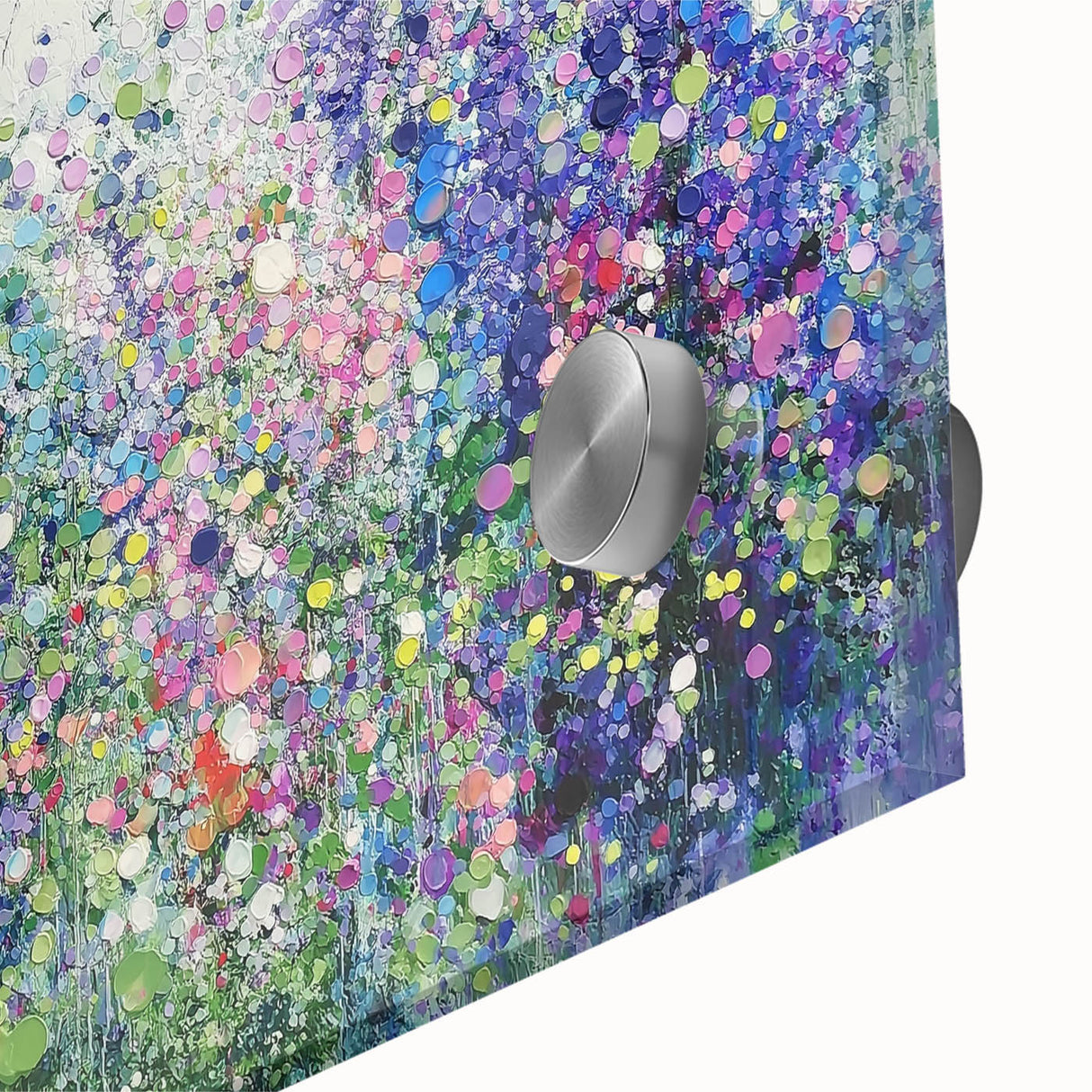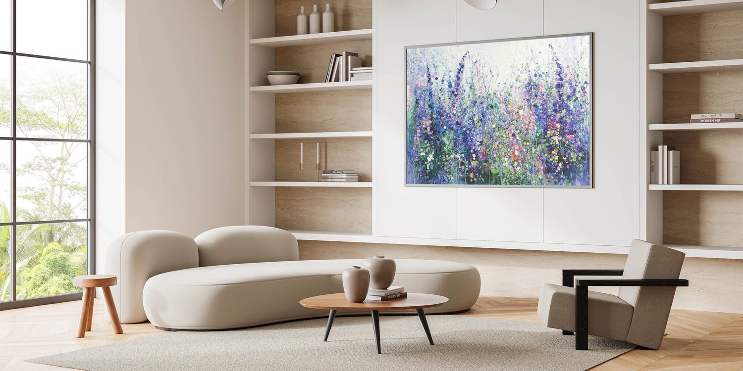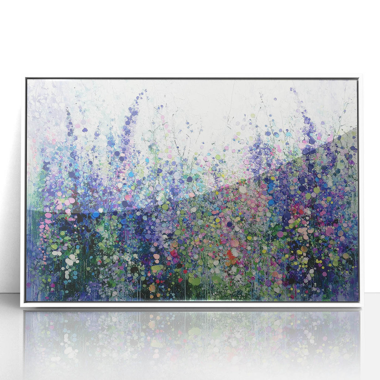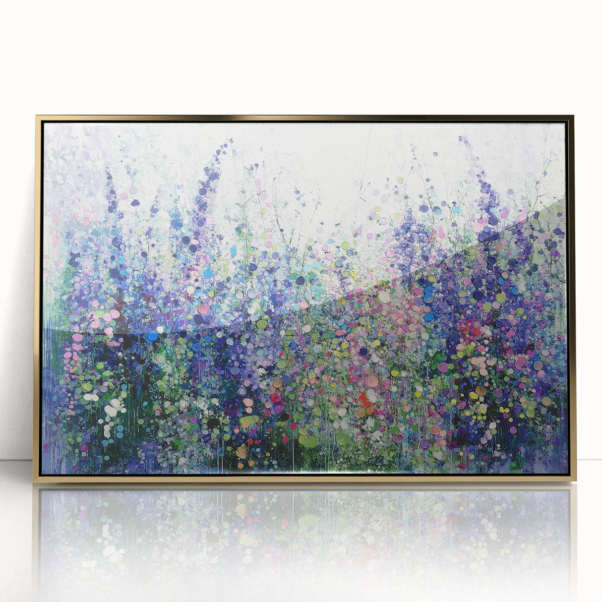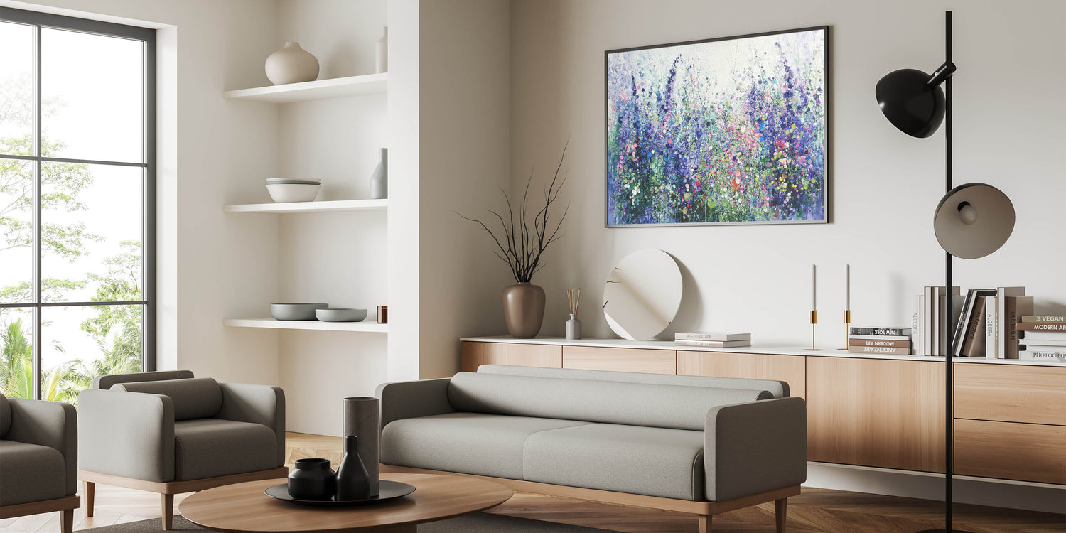 Transform your space with this tranquil abstract floral artwork, inspired by the beauty of blooming meadows. Featuring a harmonious blend of purples, blues, and soft greens, this piece evokes a sense of calm and natural elegance. The layered textures and dotted accents create depth and movement, capturing the vibrant essence of wildflowers in full bloom.