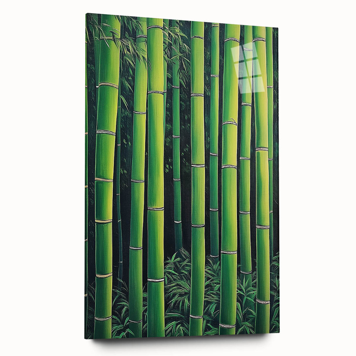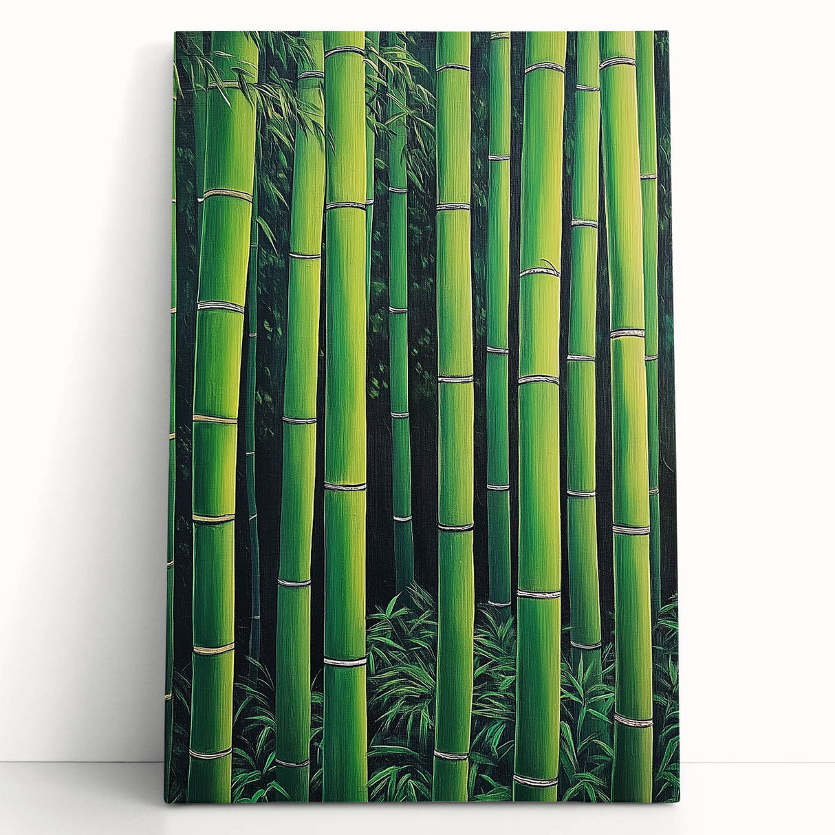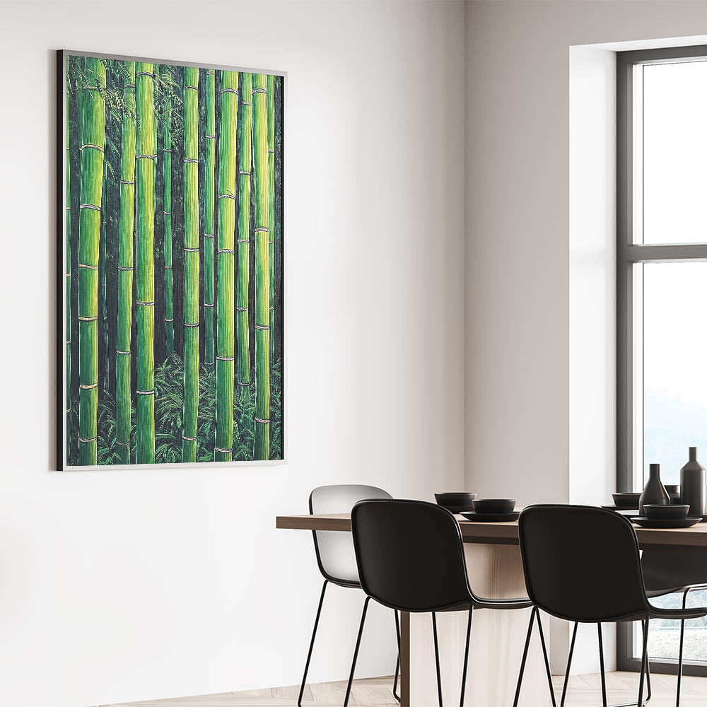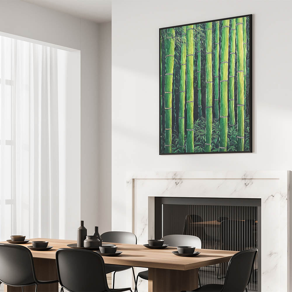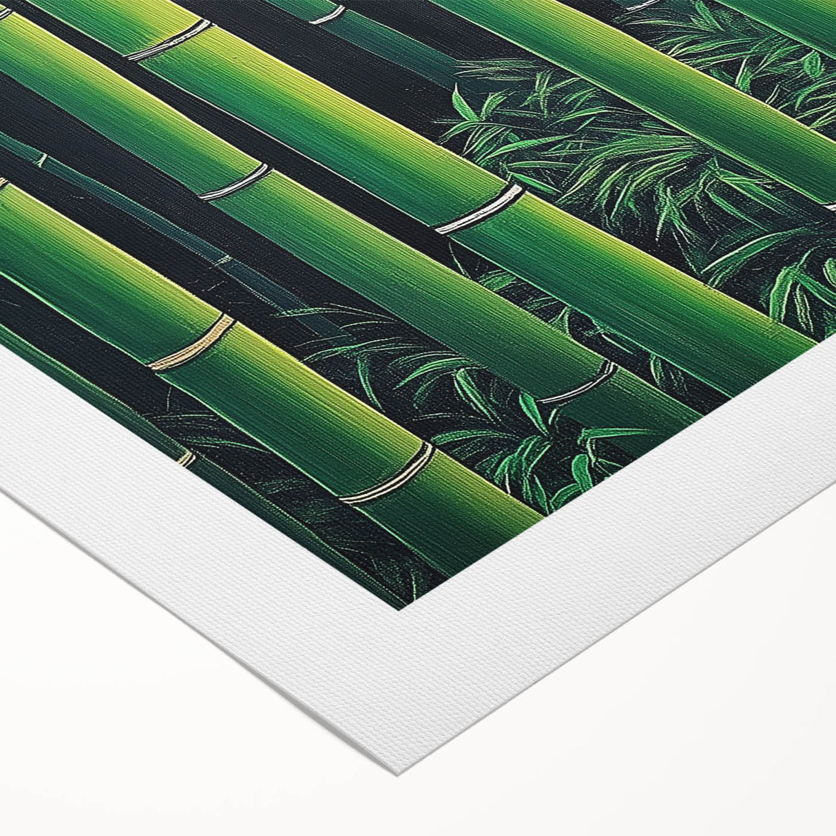 Immerse yourself in the tranquil beauty of nature with this stunning abstract floral artwork, featuring a serene bamboo grove. The vibrant green bamboo stalks, set against a dark forest background, evoke a sense of calm and balance, making this piece ideal for modern, minimalist, or nature-inspired interiors.