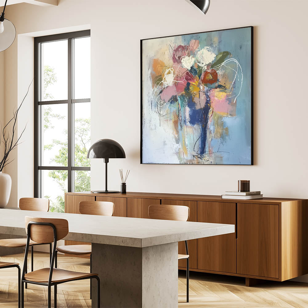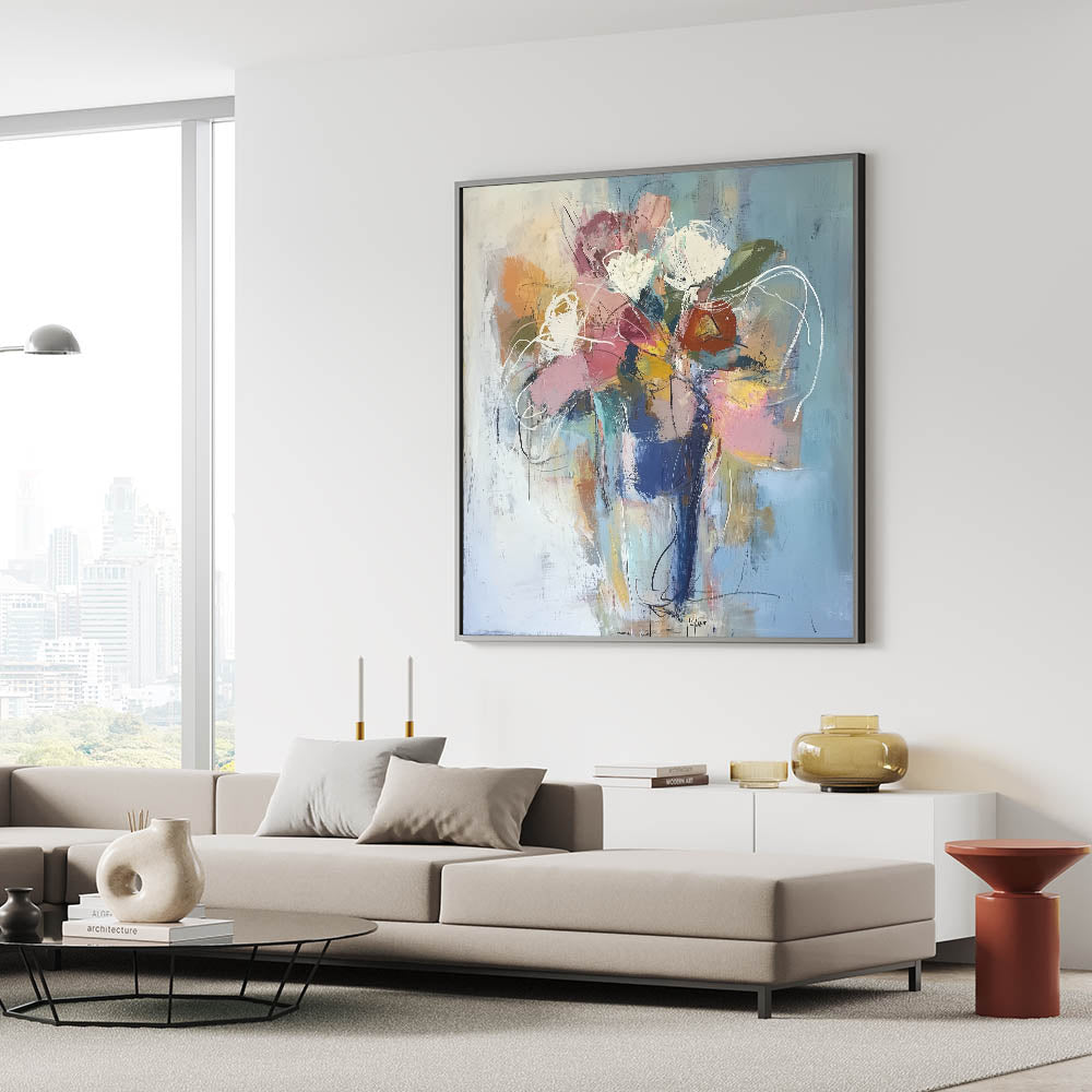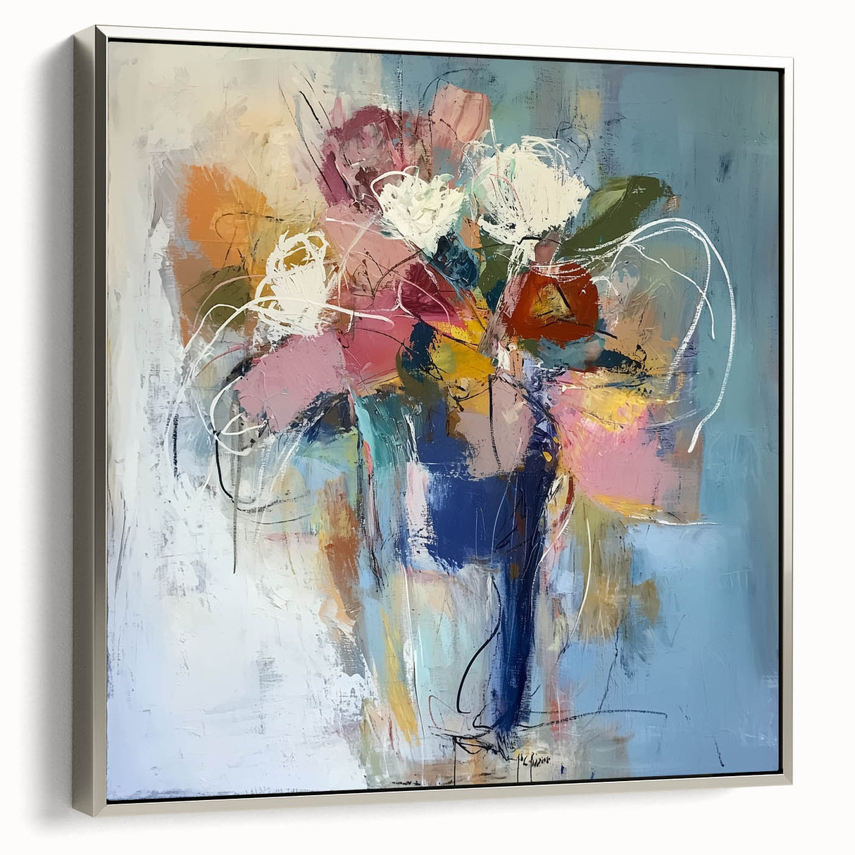 Elevate your space with the lively charm of the Spring Bloom Abstract Floral Wall Art. This expressive artwork features a vibrant bouquet of abstract flowers in shades of pink, orange, yellow, and white, set against a textured, pastel blue background. The dynamic brushstrokes and whimsical lines create a sense of movement and creativity, making it a captivating addition to contemporary, eclectic, or boho-inspired interiors.