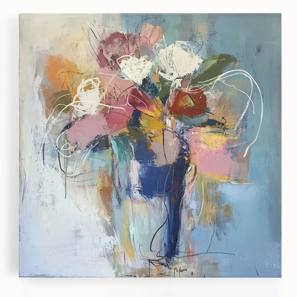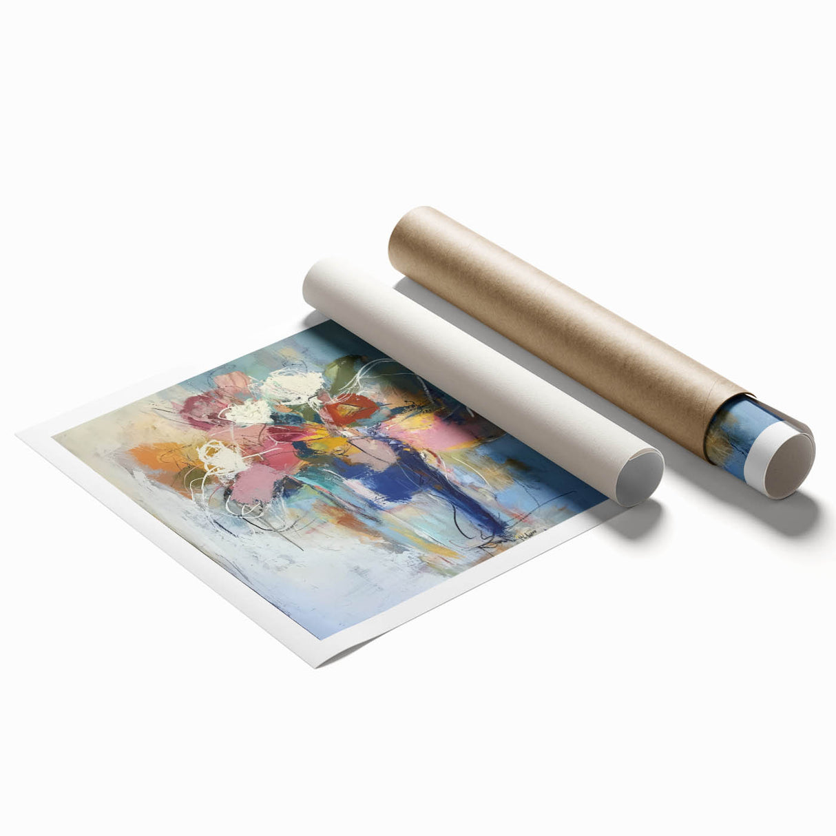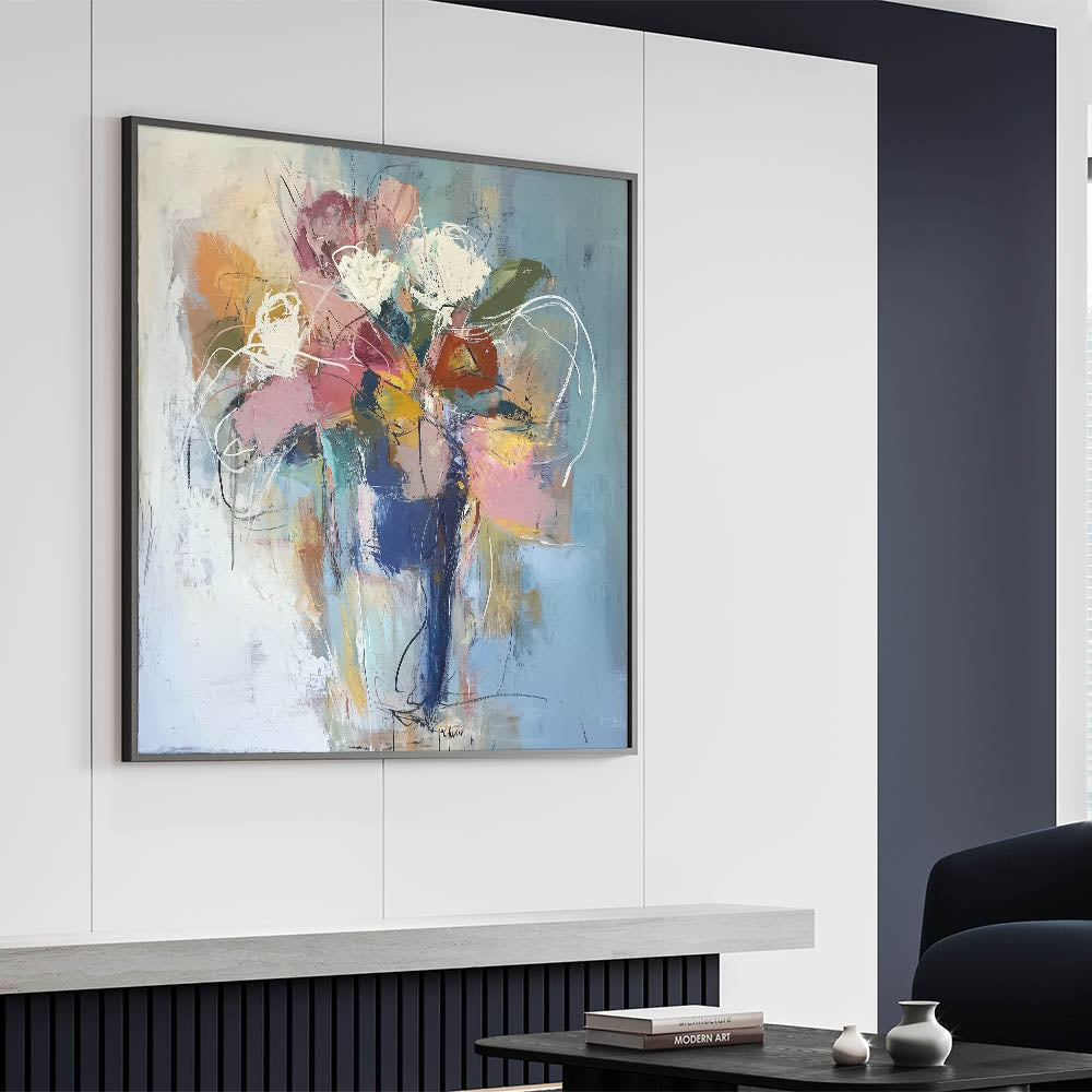 Elevate your space with the lively charm of the Spring Bloom Abstract Floral Wall Art. This expressive artwork features a vibrant bouquet of abstract flowers in shades of pink, orange, yellow, and white, set against a textured, pastel blue background. The dynamic brushstrokes and whimsical lines create a sense of movement and creativity, making it a captivating addition to contemporary, eclectic, or boho-inspired interiors.