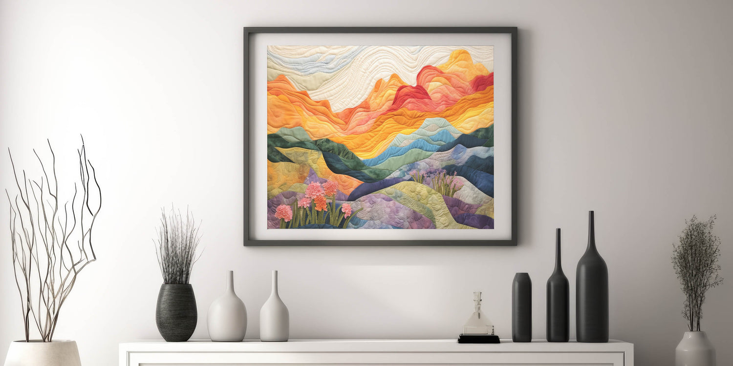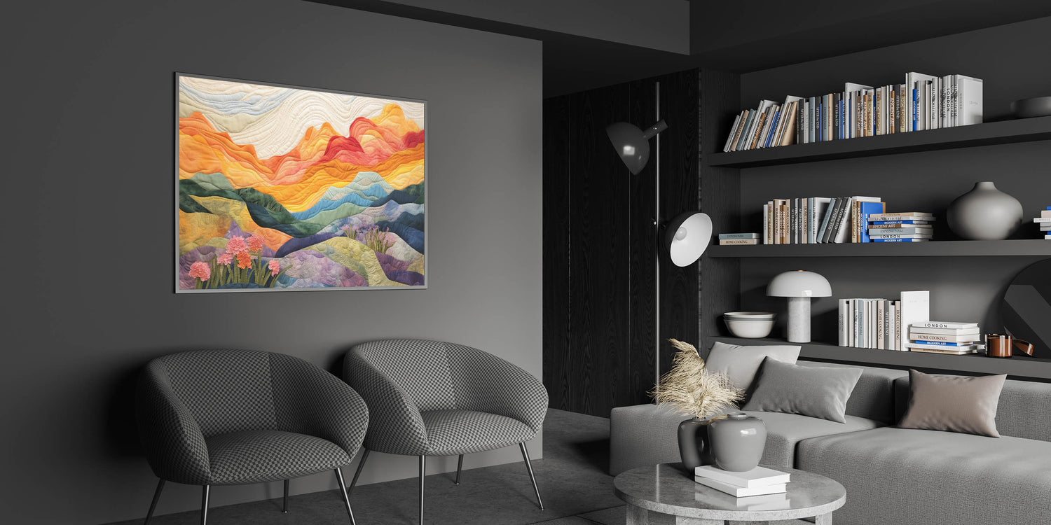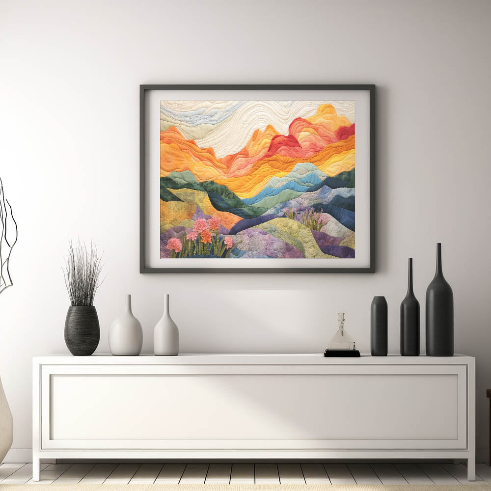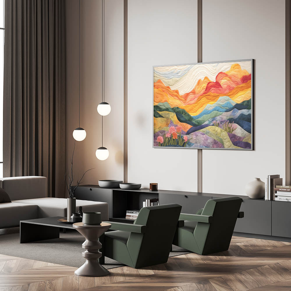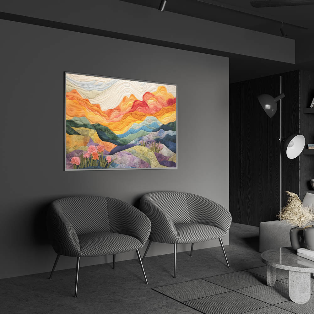 This vibrant design features flowing waves of orange, red, and yellow that cascade over lush hills of green, blue, and purple.