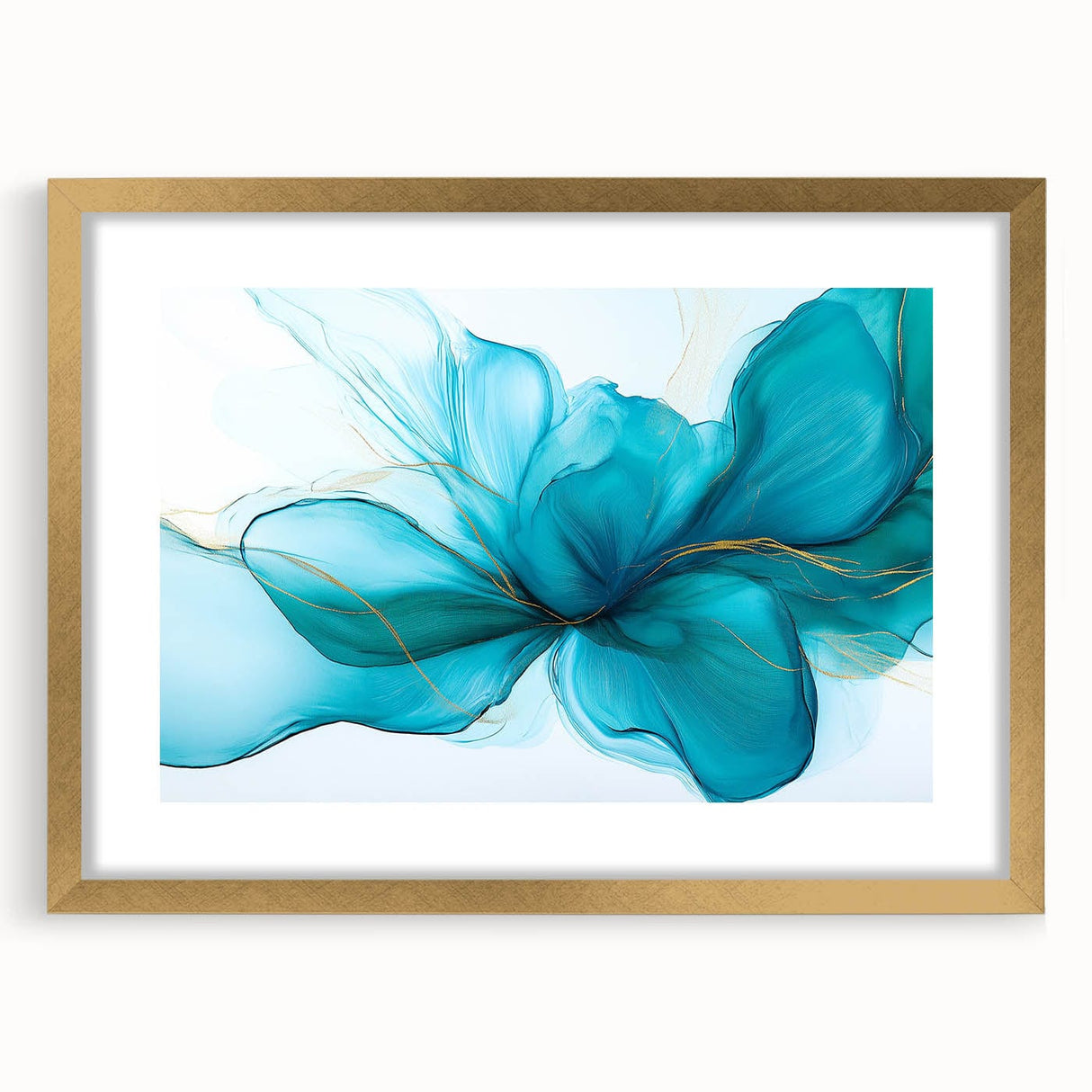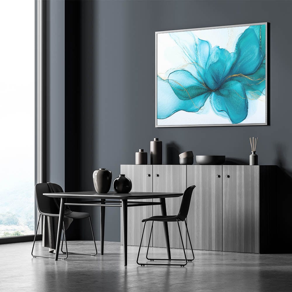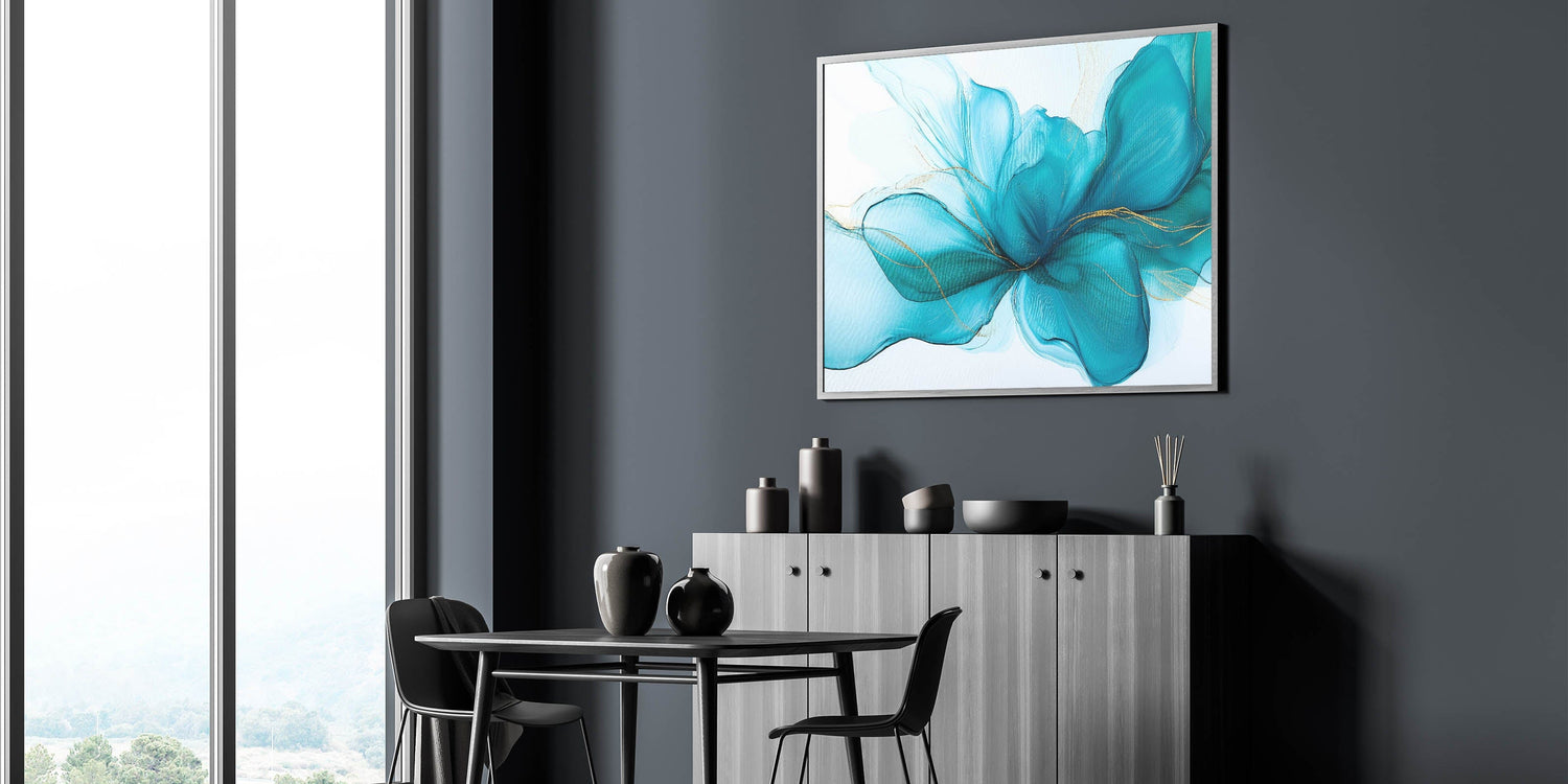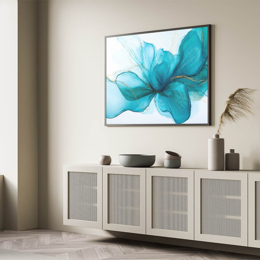 Grace your walls with the soft elegance of this teal and gold fluid abstract wall art. Flowing like silk in water, the composition captures a serene energy through delicate teal hues, vibrant turquoise undertones, and subtle gold highlights. This modern fluid art piece adds both tranquility and sophistication to any space.