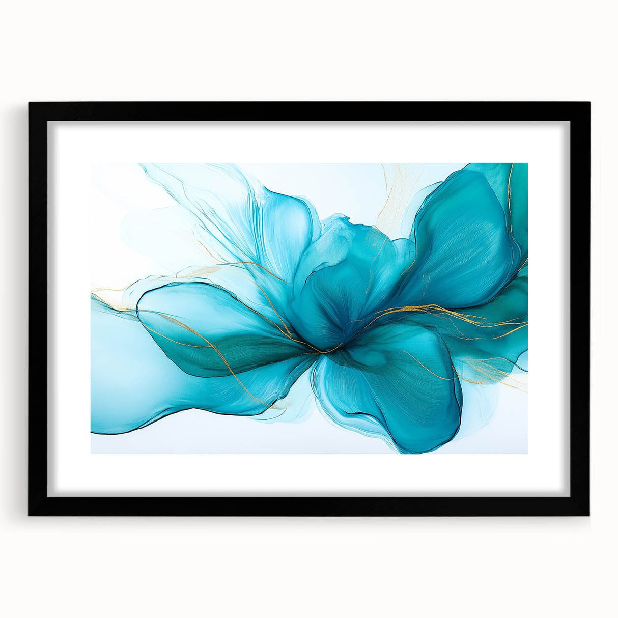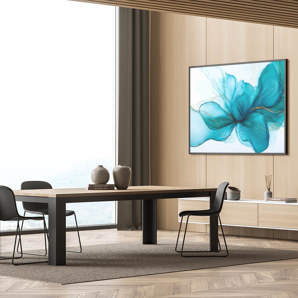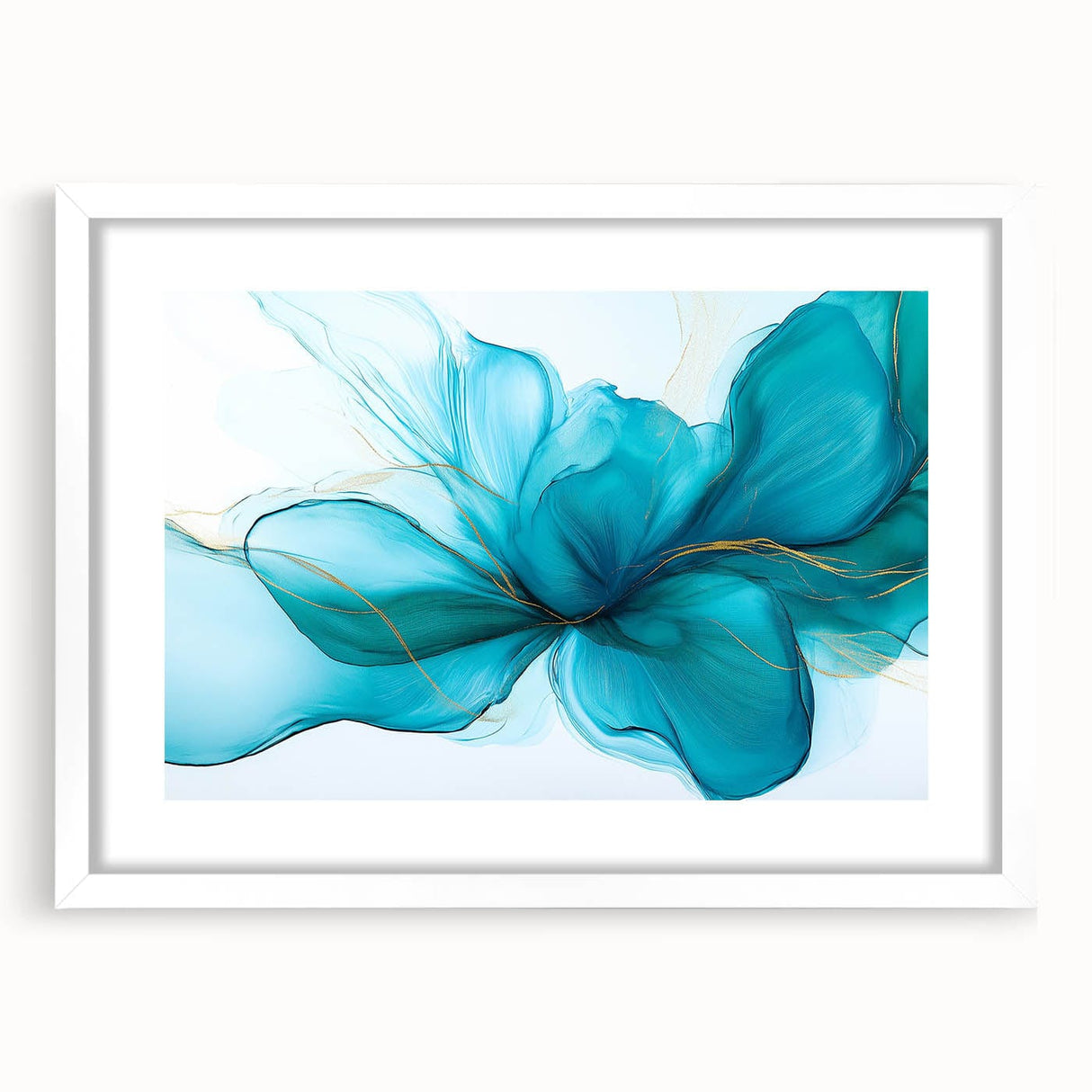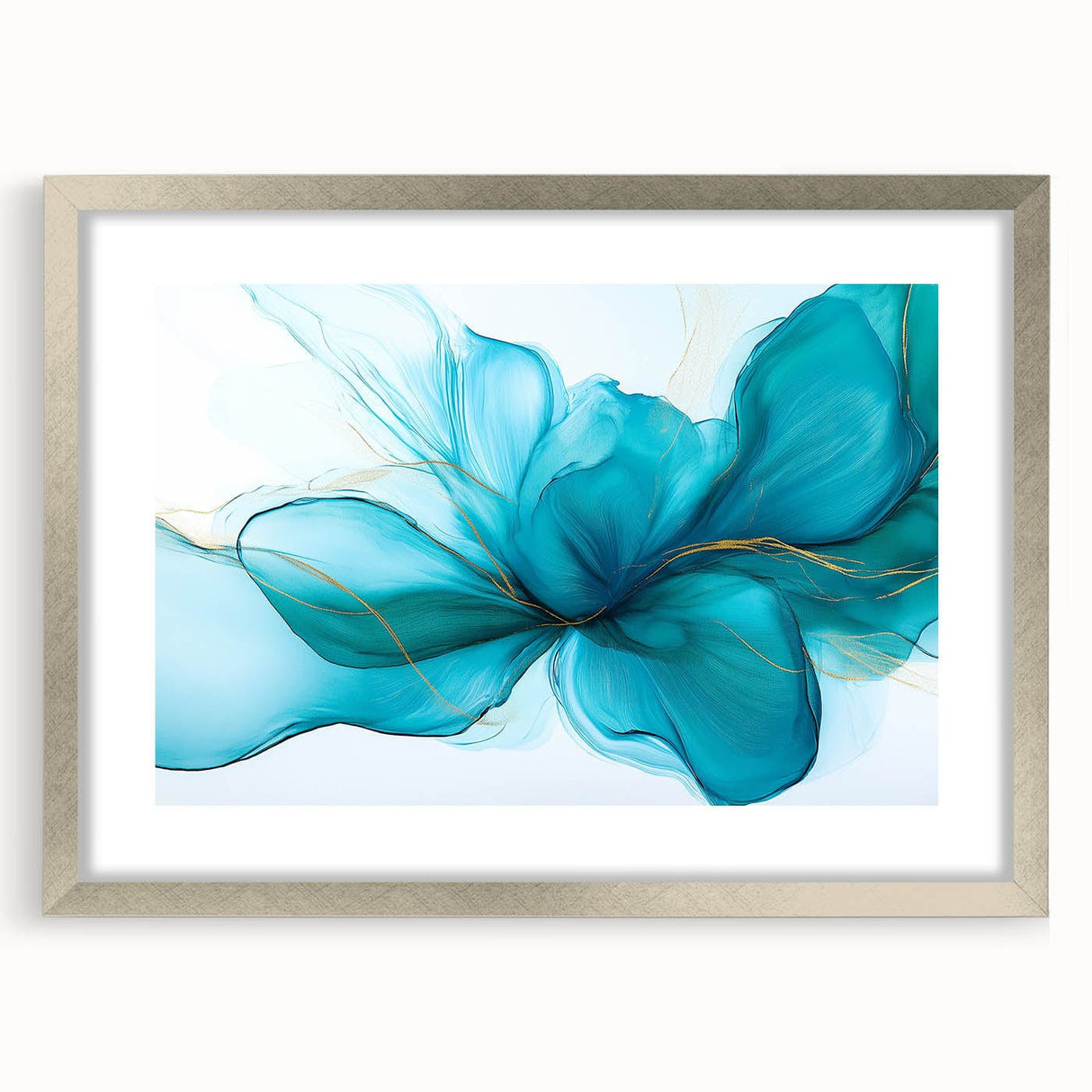 Grace your walls with the soft elegance of this teal and gold fluid abstract wall art. Flowing like silk in water, the composition captures a serene energy through delicate teal hues, vibrant turquoise undertones, and subtle gold highlights. This modern fluid art piece adds both tranquility and sophistication to any space.