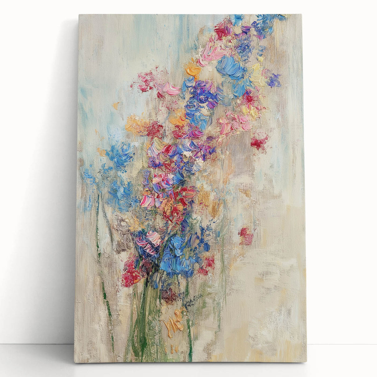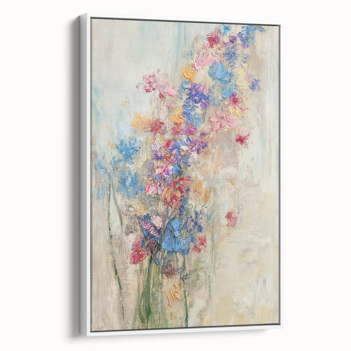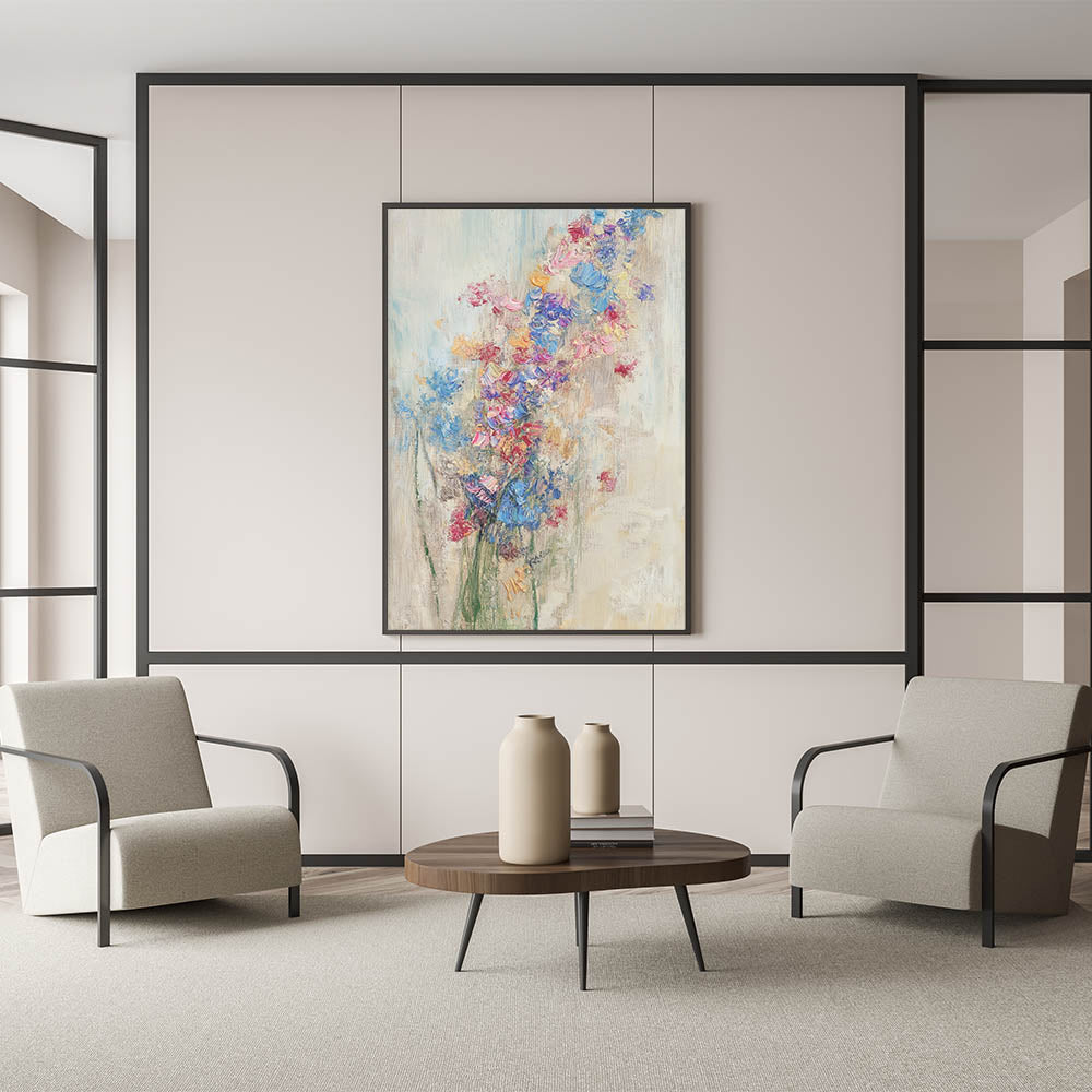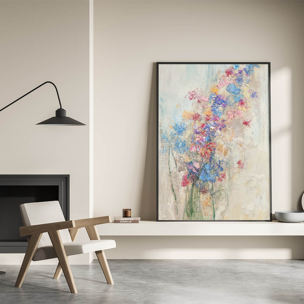 Enhance your space with this abstract floral artwork for home decor, featuring a vibrant bouquet of flowers painted with rich texture and expressive brushstrokes. This modern flower abstract painting blends soft blue, pink, and beige hues to create a delicate yet bold statement piece. The textured paint application adds depth and movement, making this contemporary botanical canvas print a visually striking addition to any space.