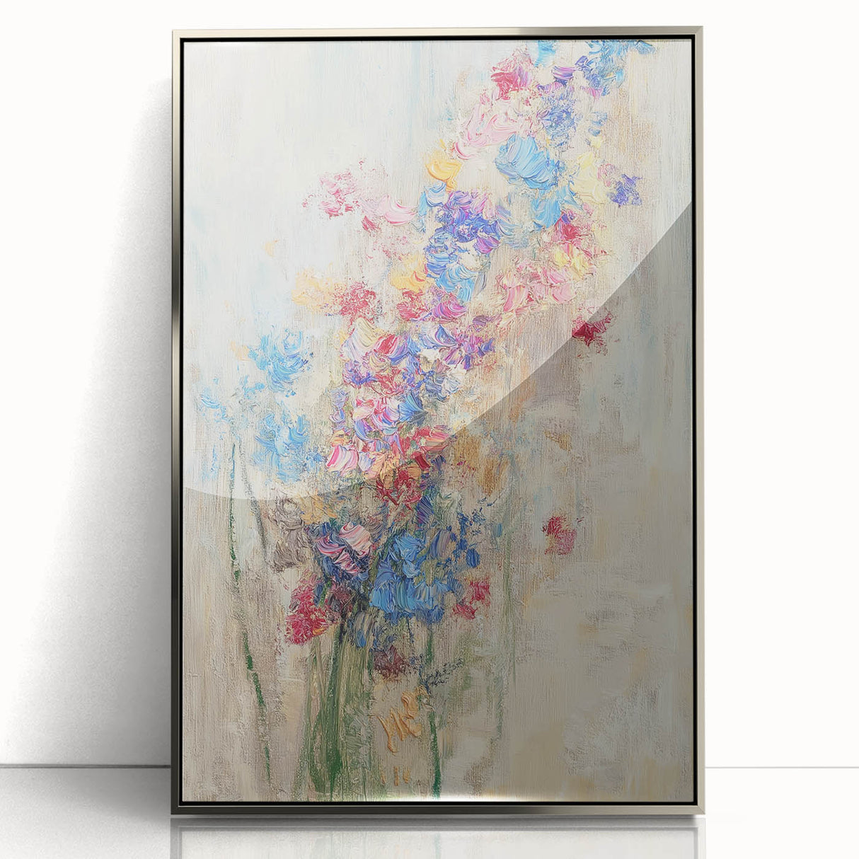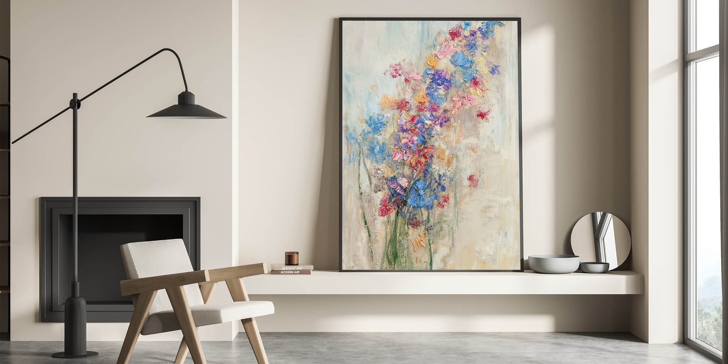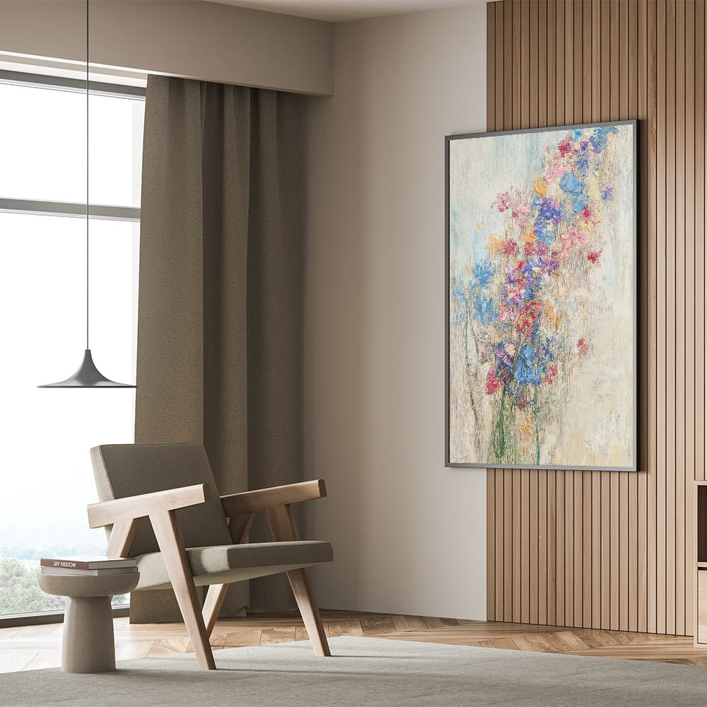 Enhance your space with this abstract floral artwork for home decor, featuring a vibrant bouquet of flowers painted with rich texture and expressive brushstrokes. This modern flower abstract painting blends soft blue, pink, and beige hues to create a delicate yet bold statement piece. The textured paint application adds depth and movement, making this contemporary botanical canvas print a visually striking addition to any space.