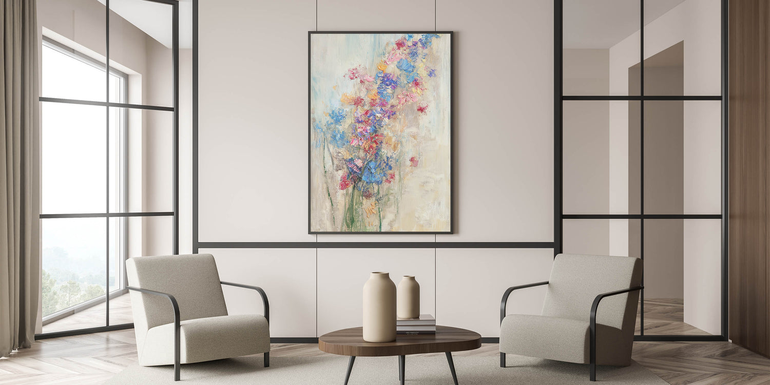 - A soft yet vibrant blend of blue, pink, and beige enhances its large-scale flower abstract art appeal