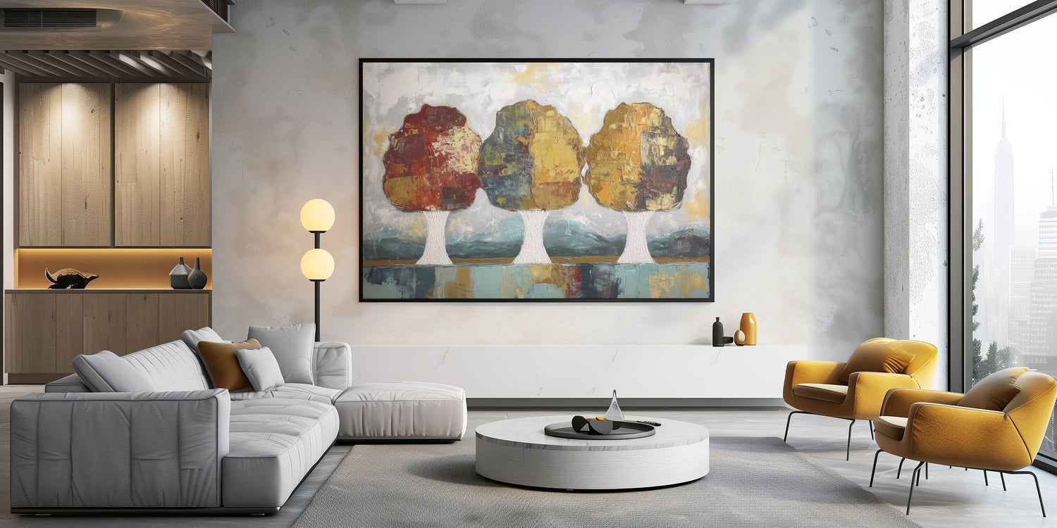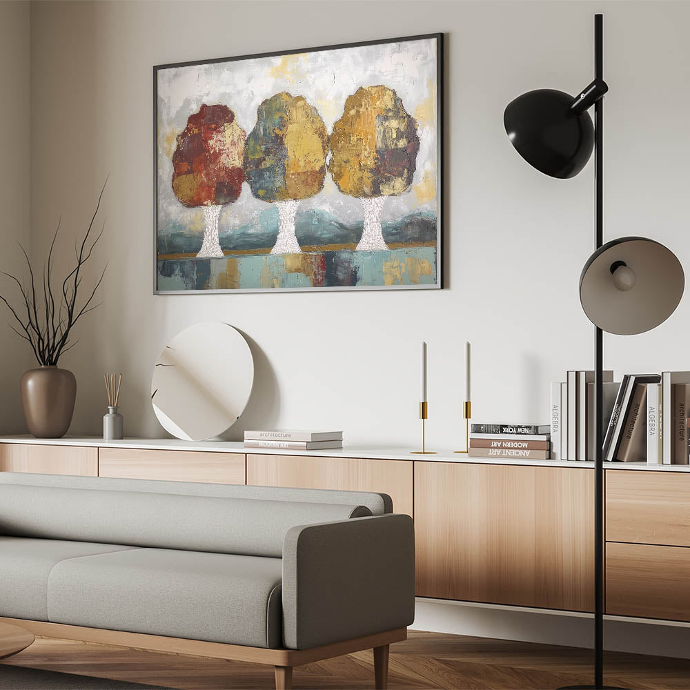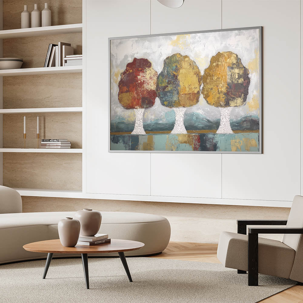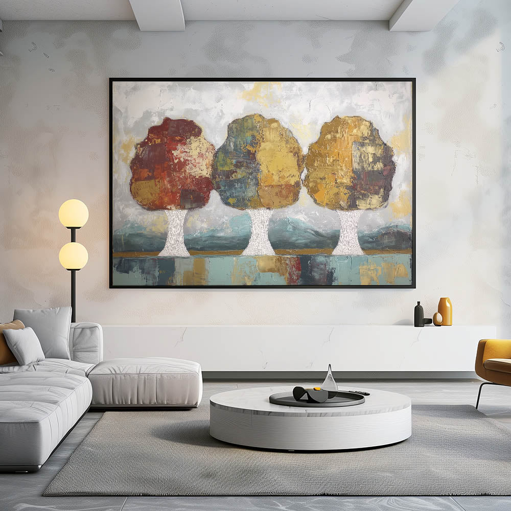 Add a touch of charm and vibrancy to your decor with this stunning abstract artwork featuring three colorful trees. The textured design, showcasing hues of red, gold, and earthy tones against a serene, muted background, exudes a harmonious blend of creativity and nature.