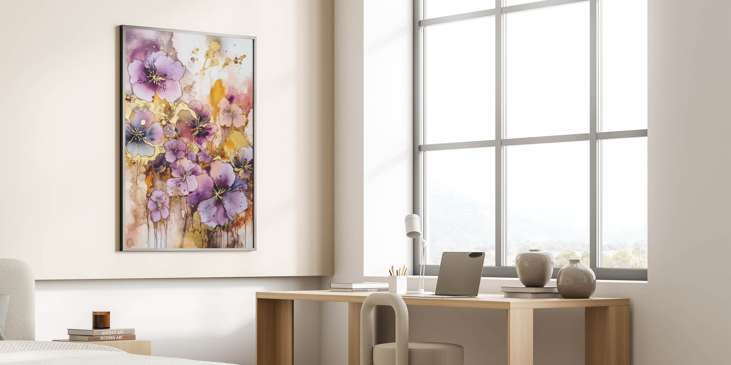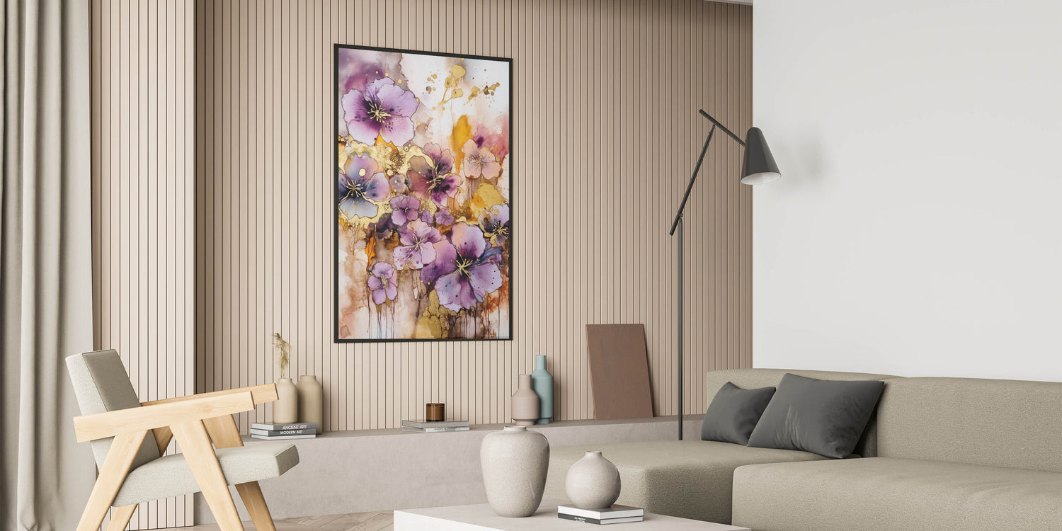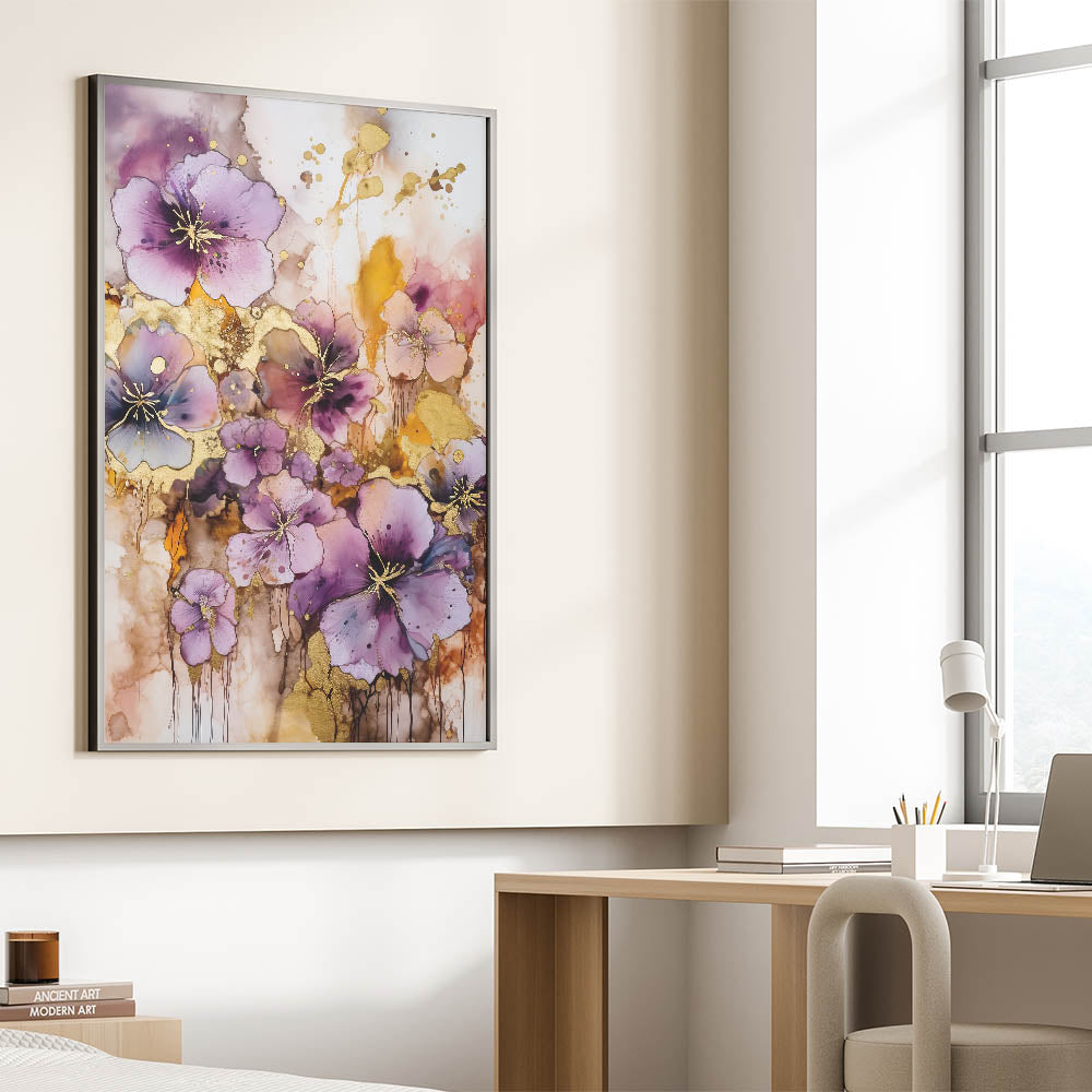 Infuse your space with the vibrant energy of this abstract floral art piece. Bursting with lush purple blooms accented by shimmering gold highlights, this design captures the beauty of nature in an artistic and contemporary style. The dynamic blend of rich colors and flowing patterns creates a captivating focal point for any room.