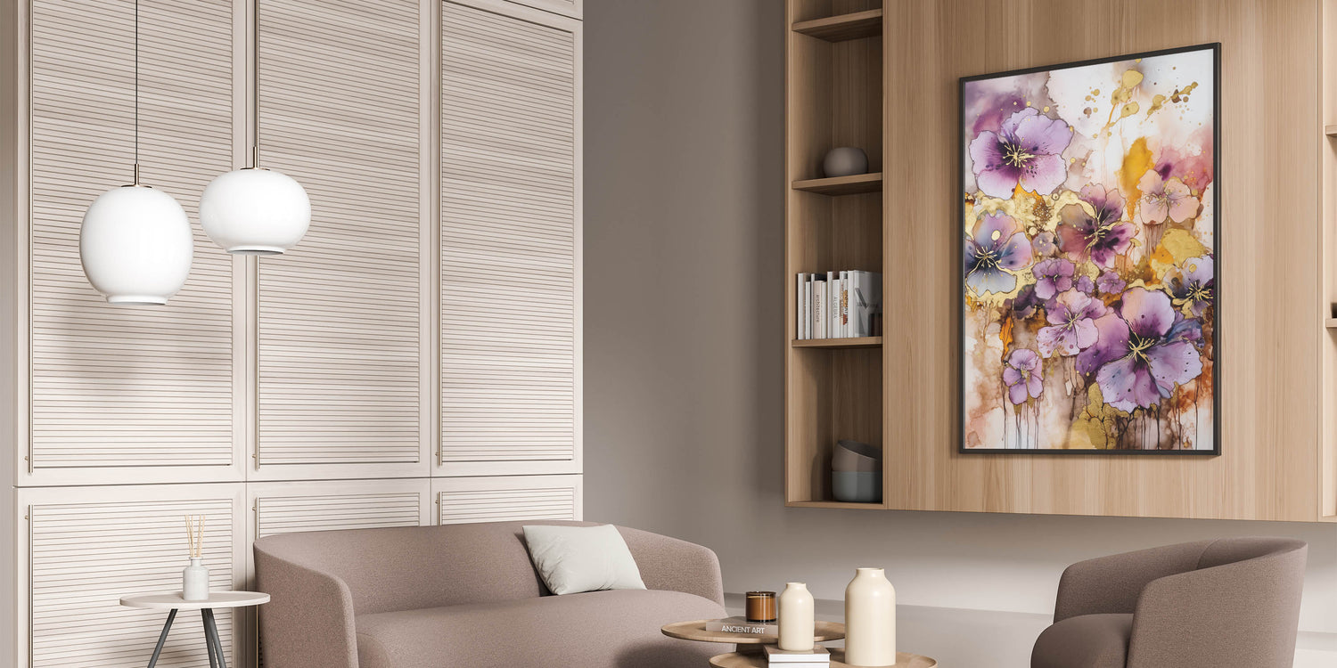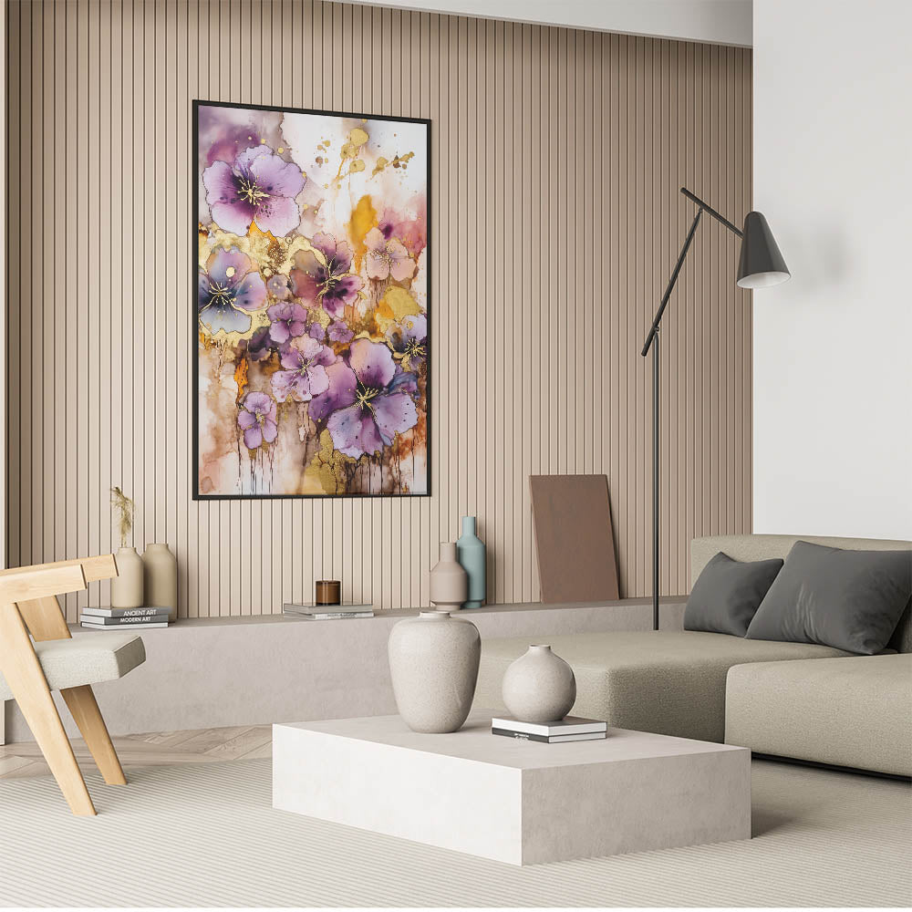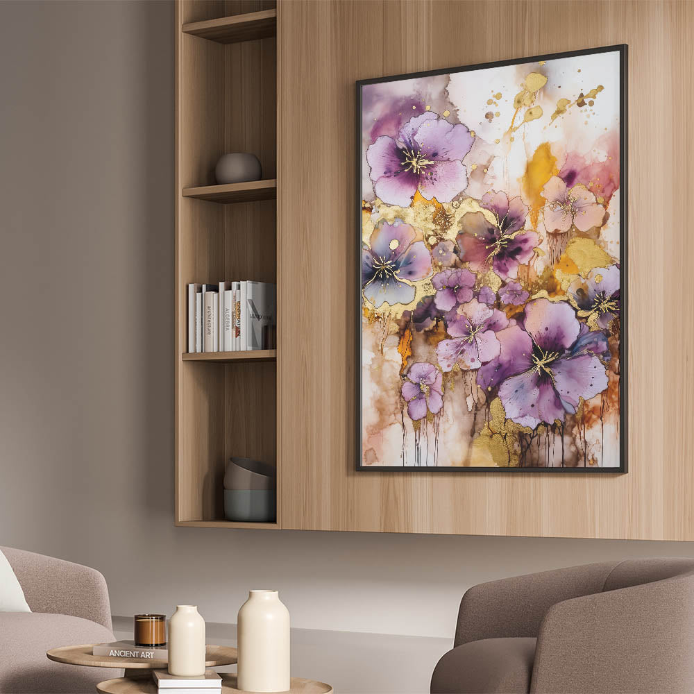 Infuse your space with the vibrant energy of this abstract floral art piece. Bursting with lush purple blooms accented by shimmering gold highlights, this design captures the beauty of nature in an artistic and contemporary style. The dynamic blend of rich colors and flowing patterns creates a captivating focal point for any room.