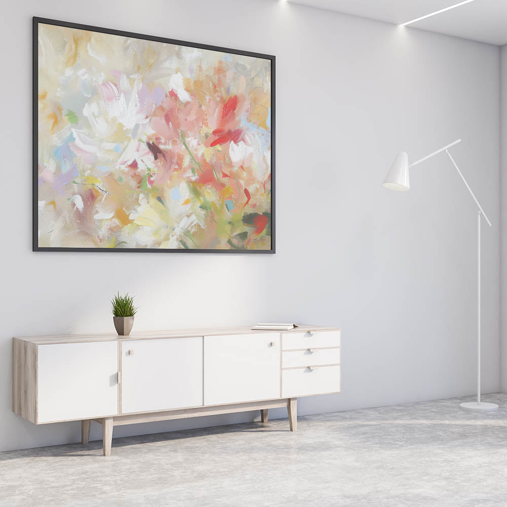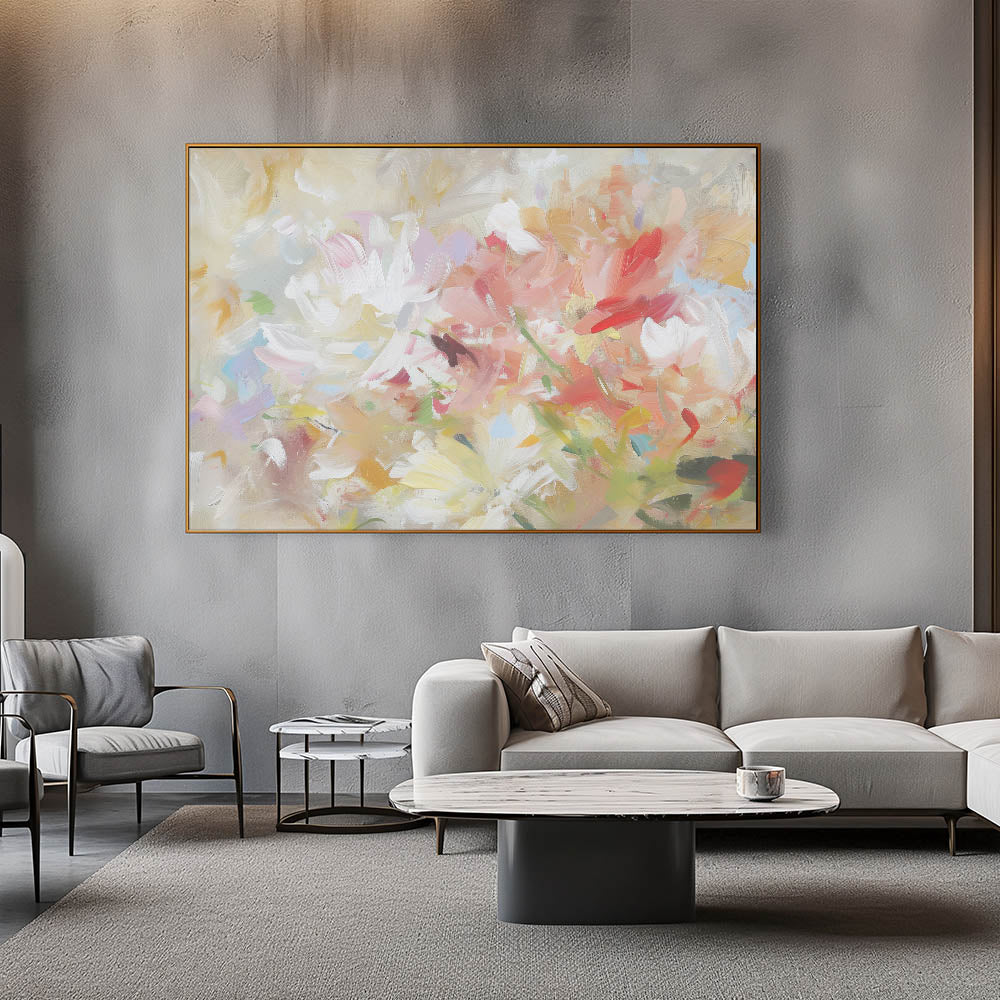 Brighten your space with this vibrant abstract floral artwork, a celebration of color and movement. Featuring a lively composition of soft pastels, bold reds, and subtle greens, this piece captures the essence of a blooming garden in an artistic and modern style. The dynamic brushstrokes and vibrant hues make it a perfect centerpiece for living rooms, dining areas, or workspaces, bringing energy and charm to any setting.
