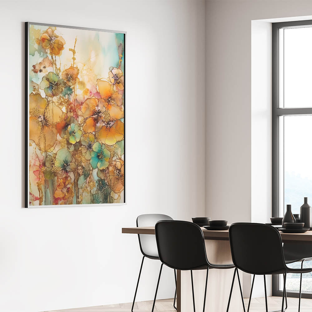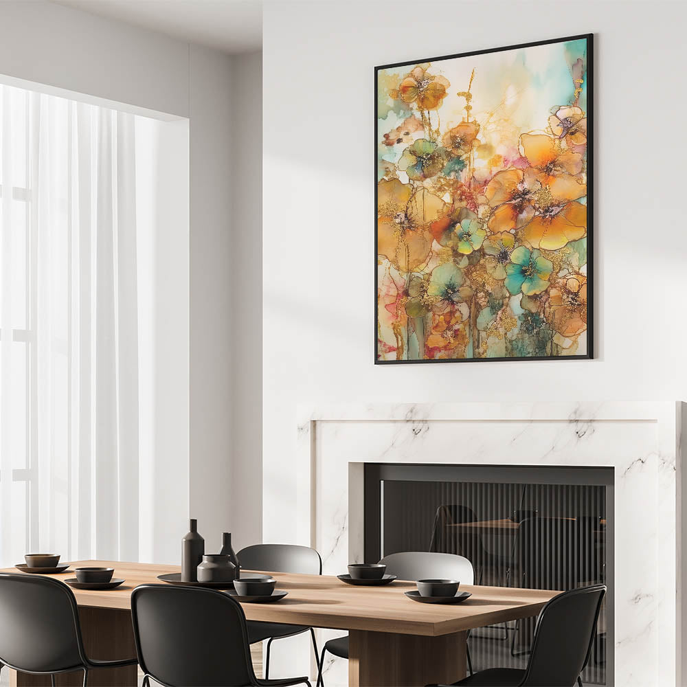 Bring nature's vibrant beauty indoors with this exquisite abstract floral art piece. Featuring bold splashes of orange, teal, and gold, this artwork radiates warmth and energy, making it an ideal choice for brightening any space. The intricate floral patterns are delicately outlined, creating a harmonious blend of modern artistry and natural elegance.