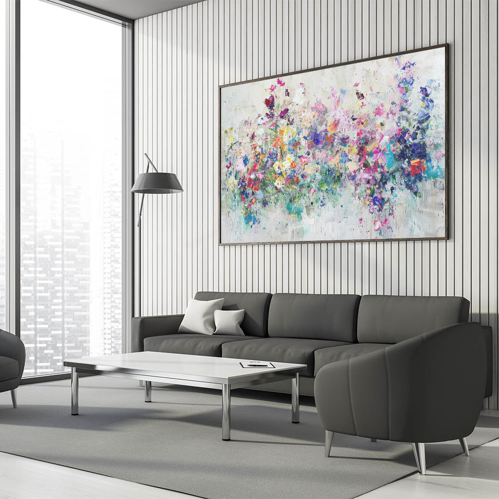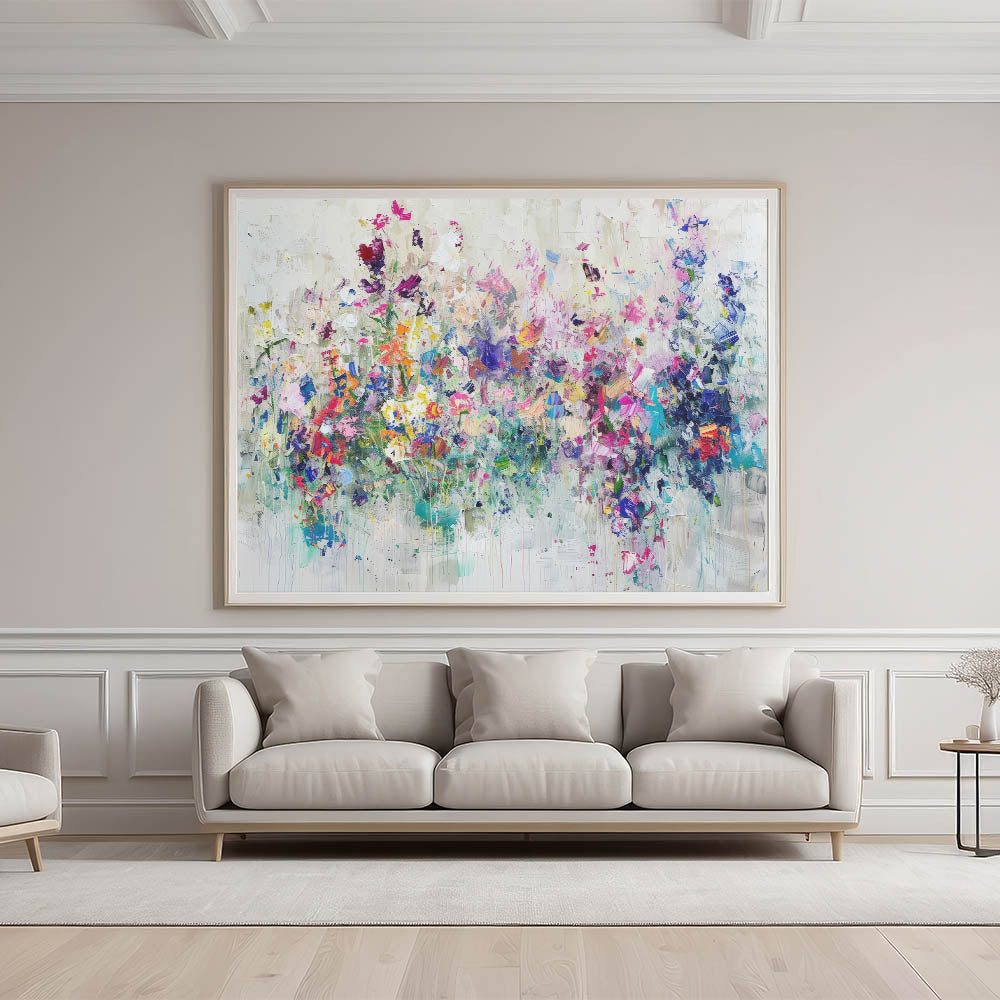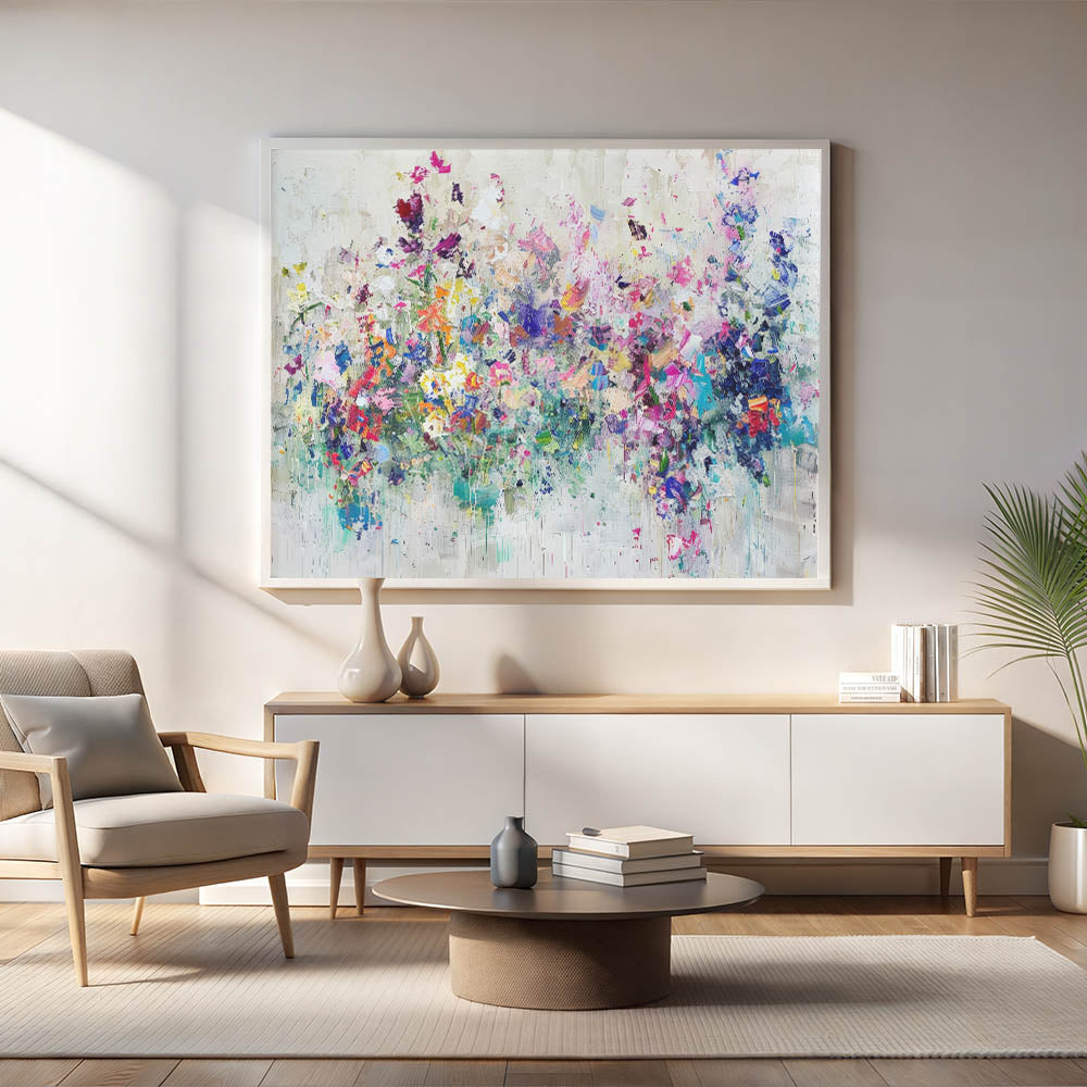 Bring the essence of nature and creativity into your home with this Vibrant Abstract Splatter Art. This stunning floral-inspired artwork features a harmonious explosion of colors, including pink, purple, blue, and green, all blending seamlessly into a textured, contemporary design. Perfect for modern spaces, it adds a touch of boldness and elegance to any wall.