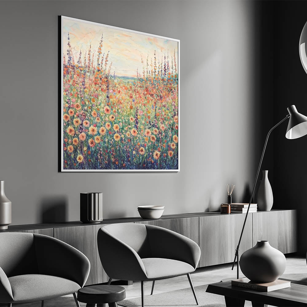 Bring the beauty of nature into your home with this Vibrant Floral Meadow Canvas Art. Featuring a colorful array of abstract flowers, this design captures the essence of a blooming meadow. The warm tones of orange, pink, and yellow blend seamlessly with the cool greens and blues, creating a serene and captivating scene. This artwork is perfect for adding a touch of elegance and warmth to living rooms, bedrooms, or office spaces.