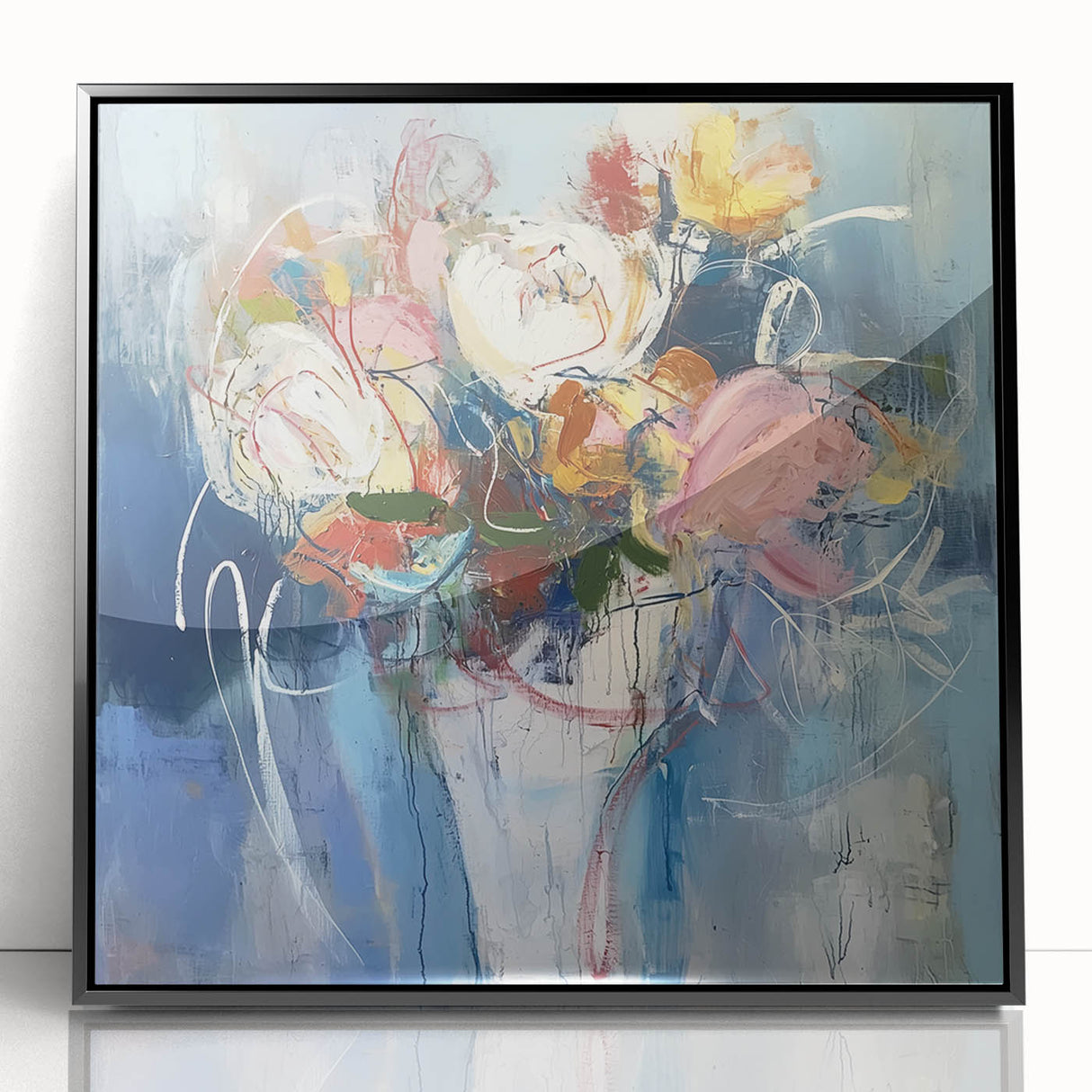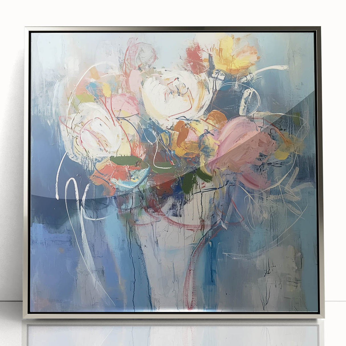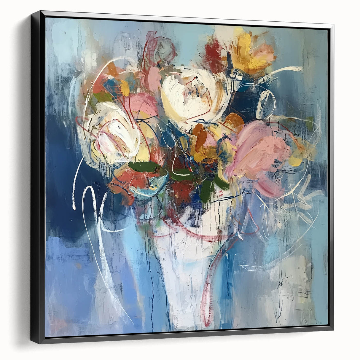 Bring a splash of color and creativity to your space with the Vibrant Harmony Abstract Floral Wall Art. This expressive design features a bouquet of abstract flowers in lively shades of pink, yellow, green, and white, set against a textured, pastel blue background. The energetic brushstrokes and swirling lines create a sense of movement and vibrancy, making it a captivating centerpiece for contemporary, eclectic, or modern interiors.