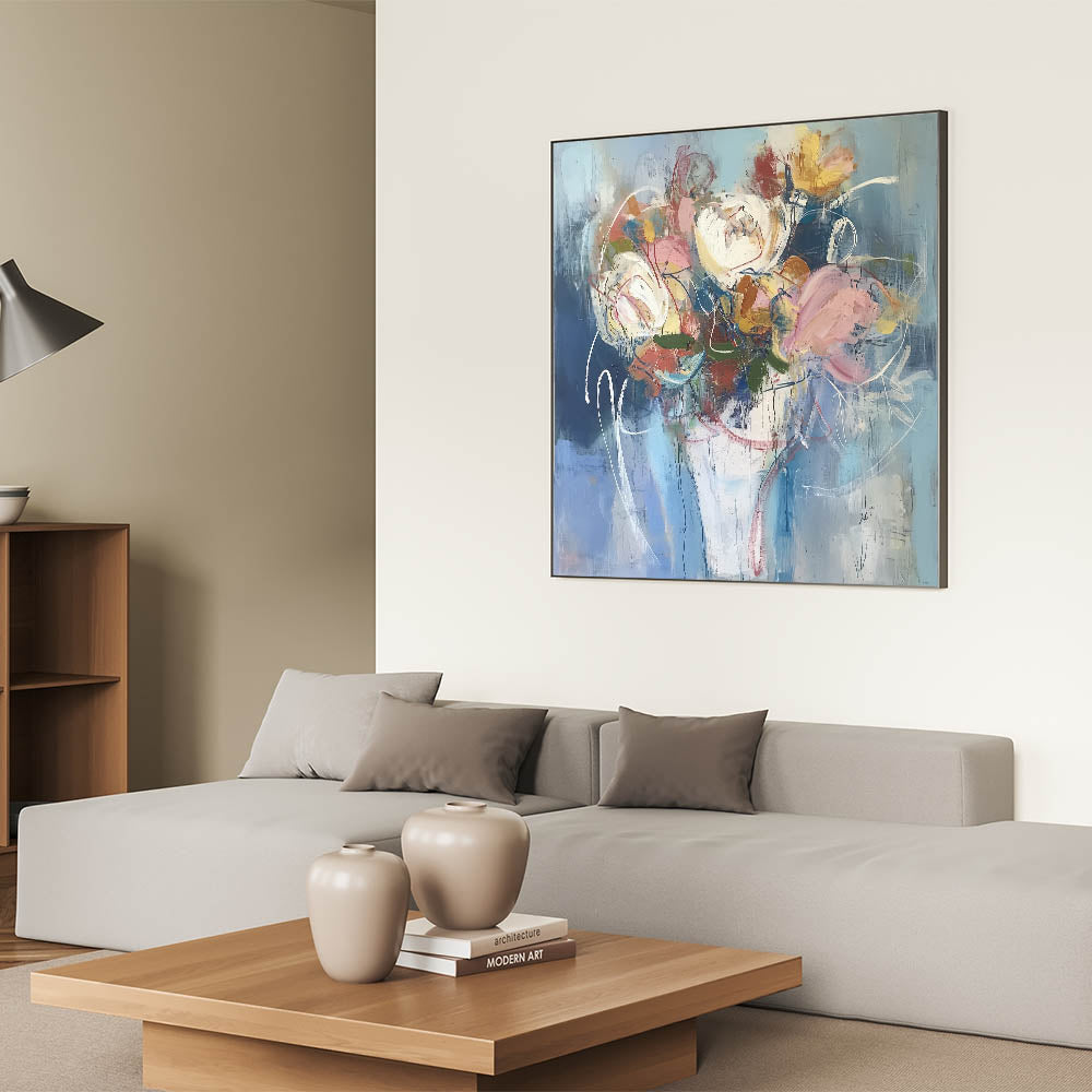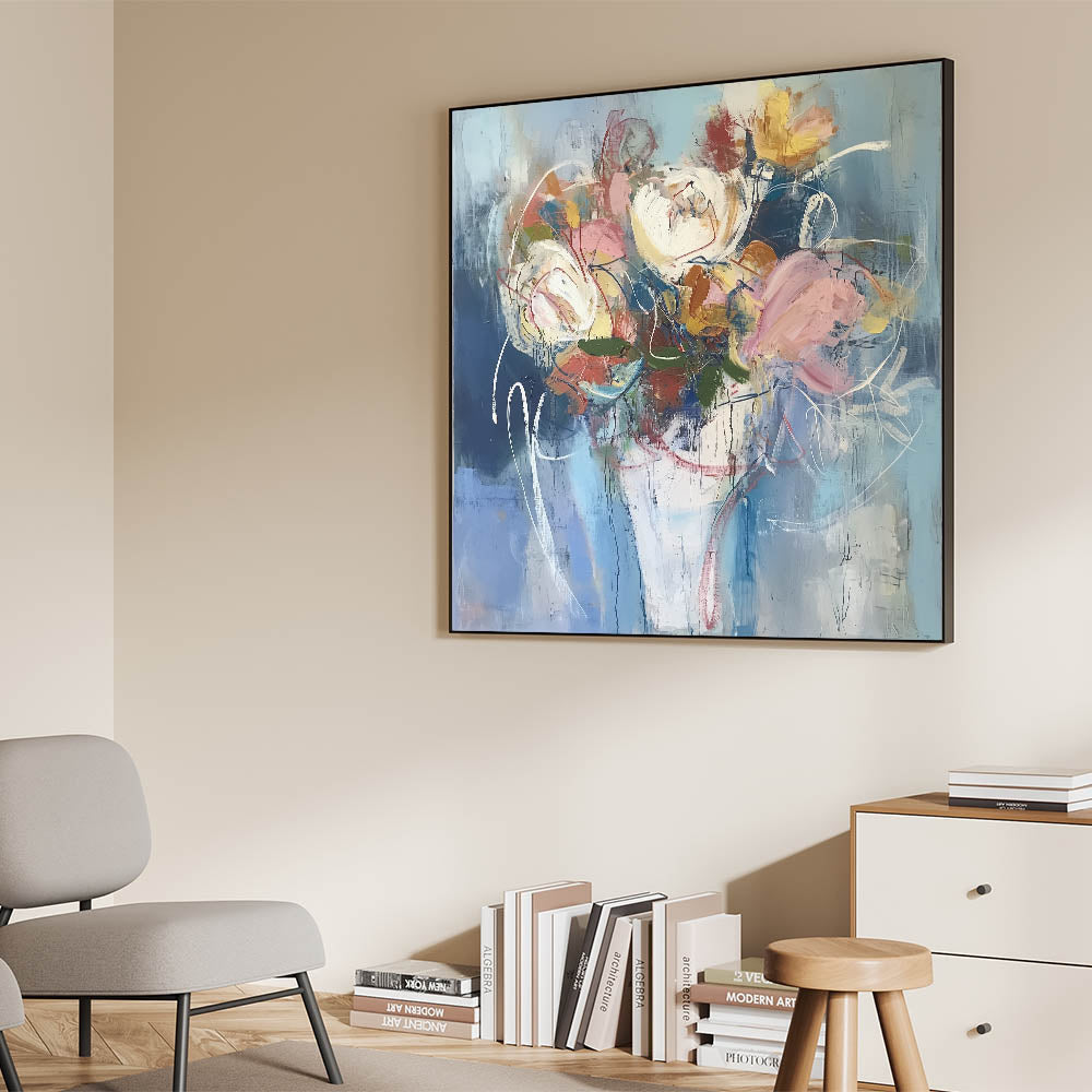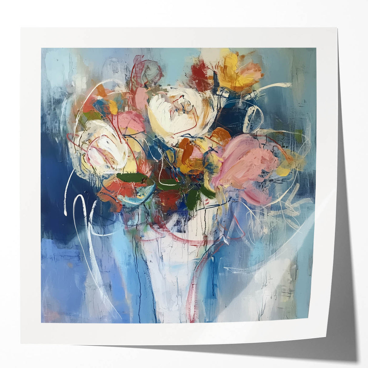 Bring a splash of color and creativity to your space with the Vibrant Harmony Abstract Floral Wall Art. This expressive design features a bouquet of abstract flowers in lively shades of pink, yellow, green, and white, set against a textured, pastel blue background. The energetic brushstrokes and swirling lines create a sense of movement and vibrancy, making it a captivating centerpiece for contemporary, eclectic, or modern interiors.