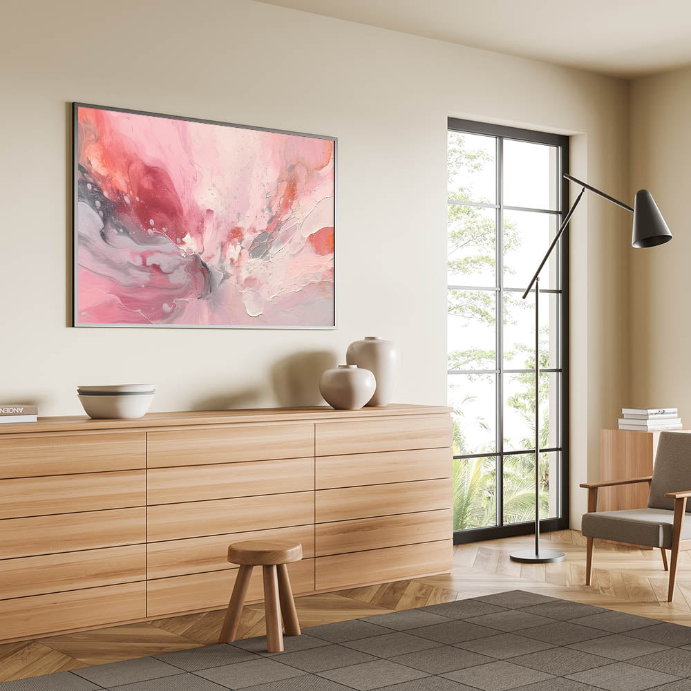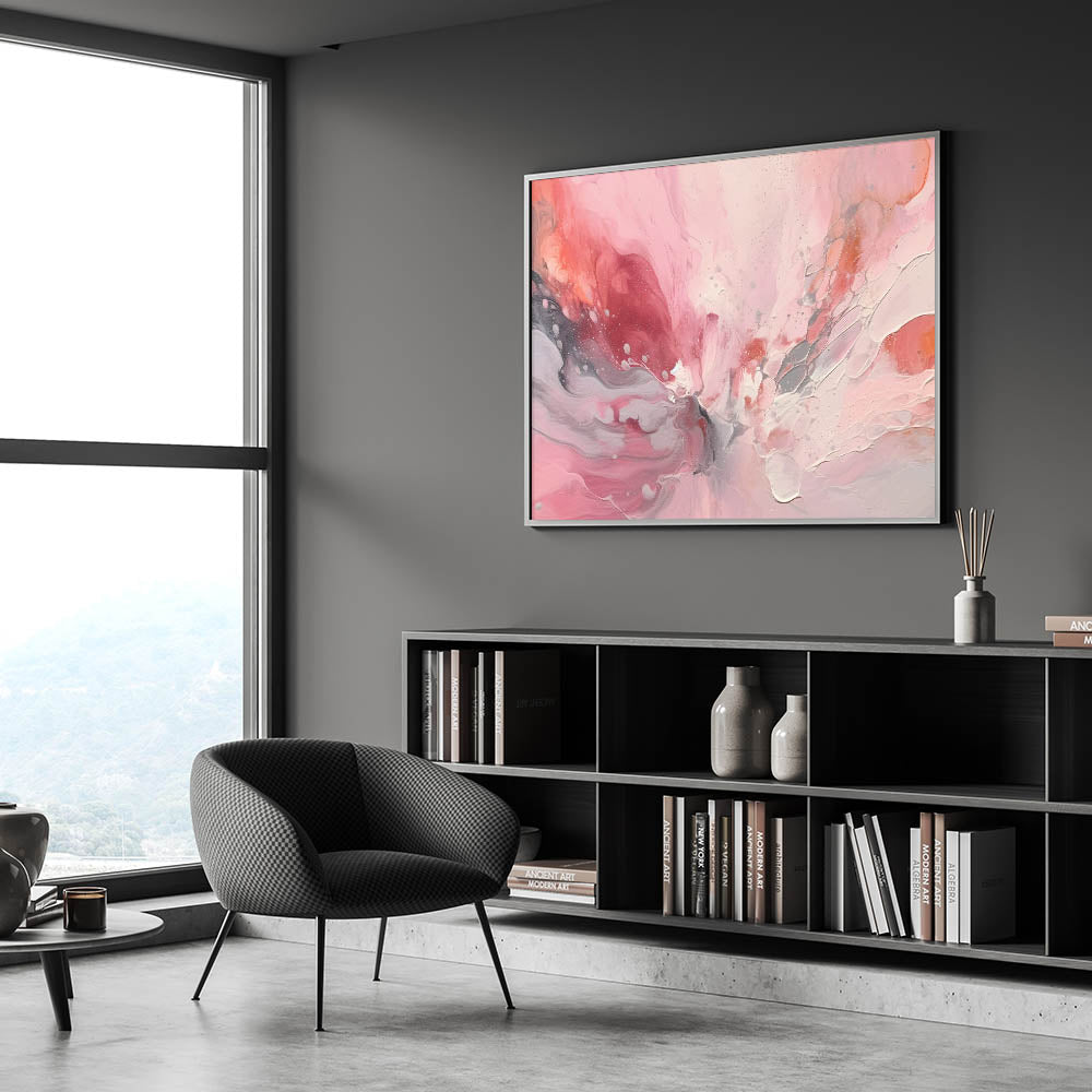Immerse yourself in the energetic flow of this vibrant pink and coral abstract art piece. The fluid brushstrokes feature a dynamic palette of bright pinks, coral, blush, and soft gray, blending together to create a mesmerizing swirl of colors. The delicate gradients and swirling patterns evoke a sense of movement and playfulness, making this canvas print a stunning focal point for any room.
