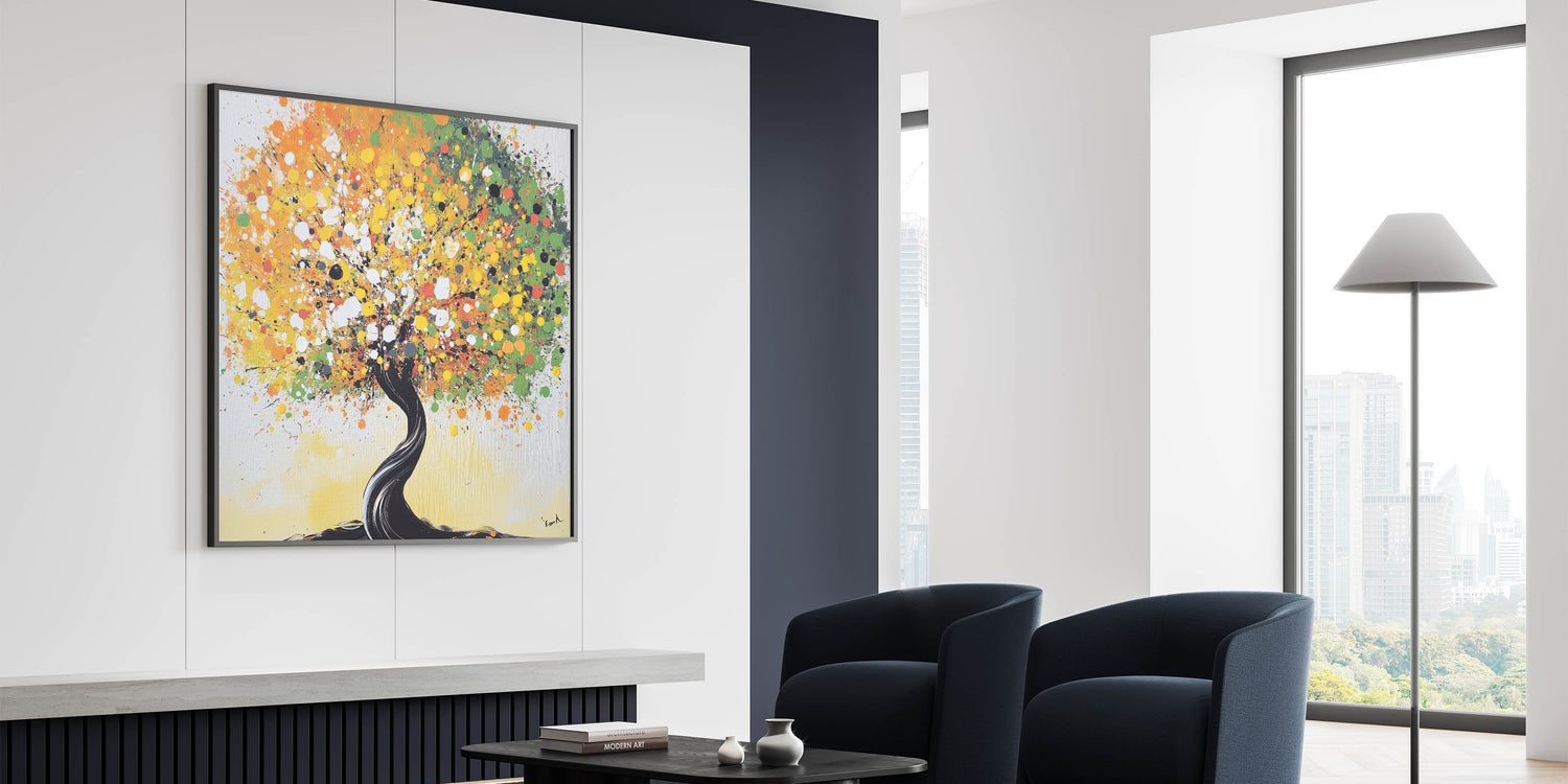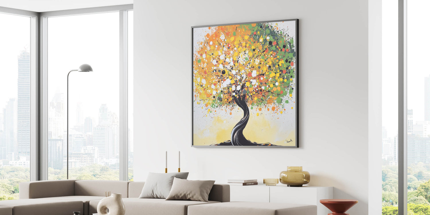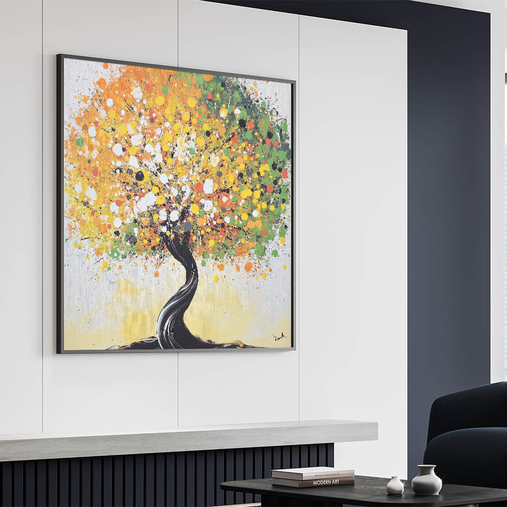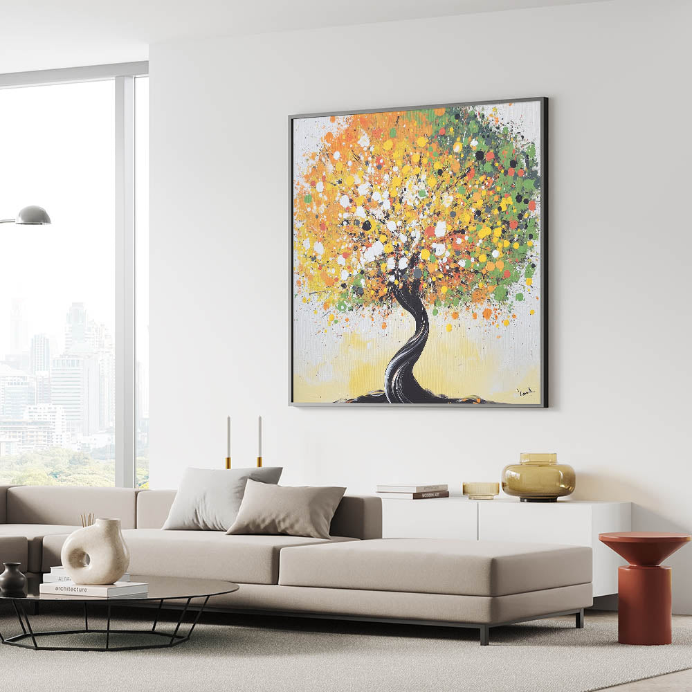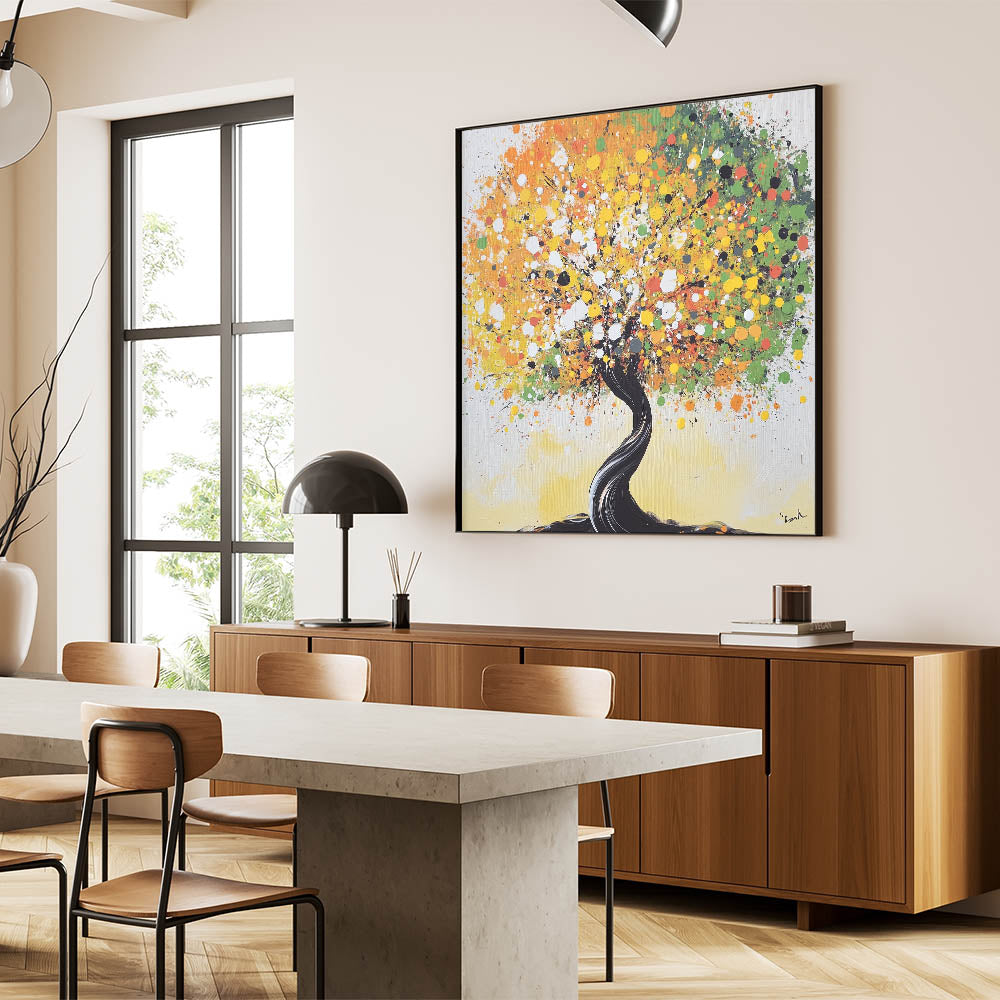 Bring a lively touch to your home with this abstract tree art, featuring a vibrant explosion of yellow, green, and orange tones. The dynamic swirls of colors create a cheerful and eye-catching design, while the twisting black trunk adds a striking contrast. Perfect for modern or eclectic interiors, this artwork symbolizes life and energy, making it an uplifting addition to your space.