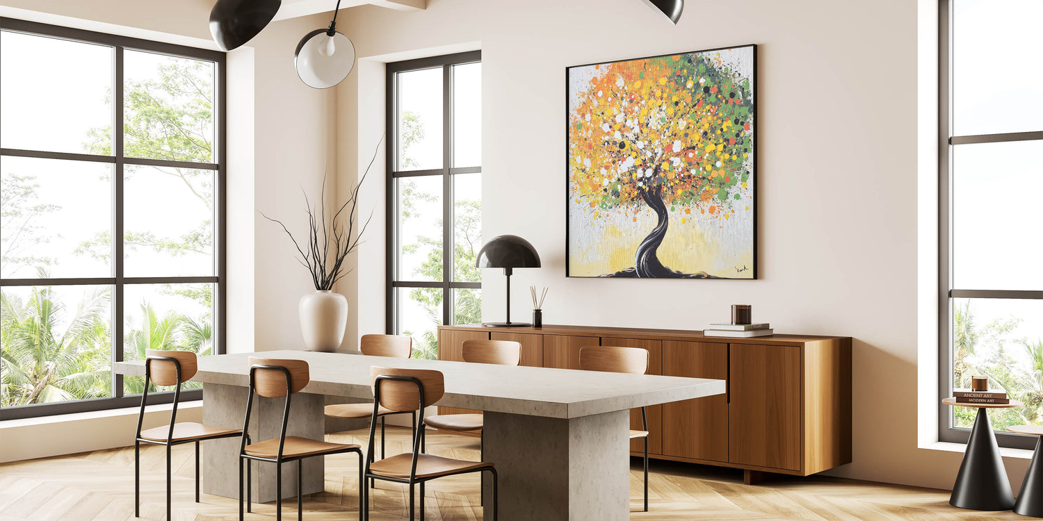 This modern abstract art celebrates nature in a colorful, contemporary style. Whether displayed in a vibrant or minimalist room, this piece will energize your decor and create a warm, inviting atmosphere. Its playful composition and rich hues make it a standout artwork for any setting.