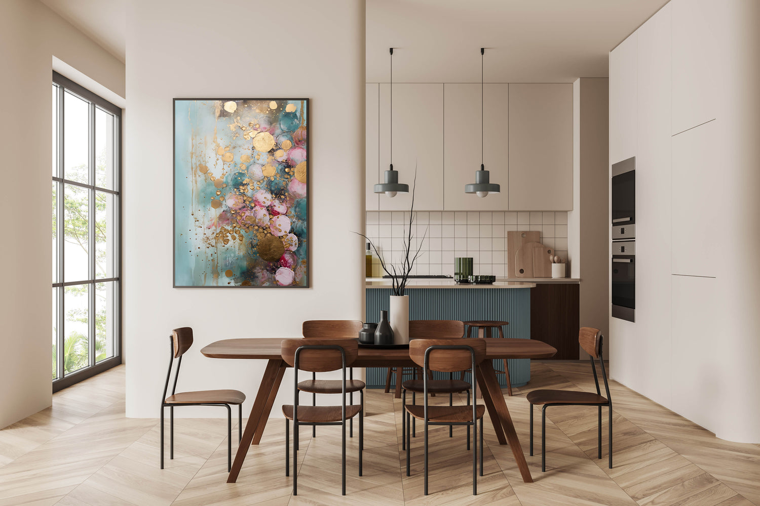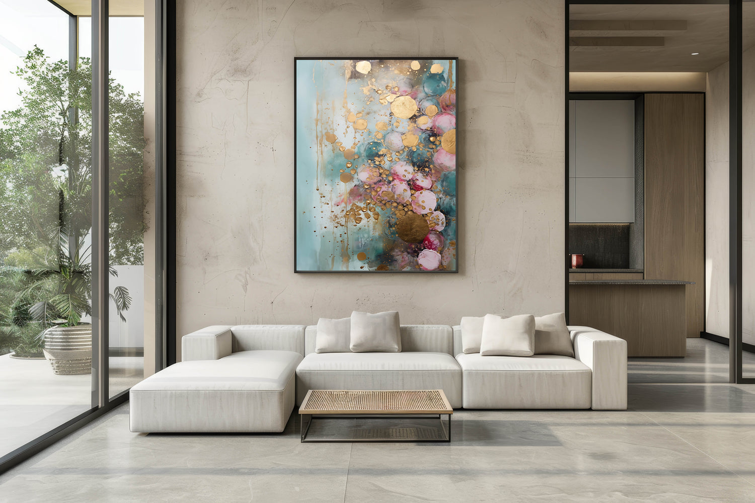 Bring a touch of whimsy and elegance to your space with this stunning abstract artwork. The design features a delicate blend of pastel tones, including soft pink, teal, and turquoise, complemented by vibrant gold accents. The circular shapes and dripping paint create a playful, fluid composition, while the metallic gold splashes add a sense of luxury and shine. This piece is perfect for creating a dreamy, uplifting atmosphere in any room.