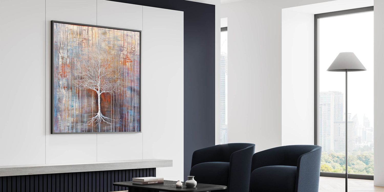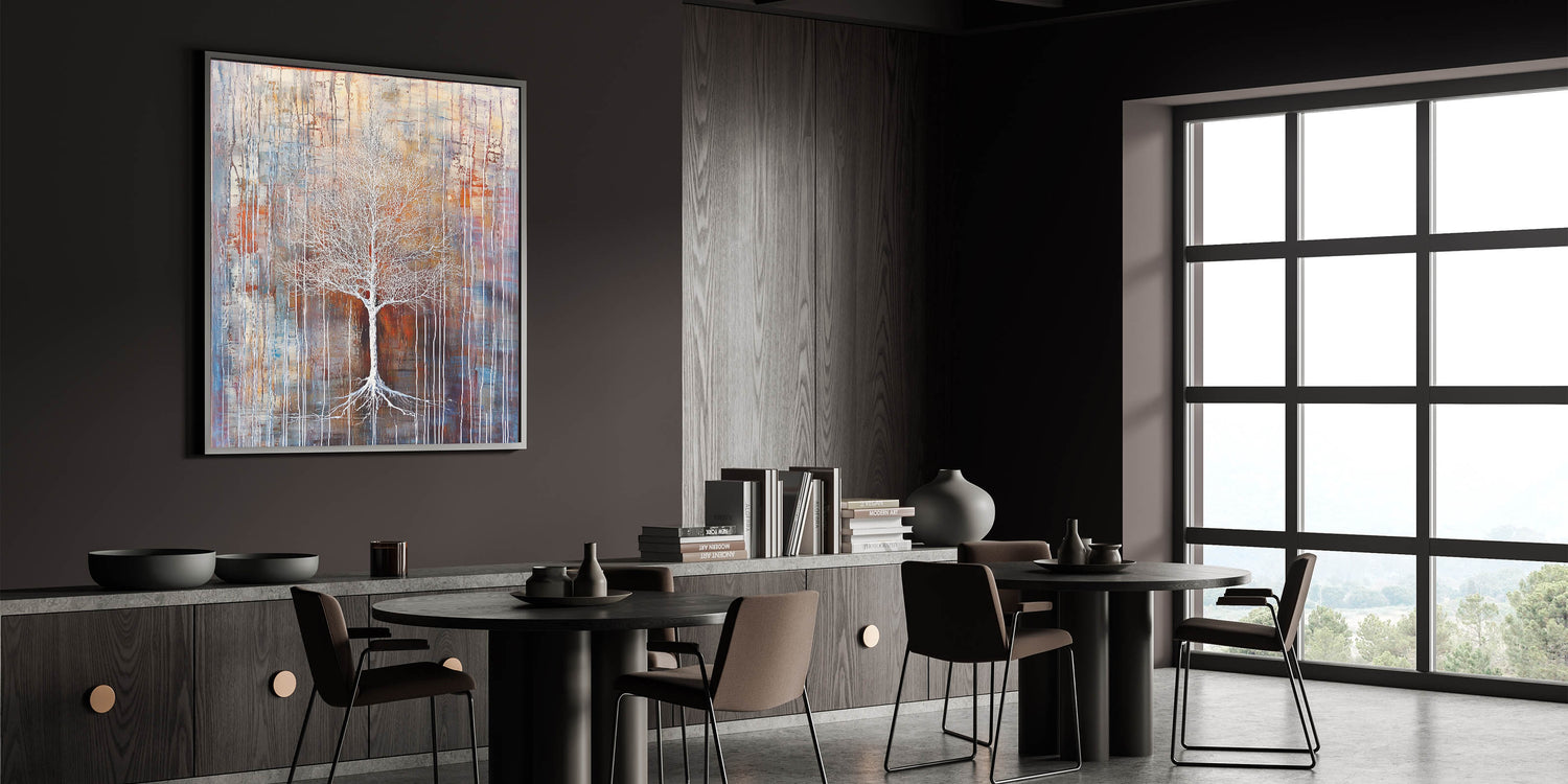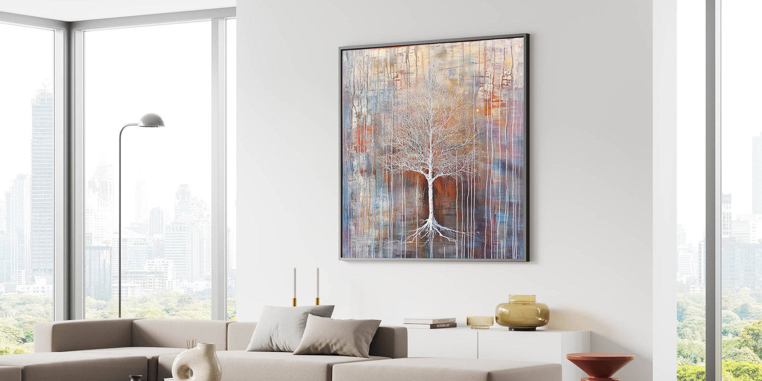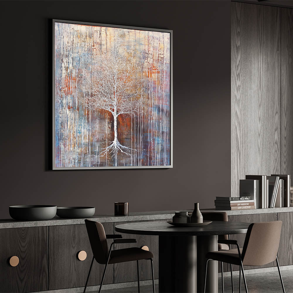 Infuse your space with the beauty of nature and abstract art through this captivating depiction of a white tree of life. Set against an earthy, textured background with streaks of blue, orange, and brown, this artwork embodies harmony and creativity, making it an exceptional choice for both modern and rustic interiors.