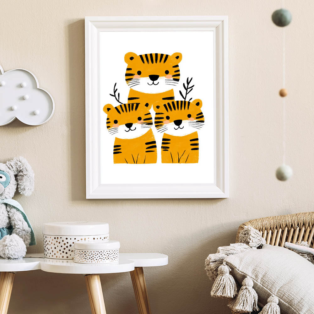 Add a touch of charm to your child’s space with this Adorable Tiger Trio wall art. Featuring three smiling tigers in a soft, hand-drawn style, this artwork brings a warm and playful vibe to boys' bedrooms, nurseries, and playrooms. The bright orange tones and cute facial expressions make it a delightful piece of children's decor, inspiring imagination and happiness.
