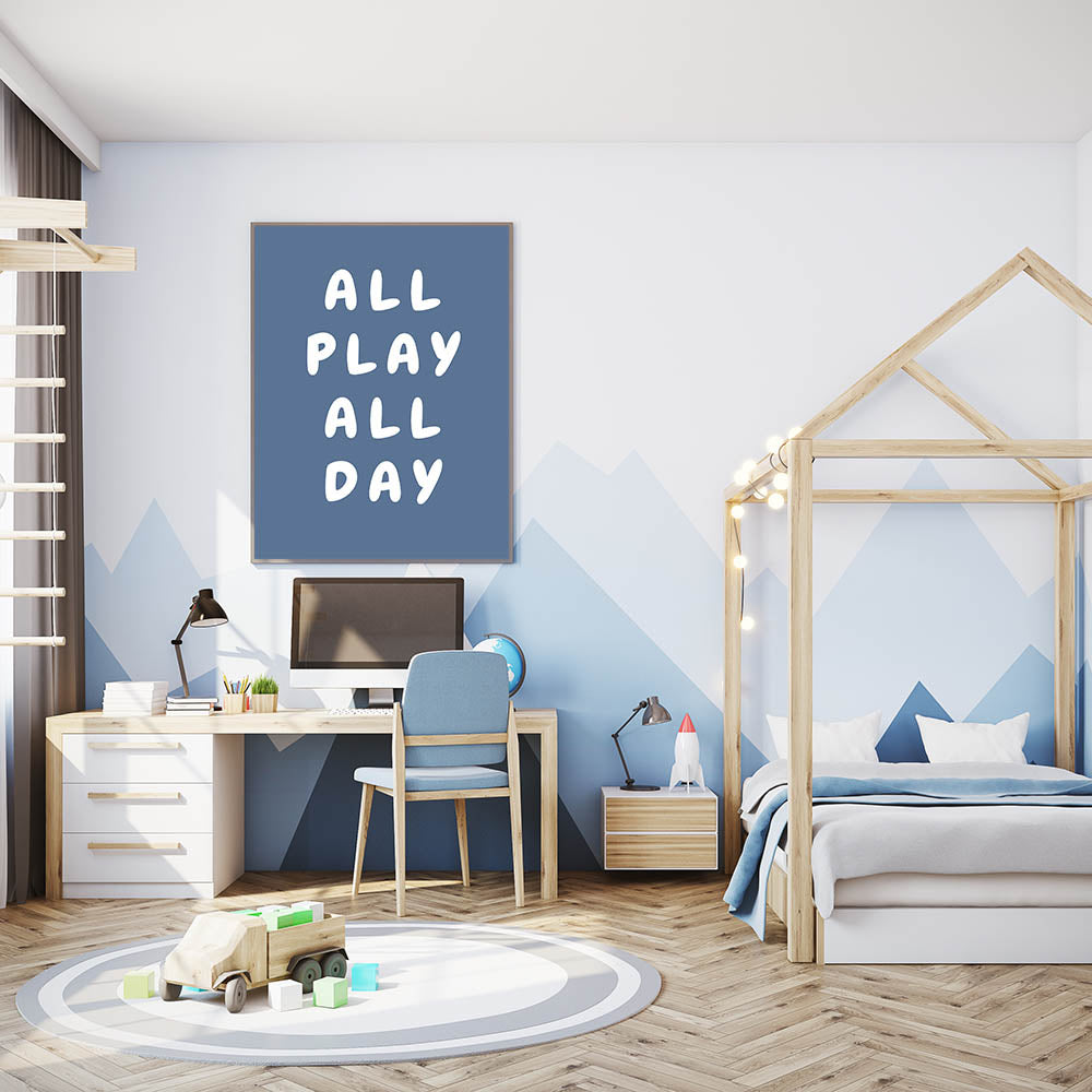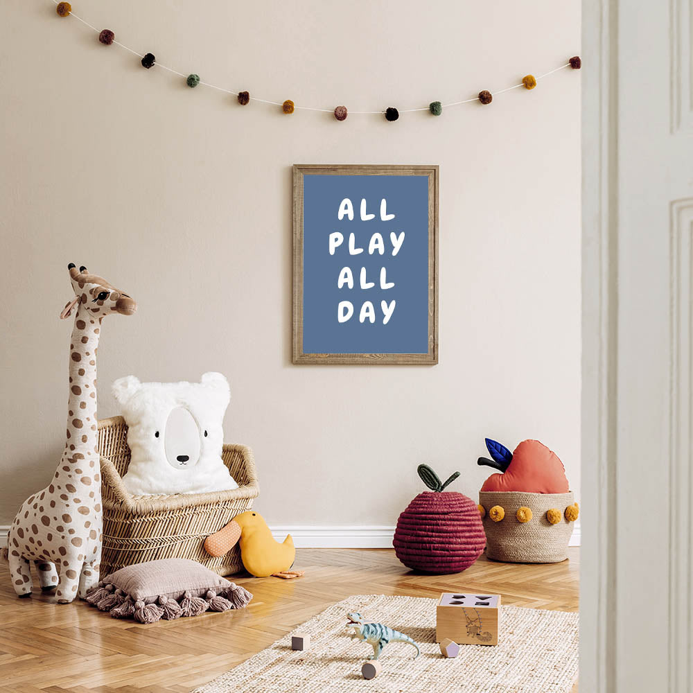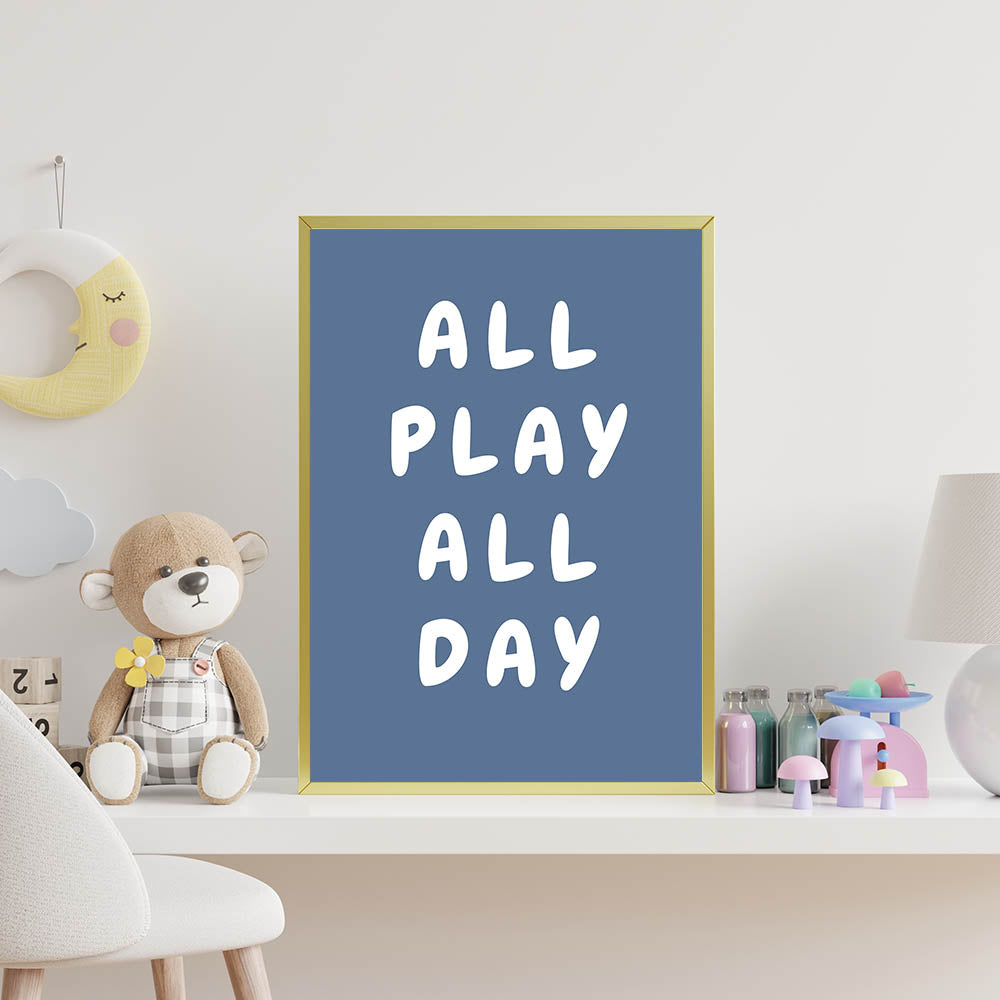 Inspire endless fun and creativity with this "All Play All Day" motivational boys room wall art. Designed with a bold navy blue background and playful white lettering, this artwork is perfect for adding energy and positivity to any child's space. Whether it's a boys' bedroom, playroom, or nursery, this stylish typography print encourages an active and adventurous mindset.