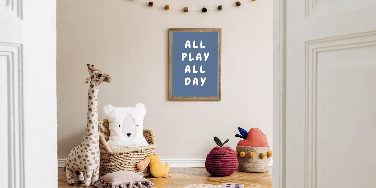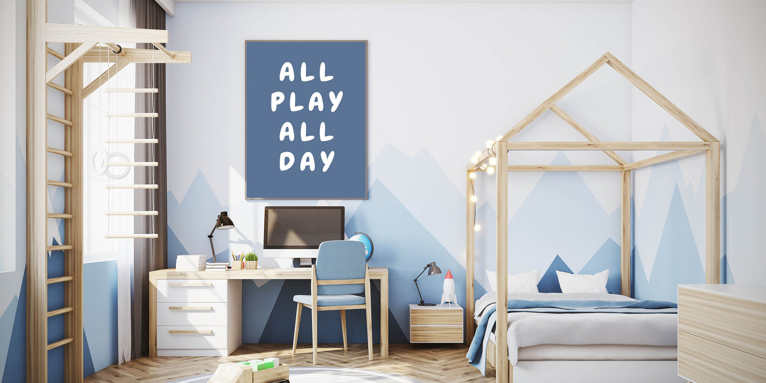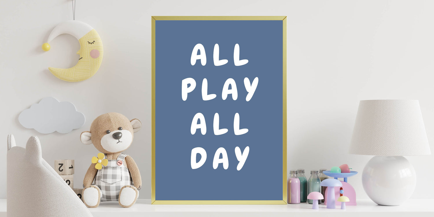 Inspire endless fun and creativity with this "All Play All Day" motivational boys room wall art. Designed with a bold navy blue background and playful white lettering, this artwork is perfect for adding energy and positivity to any child's space. Whether it's a boys' bedroom, playroom, or nursery, this stylish typography print encourages an active and adventurous mindset.