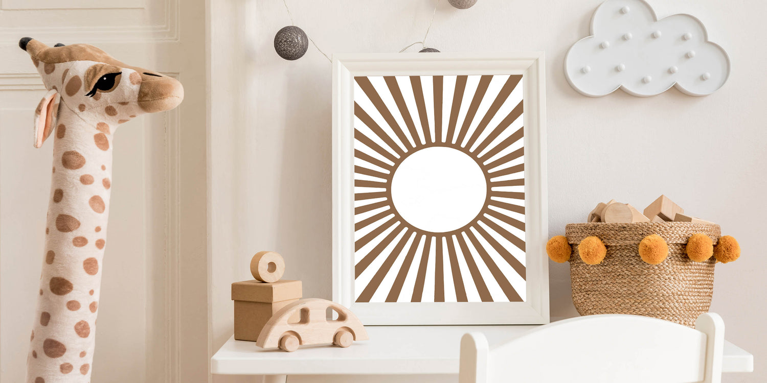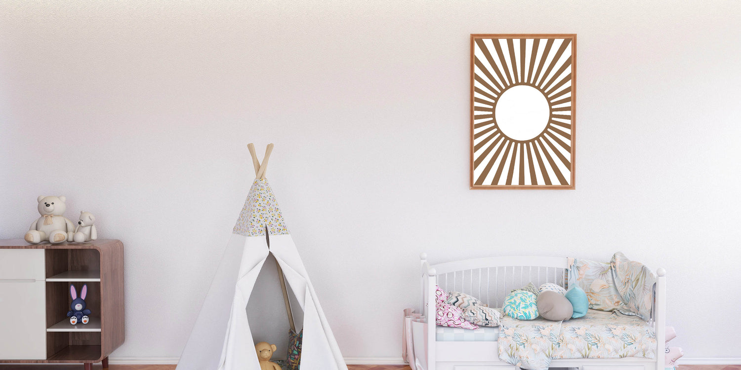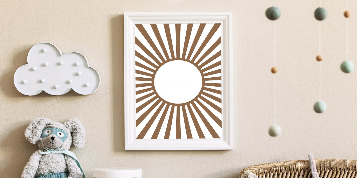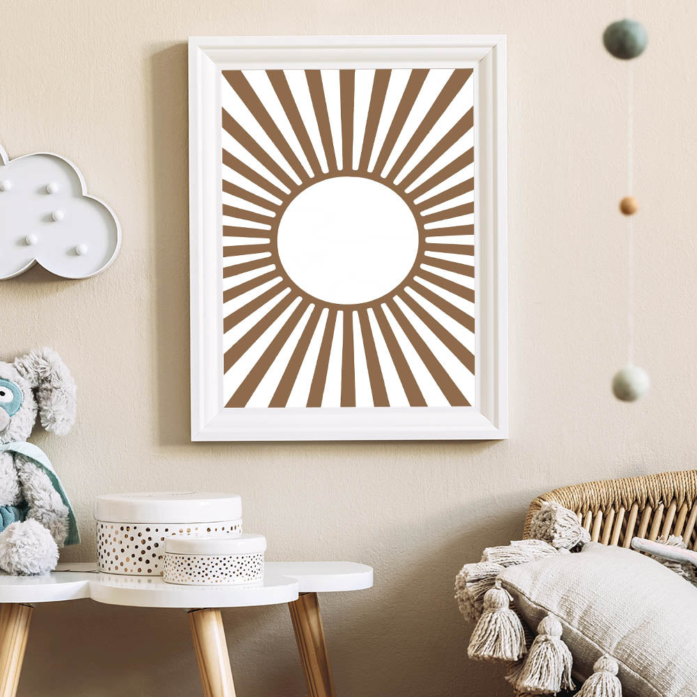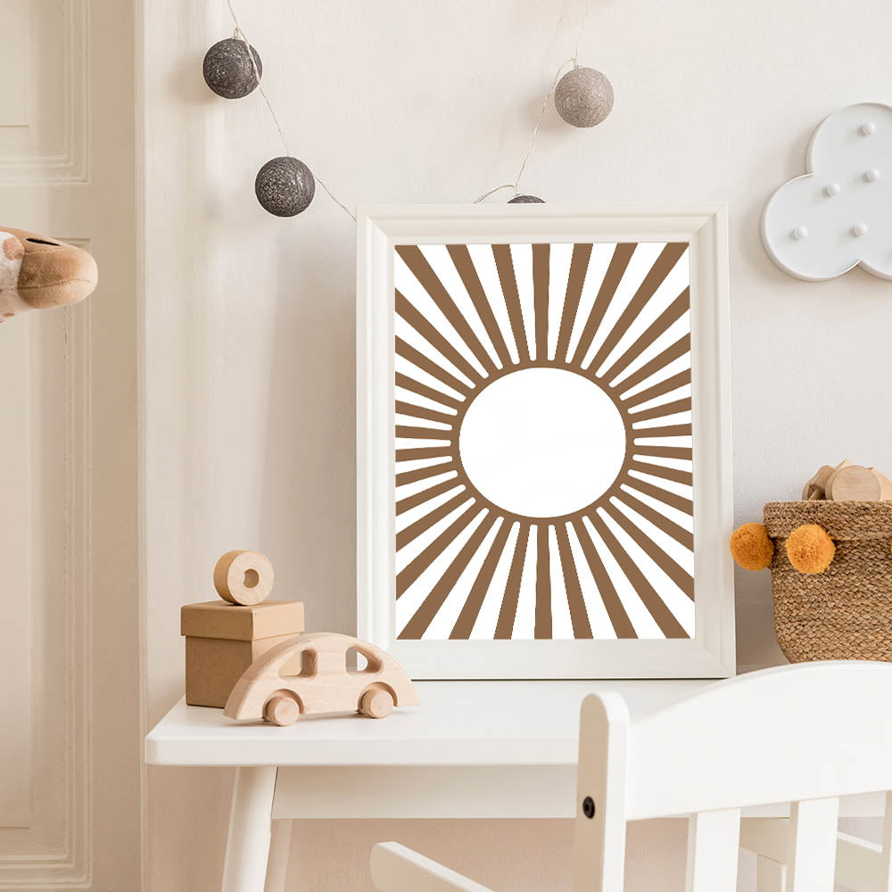 Bring warmth and positivity to your child’s space with this Boho Sunburst wall art, a stunning blend of modern simplicity and timeless charm. Featuring a radiating sun design in warm brown tones on a crisp white background, this piece adds a calming yet energetic touch to any boys' bedroom, playroom, or nursery. Ideal for boho, Scandinavian, or minimalist decor, this artwork is perfect for creating a stylish and inviting atmosphere.