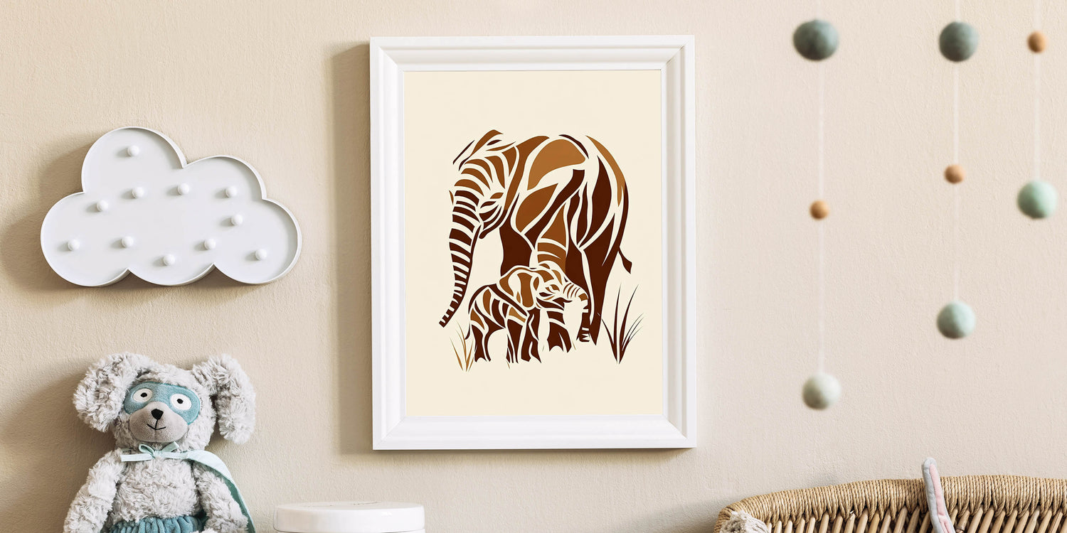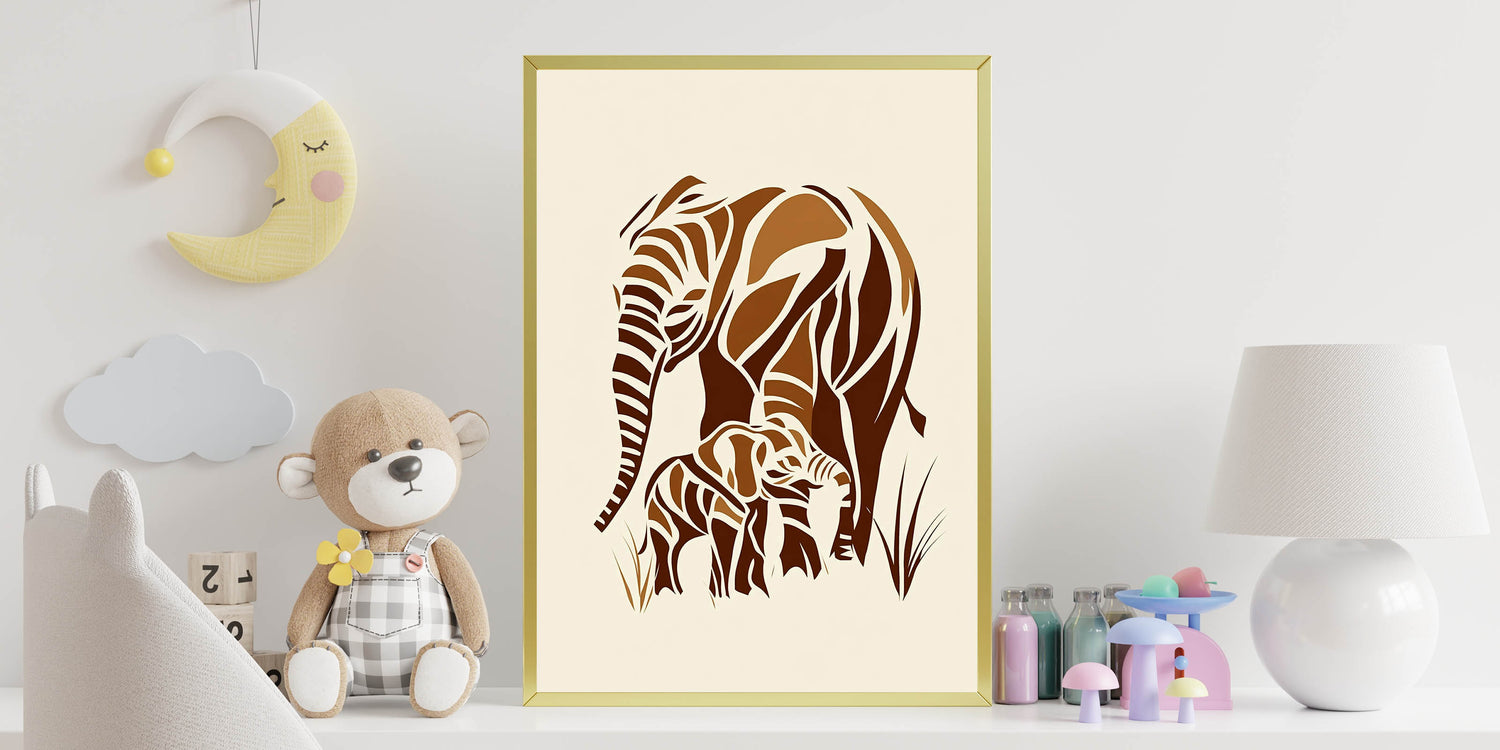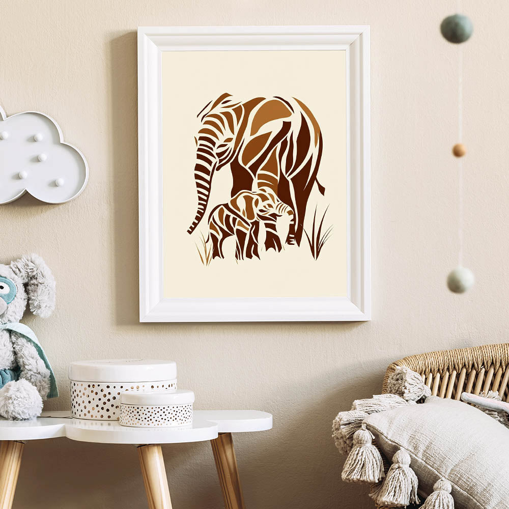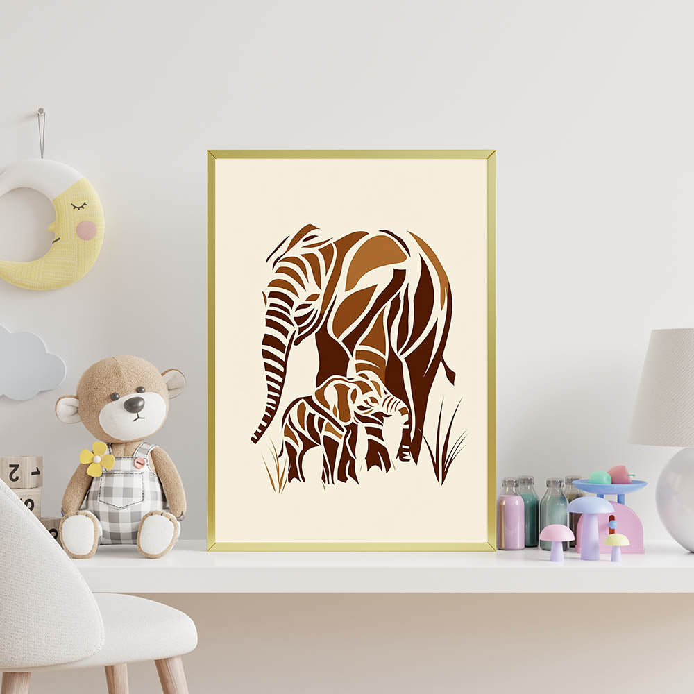 • Safari-Themed Artwork: A stylish and modern geometric depiction of a mother and baby elephant.
