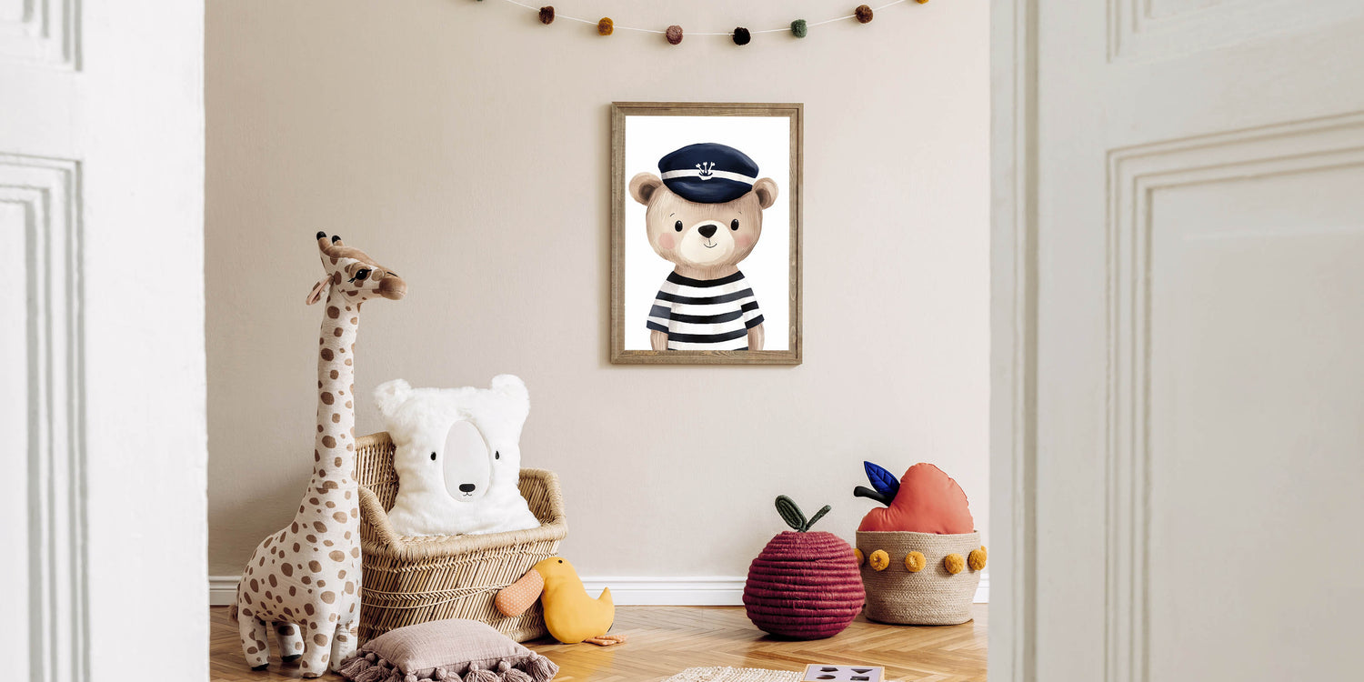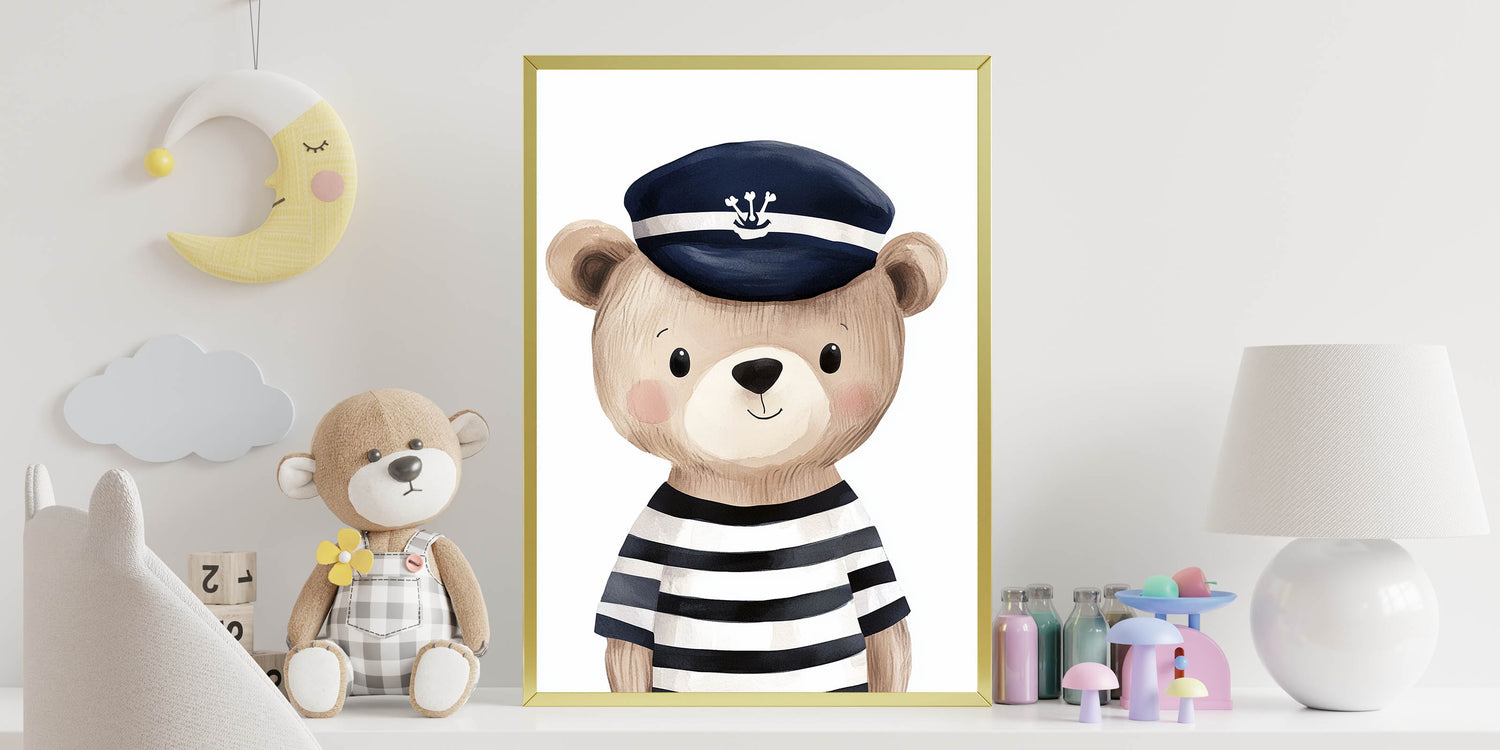Set sail on an adventure with this boys room wall art featuring an adorable bear dressed as a sailor. With its hand-painted watercolor style and classic navy and white striped outfit, this kids wall art print is a charming addition to nurseries, playrooms, and boys’ bedrooms. The nautical theme brings a sense of exploration and whimsy, making it perfect for a little explorer's space.