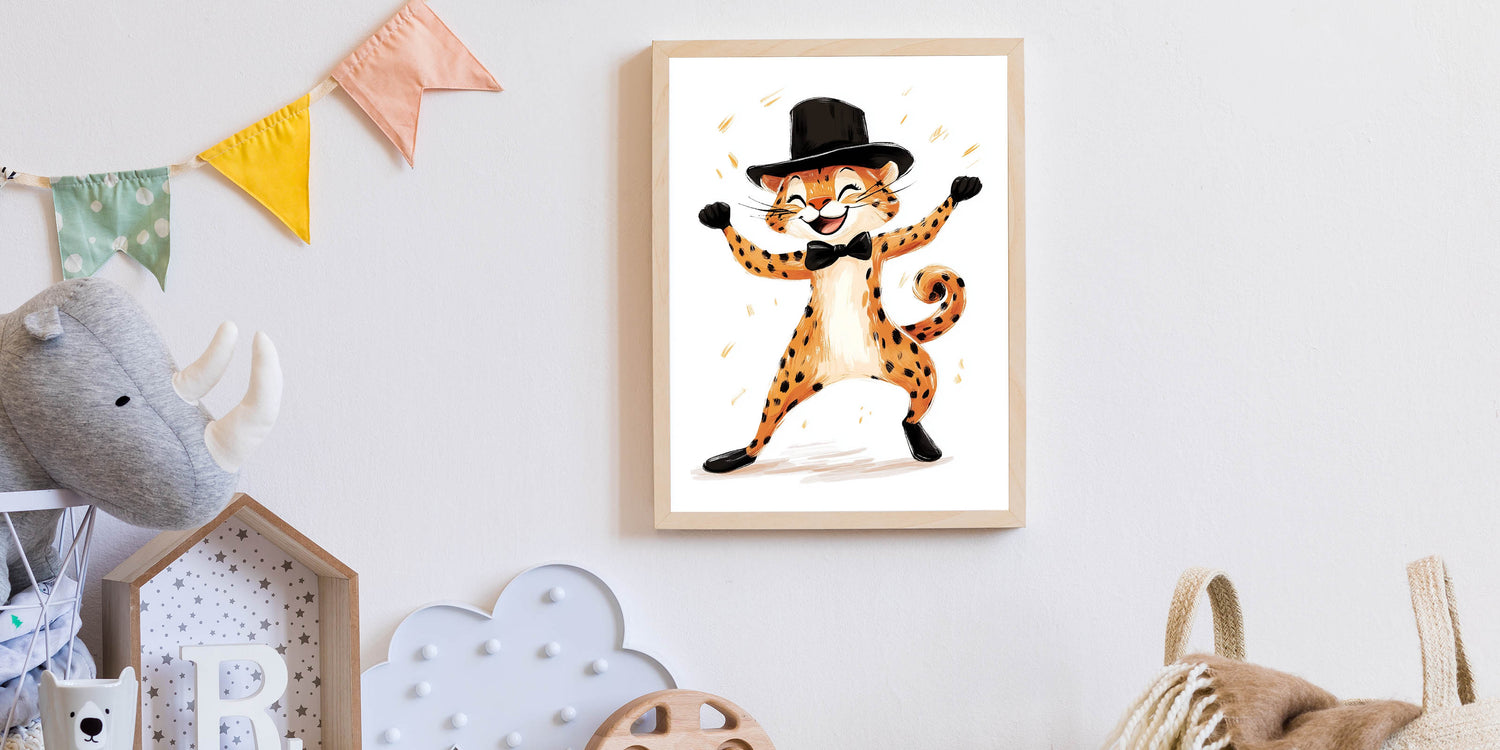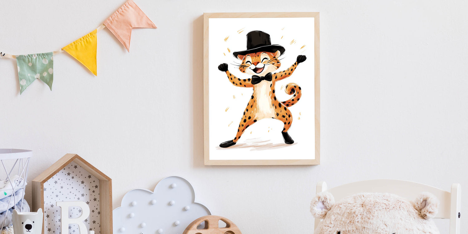 Add energy and charm to your child’s space with this boys wall art print featuring a lively cheetah dressed in a top hat and bowtie. This fun and whimsical illustration brings joy and movement, making it a perfect choice for kids wall art prints, boys’ bedroom art, or playroom wall art. The bright orange tones and playful expression make it a standout piece that adds excitement and personality to any child’s decor.